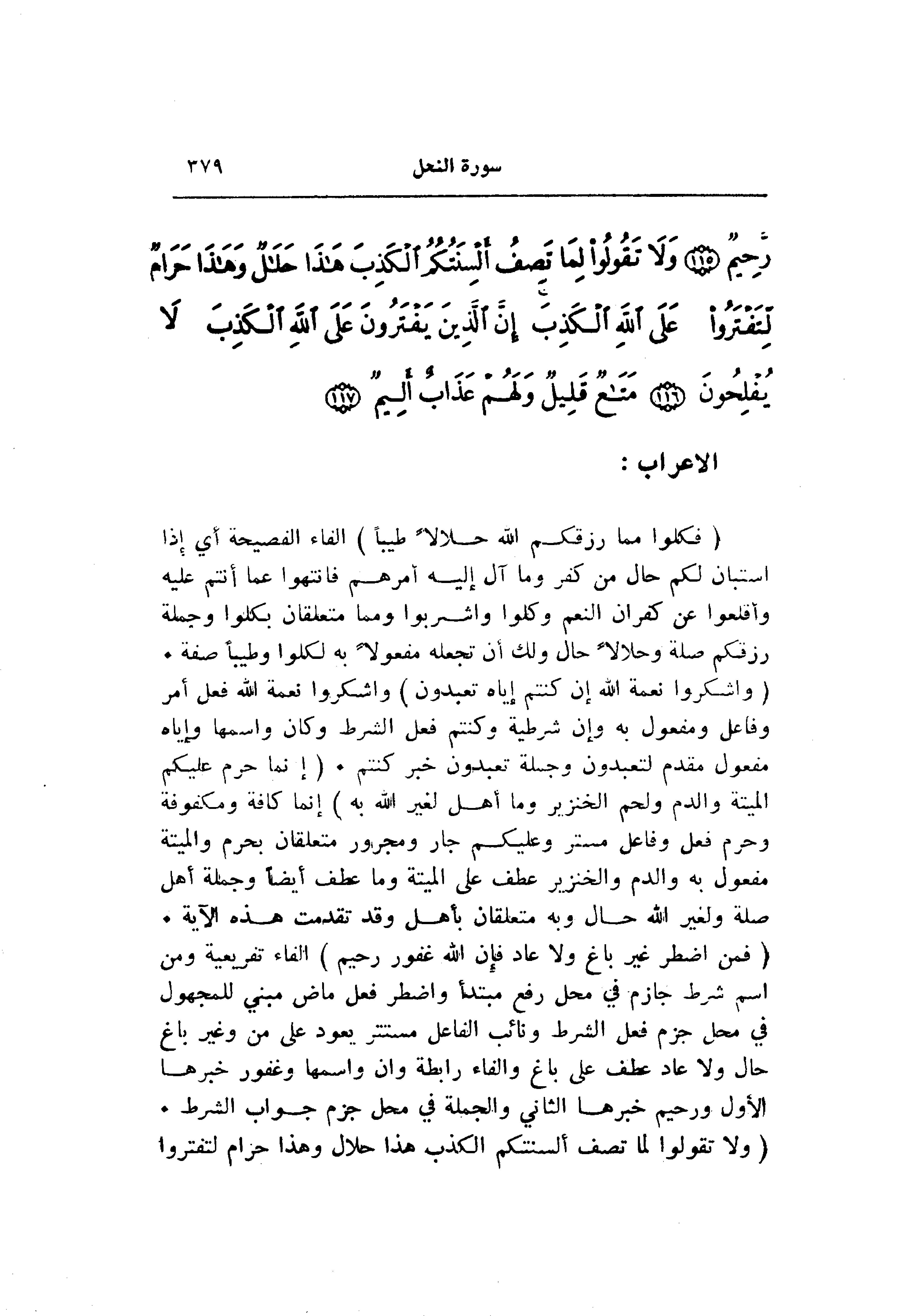 (وَاشْكُرُوا نِعْمَتَ اللَّهِ إِنْ كُنْتُمْ إِيَّاهُ تَعْبُدُونَ) واشكروا نعمة الله فعل أمر وفاعل ومفعول به وإن شرطية وكنتم فعل الشرط وكان واسمها وإياه مفعول مقدم لتعبدون وجملة تعبدون خبر كنتم. (إِنَّما حَرَّمَ عَلَيْكُمُ الْمَيْتَةَ وَالدَّمَ وَلَحْمَ الْخِنْزِيرِ وَما أُهِلَّ لِغَيْرِ اللَّهِ بِهِ) إنما كافة ومكفوفة وحرم فعل وفاعل مستتر وعليكم جار ومجرور متعلقان بحرم والميتة مفعول به والدم والخنزير عطف على الميتة وما عطف أيضا وجملة أهل صلة ولغير الله حال وبه متعلقان بأهل وقد تقدمت هذه الآية.