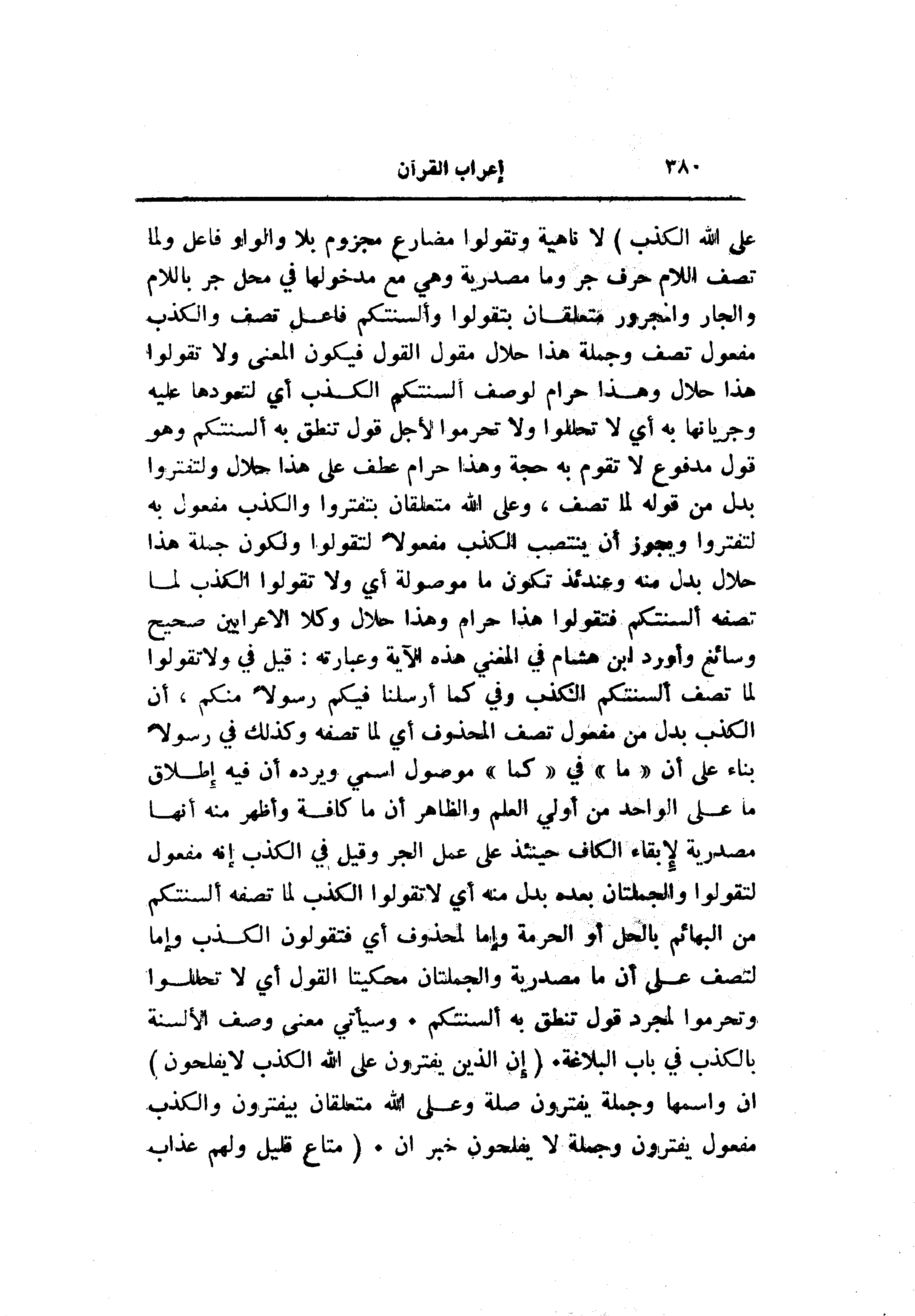 لا ناهية وتقولوا مضارع مجزوم بلا والواو فاعل ولما تصف اللام حرف جر وما مصدرية وهي مع مدخولها في محل جر باللام والجار والمجرور متعلقان بتقولوا وألسنتكم فاعل تصف والكذب مفعول تصف وجملة هذا حلال مقول القول فيكون المعنى ولا تقولوا هذا حلال وهذا حرام لوصف ألسنتكم الكذب أي لتعودها عليه وجريانها به أي لا تحللوا ولا تحرموا لأجل قول تنطق به ألسنتكم وهو قول مدفوع لا تقوم به حجة وهذا حرام عطف على هذا حلال ولتفتروا بدل من قوله لما تصف، وعلى الله متعلقان بتفتروا والكذب مفعول به لتفتروا ويجوز أن ينتصب الكذب مفعولا لتقولوا ولكون جملة هذا حلال بدل منه وعندئذ تكون ما موصولة أي ولا تقولوا الكذب لما تصفه ألسنتكم فتقولوا هذا حرام وهذا حلال وكلا الاعرابين صحيح وسائغ وأورد ابن هشام في المغني هذه الآية وعبارته: قيل في ولا تقولوا لما تصف ألسنتكم الكذب وفي كما أرسلنا فيكم رسولا منكم، أن الكذب بدل من مفعول تصف المحذوف أي لما تصفه وكذلك في رسولا بناء على أن «ما» في «كما» موصول اسمي ويرده أن فيه إطلاق ما على الواحد من أولي العلم والظاهر أن ما كافة وأظهر منه أنها مصدرية لإبقاء الكاف حينئذ على عمل الجر وقيل في الكذب إنه مفعول لتقولوا والجملتان بعده بدل منه أي لا تقولوا الكذب لما تصفه ألسنتكم من البهائم بالحل أو الحرمة وإما لمحذوف أي فتقولون الكذب وإما لنصف على أن ما مصدرية والجملتان محكيتا القول أي لا تحللوا وتحرموا لمجرد قول تنطق به ألسنتكم. وسيأتي معنى وصف الألسنة بالكذب في باب البلاغة. (إِنَّ الَّذِينَ يَفْتَرُونَ عَلَى اللَّهِ الْكَذِبَ لا يُفْلِحُونَ) ان واسمها وجملة يفترون صلة وعلى الله متعلقان بيفترون والكذب مفعول يفترون وجملة لا يفلحون خبر ان. (مَتاعٌ قَلِيلٌ وَلَهُمْ عَذابٌ