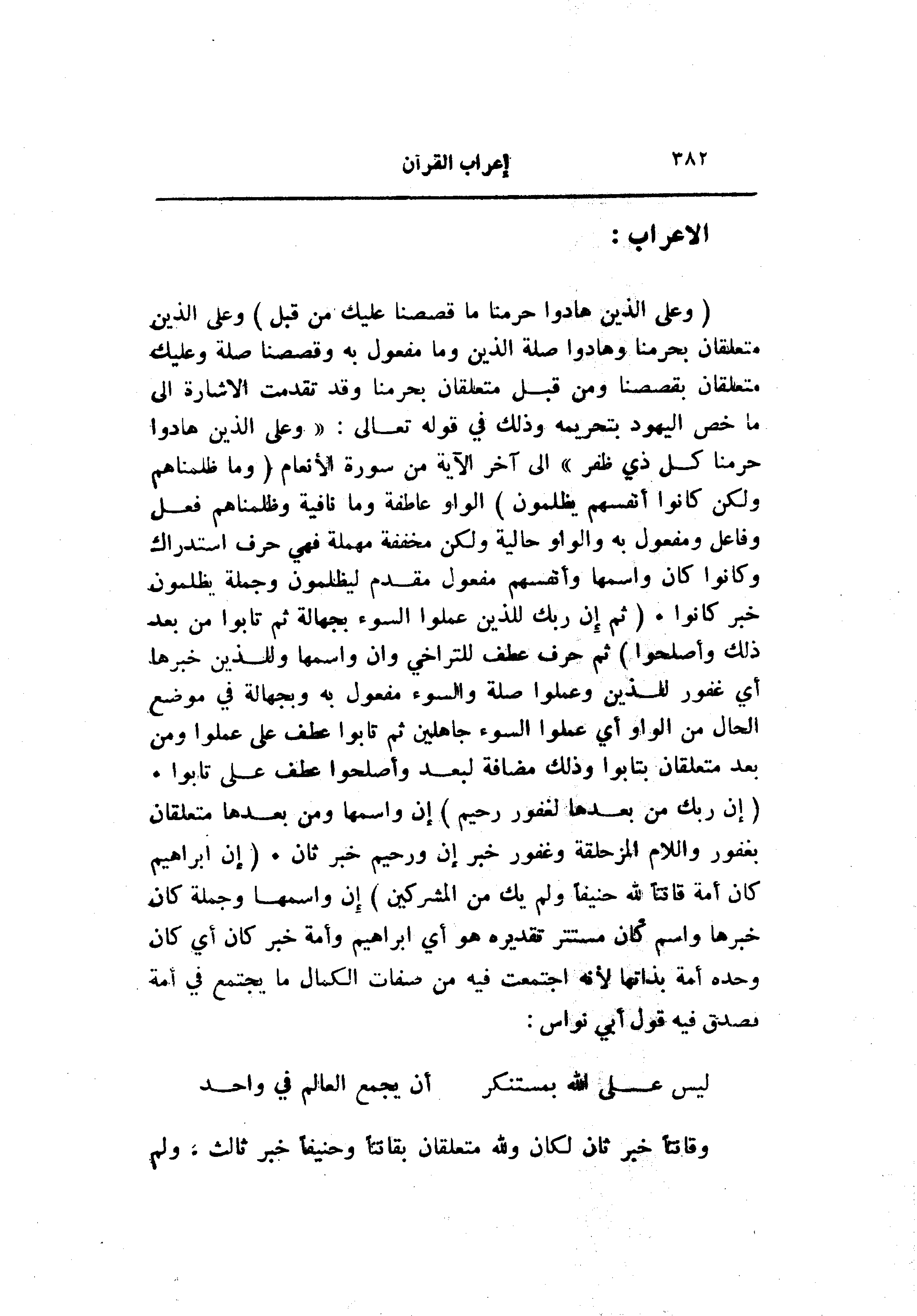 (إِنَّ رَبَّكَ مِنْ بَعْدِها لَغَفُورٌ رَحِيمٌ) إن واسمها ومن بعدها متعلقان بغفور واللام المزحلقة وغفور خبر إن ورحيم خبر ثان. (إِنَّ إِبْراهِيمَ كانَ أُمَّةً قانِتاً لِلَّهِ حَنِيفاً وَلَمْ يَكُ مِنَ الْمُشْرِكِينَ) إن واسمها وجملة كان خبرها واسم كان مستتر تقديره هو أي ابراهيم وأمة خبر كان أي كان وحده أمة بذاتها لأنه اجتمعت فيه من صفات الكمال ما يجتمع في أمة فصدق فيه قول أبي نواس: