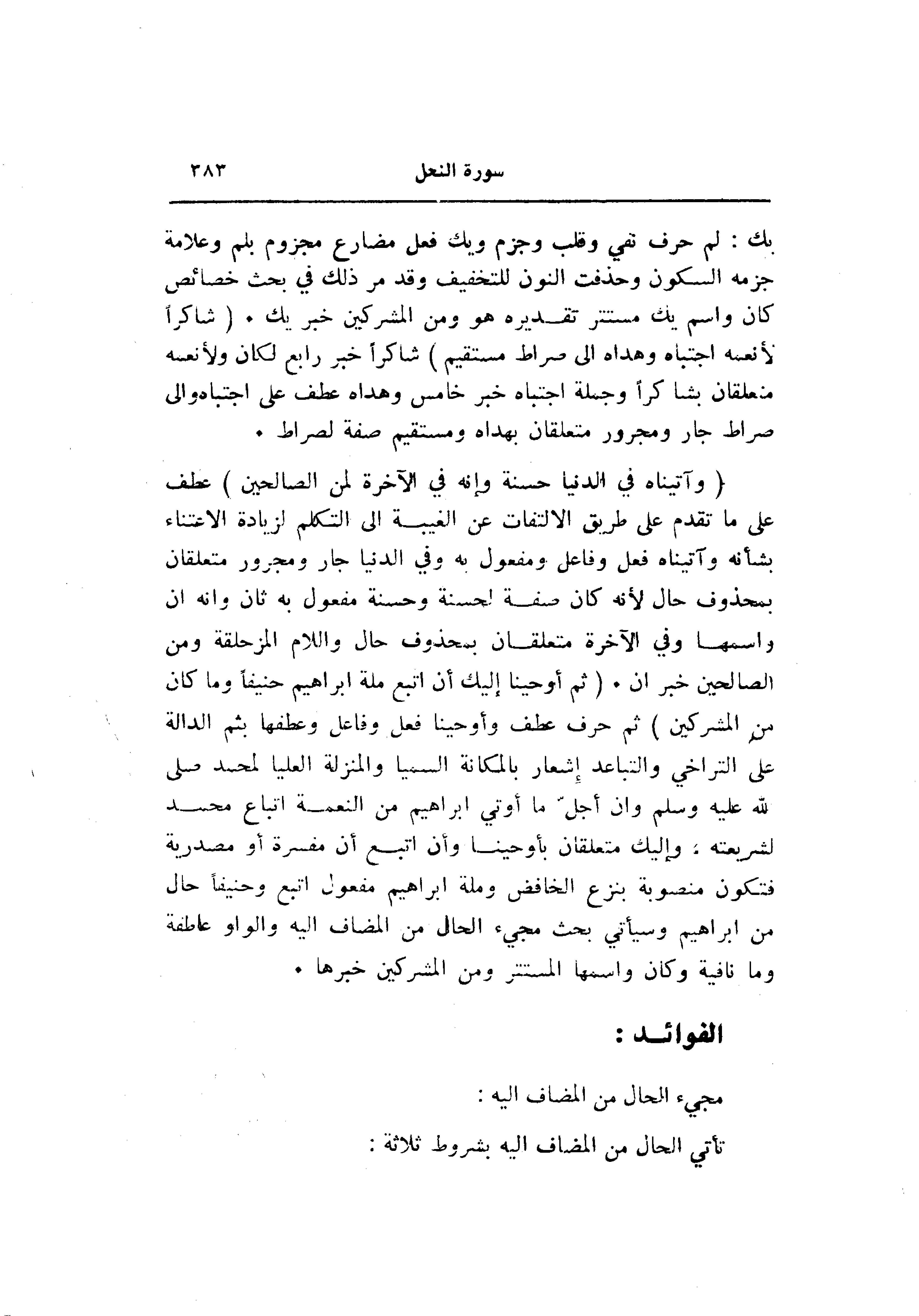 بك: لم حرف نفي وقلب وجزم ويك فعل مضارع مجزوم بلم وعلامة جزمه السكون وحذفت النون للتخفيف وقد مر ذلك في بحث خصائص كان واسم يك مستتر تقديره هو ومن المشركين خبر يك. (شاكِراً لِأَنْعُمِهِ اجْتَباهُ وَهَداهُ إِلى صِراطٍ مُسْتَقِيمٍ) شاكرا خبر رابع لكان ولأنعمه منعلقان بشاكرا وجملة اجتباه خبر خامس وهداه عطف على اجتباه والى صراط جار ومجرور متعلقان بهداه ومستقيم صفة لصراط.