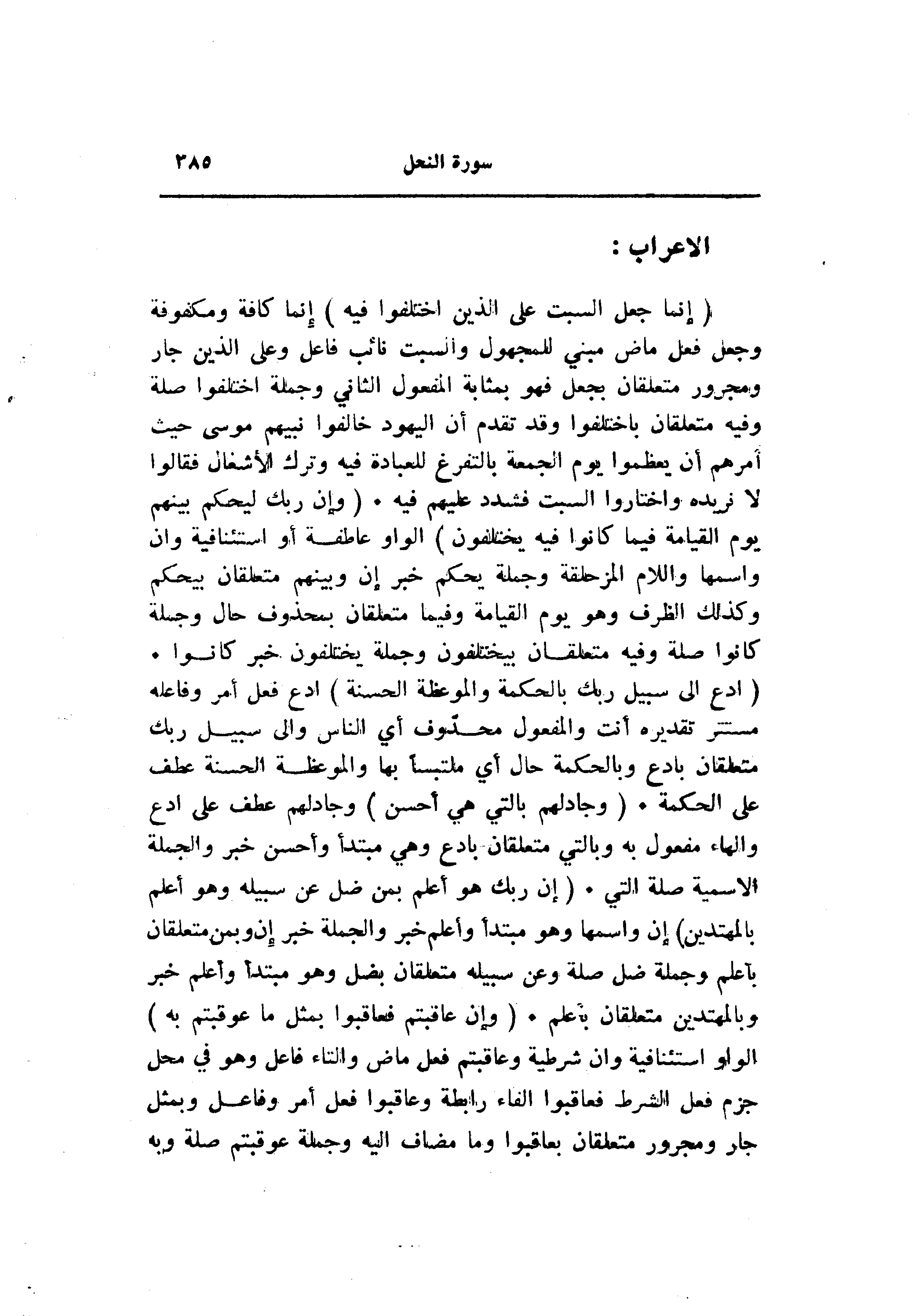 (إِنَّما جُعِلَ السَّبْتُ عَلَى الَّذِينَ اخْتَلَفُوا فِيهِ) إنما كافة ومكفوفة وجعل فعل ماض مبني للمجهول والسبت نائب فاعل وعلى الذين جار ومجرور متعلقان بجعل فهو بمثابة المفعول الثاني وجملة اختلفوا صلة وفيه متعلقان باختلفوا وقد تقدم أن اليهود خالفوا نبيهم موسى حيث أمرهم أن يعظموا يوم الجمعة بالتفرغ للعبادة فيه وترك الأشغال فقالوا لا نريده واختاروا السبت فشدد عليهم فيه. (وَإِنَّ رَبَّكَ لَيَحْكُمُ بَيْنَهُمْ يَوْمَ الْقِيامَةِ فِيما كانُوا فِيهِ يَخْتَلِفُونَ) الواو عاطفة أو استئنافية وان واسمها واللام المزحلقة وجملة يحكم خبر إن وبينهم متعلقان بيحكم وكذلك الظرف وهو يوم القيامة وفيما متعلقان بمحذوف حال وجملة كانوا صلة وفيه متعلقان بيختلفون وجملة يختلفون خبر كانوا.