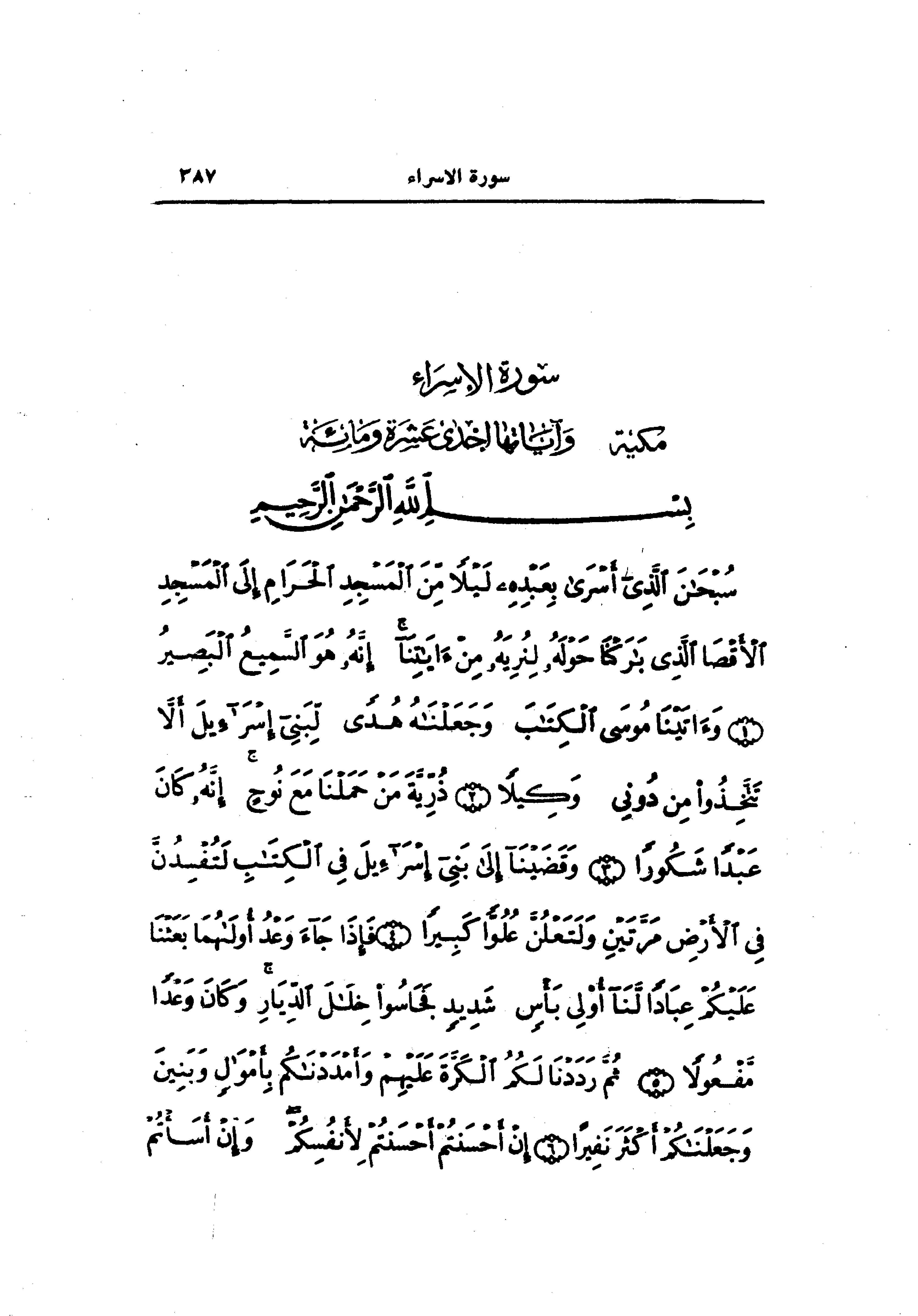 (17) سورة الإسراء مكية وآياتها إحدى عشرة ومائة