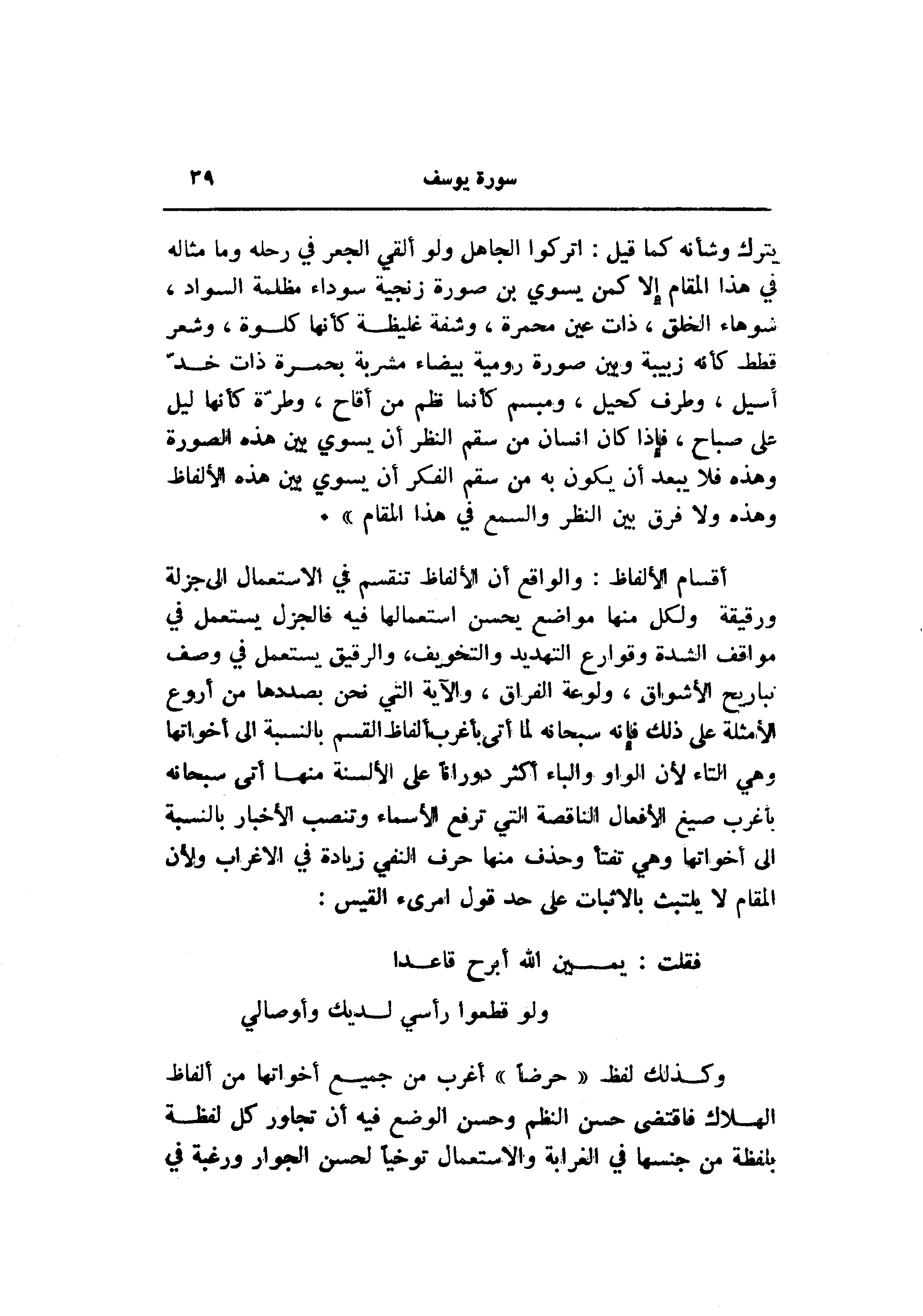 يترك وشأنه كما قيل: اتركوا الجاهل ولو ألقي الجعر في رحله وما مثاله في هذا المقام إلا كمن يسوي بن صورة زنجية سوداء مظلمة السواد، سوهاء الخلق، ذات عين محمرة، وشفة غليظة كأنها كلوة، وشعر قطط كأنه زبيبة وبين صورة رومية بيضاء مشربة بحمرة ذات خدّ أسيل، وطرف كحيل، ومبسم كأنما نظم من أقاح، وطرّة كأنها ليل على صباح، فإذا كان انسان من سقم النظر أن يسوي بين هذه الصورة وهذه فلا يبعد أن يكون به من سقم الفكر أن يسوي بين هذه الألفاظ وهذه ولا فرق بين النظر والسمع في هذا المقام» .