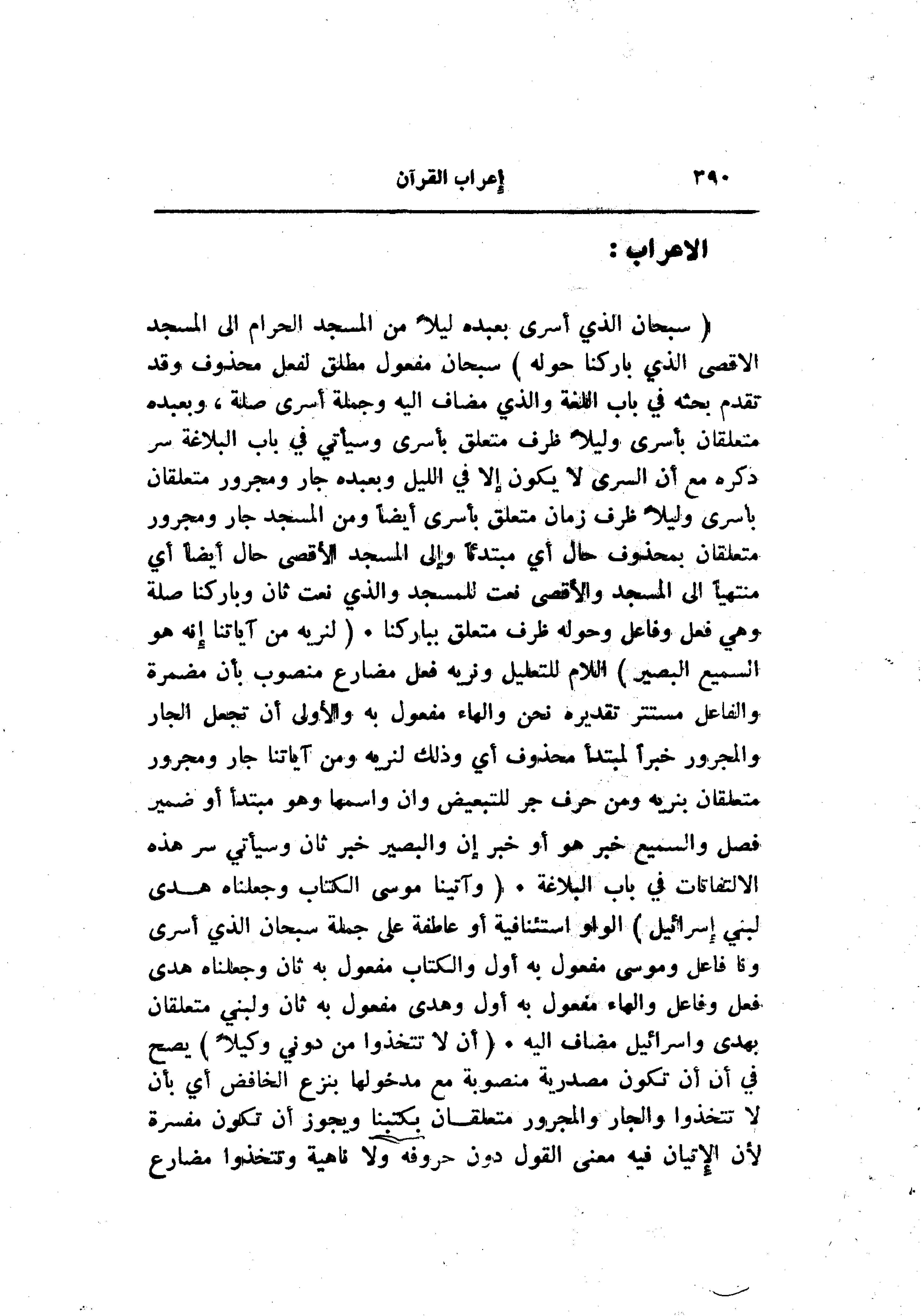 (سُبْحانَ الَّذِي أَسْرى بِعَبْدِهِ لَيْلًا مِنَ الْمَسْجِدِ الْحَرامِ إِلَى الْمَسْجِدِ الْأَقْصَى الَّذِي بارَكْنا حَوْلَهُ) سبحان مفعول مطلق لفعل محذوف وقد تقدم بحثه في باب اللغة والذي مضاف اليه وجملة أسرى صلة، وبعبده متعلقان بأسرى وليلا ظرف متعلق بأسرى وسيأتي في باب البلاغة سر ذكره مع أن السرى لا يكون إلا في الليل وبعبده جار ومجرور متعلقان بأسرى وليلا ظرف زمان متعلق بأسرى أيضا ومن المسجد جار ومجرور متعلقان بمحذوف حال أي مبتدئا وإلى المسجد الأقصى حال أيضا أي منتهيا الى المسجد والأقصى نعت للمسجد والذي نعت ثان وباركنا صلة وهي فعل وفاعل وحوله ظرف متعلق بباركنا. (لِنُرِيَهُ مِنْ آياتِنا إِنَّهُ هُوَ السَّمِيعُ الْبَصِيرُ) اللام للتعليل ونريه فعل مضارع منصوب بأن مضمرة والفاعل مستتر تقديره نحن والهاء مفعول به والأولى أن تجعل الجار والمجرور خبرا لمبتدأ محذوف أي وذلك لنريه ومن آياتنا جار ومجرور متعلقان بنريه ومن حرف جر للتبعيض وان واسمها وهو مبتدأ أو ضمير فصل والسميع خبر هو أو خبر إن والبصير خبر ثان وسيأتي سر هذه الالتفاتات في باب البلاغة. (وَآتَيْنا مُوسَى الْكِتابَ وَجَعَلْناهُ هُدىً لِبَنِي إِسْرائِيلَ) الواو استئنافية أو عاطفة على جملة سبحان الذي أسرى ونا فاعل وموسى مفعول به أول والكتاب مفعول به ثان وجعلناه هدى فعل وفاعل والهاء مفعول به أول وهدى مفعول به ثان ولبني متعلقان بهدى وإسرائيل مضاف اليه. (أَلَّا تَتَّخِذُوا مِنْ دُونِي وَكِيلًا) يصح في أن أن تكون مصدرية منصوبة مع مدخولها بنزع الخافض أي بأن لا تتخذوا والجار والمجرور متعلقان بكتبنا ويجوز أن تكون مفسرة لأن الإتيان فيه معنى القول دون حروفه ولا ناهية وتتخذوا مضارع