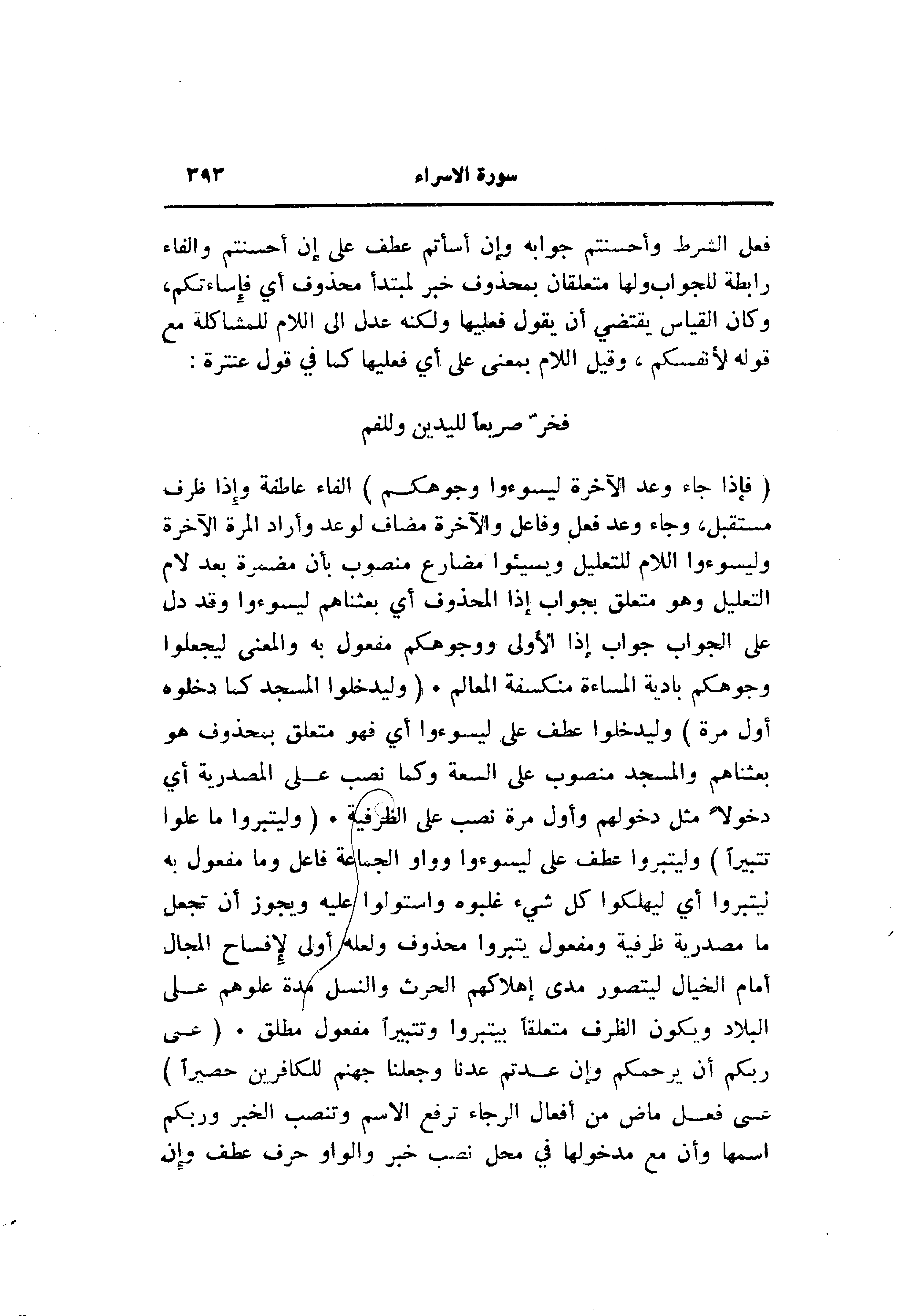 (فَإِذا جاءَ وَعْدُ الْآخِرَةِ لِيَسُوؤُا وُجُوهَكُمْ) الفاء عاطفة وإذا ظرف مستقبل، وجاء وعد فعل وفاعل والآخرة مضاف لوعد وأراد المرة الآخرة وليسوءوا اللام للتعليل ويسيئوا مضارع منصوب بأن مضمرة بعد لام التعليل وهو متعلق بجواب إذا المحذوف أي بعثناهم ليسوءوا وقد دل على الجواب جواب إذا الأولى ووجوهكم مفعول به والمعنى ليجعلوا وجوهكم بادية المساءة منكسفة المعالم. (وَلِيَدْخُلُوا الْمَسْجِدَ كَما دَخَلُوهُ أَوَّلَ مَرَّةٍ) وليدخلوا عطف على ليسوءوا أي فهو متعلق بمحذوف هو بعثناهم والمسجد منصوب على السعة وكما نصب على المصدرية أي دخولا مثل دخولهم وأول مرة نصب على الظرفية. (وَلِيُتَبِّرُوا ما عَلَوْا تَتْبِيراً) وليتبروا عطف على ليسوءوا وواو الجماعة فاعل وما مفعول به ليتبروا أي ليهلكوا كل شيء غلبوه واستولوا عليه ويجوز أن تجعل ما مصدرية ظرفية ومفعول يتبروا محذوف ولعله أولى لإفساح المجال أمام الخيال ليتصور مدى إهلاكهم الحرث والنسل مدة علوهم على البلاد ويكون الظرف متعلقا بيتبروا وتتبيرا مفعول مطلق. (عَسى رَبُّكُمْ أَنْ يَرْحَمَكُمْ وَإِنْ عُدْتُمْ عُدْنا وَجَعَلْنا جَهَنَّمَ لِلْكافِرِينَ حَصِيراً) عسى فعل ماض من أفعال الرجاء ترفع الاسم وتنصب الخبر وربكم اسمها وأن مع مدخولها في محل نصب خبر والواو حرف عطف وإن
