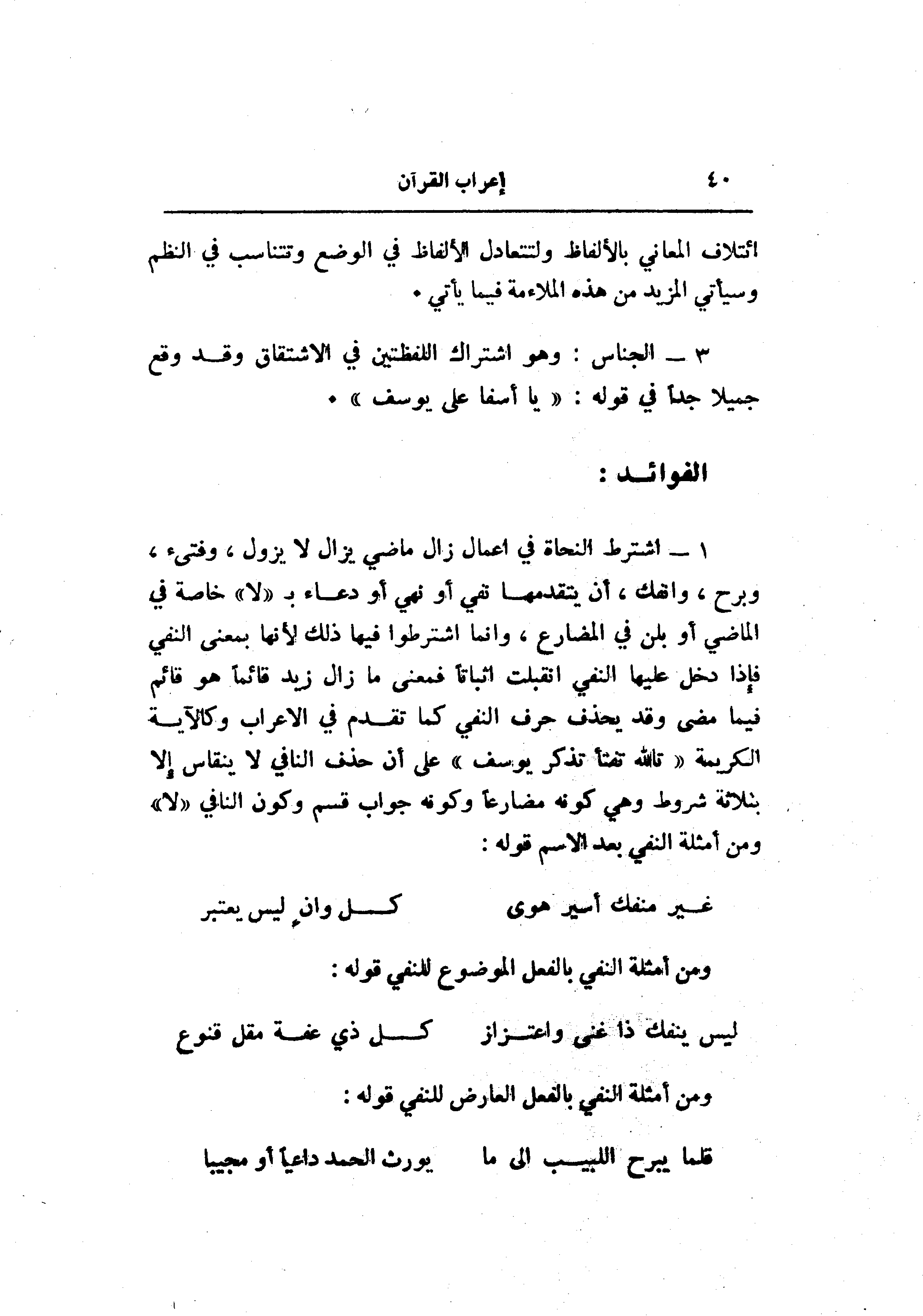 أن يتقدمها نفي أو نهي أو دعاء ب «لا» خاصة في الماضي أو بلن في المضارع، وانما اشترطوا فيها ذلك لأنها بمعنى النفي فإذا دخل عليها النفي انقلبت اثباتا فمعنى ما زال زيد قائما هو قائم فيما مضى وقد يحذف حرف النفي كما تقدم في الاعراب وكالآية الكريمة «تالله تفتأ تذكر يوسف» على أن حذف النافي لا ينقاس إلا بثلاثة شروط وهي كونه مضارعا وكونه جواب قسم وكون النافي «لا» ومن أمثلة النفي بعد الاسم قوله: