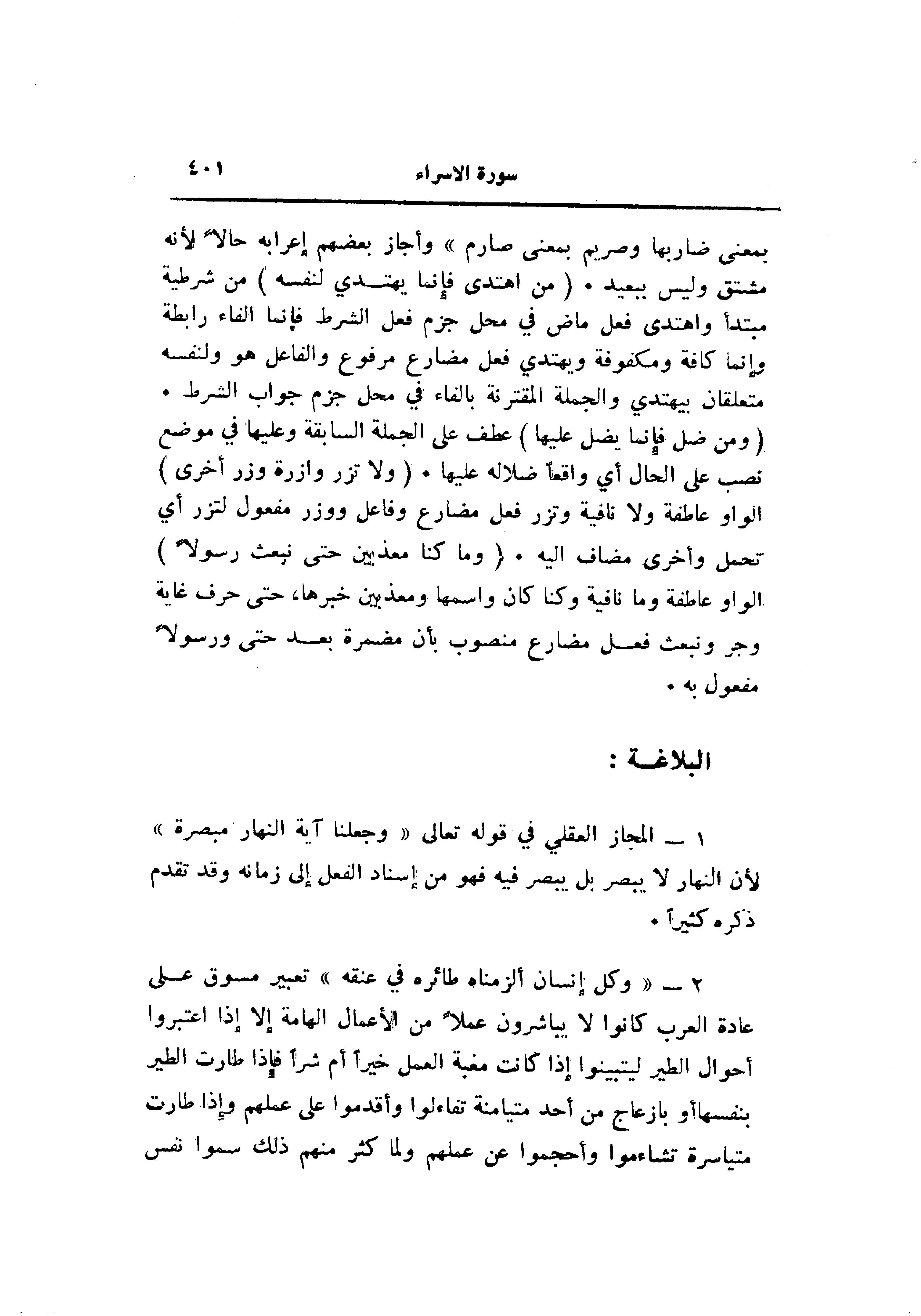 1- المجاز العقلي في قوله تعالى «وجعلنا آية النهار مبصرة» لأن النهار لا يبصر بل يبصر فيه فهو من إسناد الفعل إلى زمانه وقد تقدم ذكره كثيرا.