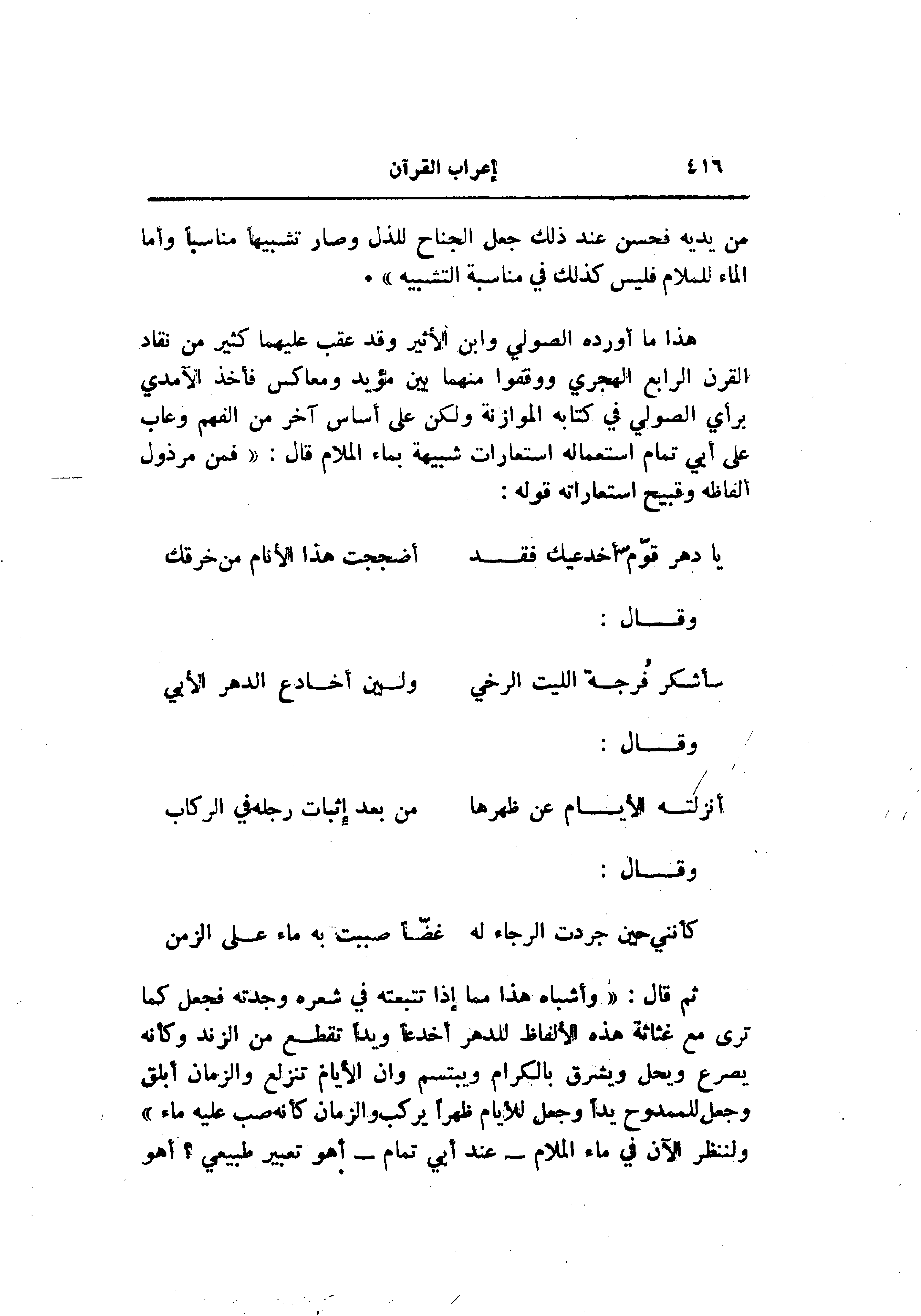 ثم قال: «وأشباه هذا مما إذا تتبعته في شعره وجدته فجعل كما ترى مع غثاثة هذه الألفاظ للدهر أخدعا ويدا تقطع من الزند وكأنه يصرع ويحل ويشرق بالكرام ويبتسم وان الأيام تنزلع والزمان أبلق وجعل للممدوح يدا وجعل للأيام ظهرا يركب والزمان كأنه صب عليه ماء» ولننظر الآن في ماء الملام- عند أبي تمام- أهو تعبير طبيعي؟ أهو