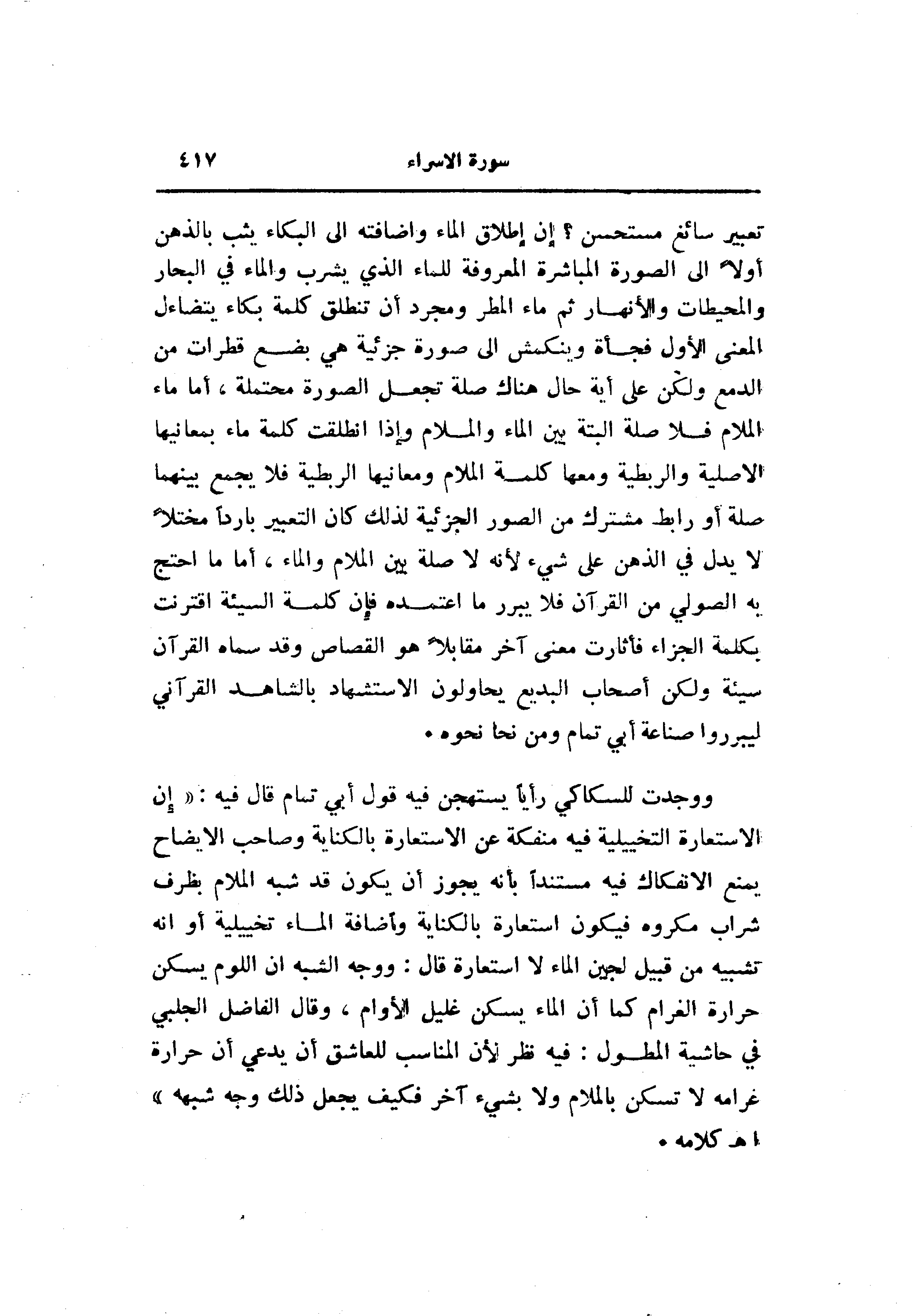 ووجدت للسكاكي رأيا يستهجن فيه قول أبي تمام قال فيه: «إن الاستعارة التخييلية فيه منفكة عن الاستعارة بالكناية وصاحب الإيضاح يمنع الانفكاك فيه مستندا بأنه يجوز أن يكون قد شبه الملام بظرف شراب مكروه فيكون استعارة بالكناية واضافة الماء تخييلية أو انه تشبيه من قبيل لجين الماء لا استعارة قال: ووجه الشبه ان اللوم يسكن حرارة الغرام كما أن الماء يسكن غليل الأوام، وقال الفاضل الجلبي في حاشية المطول: فيه نظر لأن المناسب للعاشق أن يدعي أن حرارة غرامه لا تسكن بالملام ولا بشيء آخر فكيف يجعل ذلك وجه شبهه» اهـ كلامه.