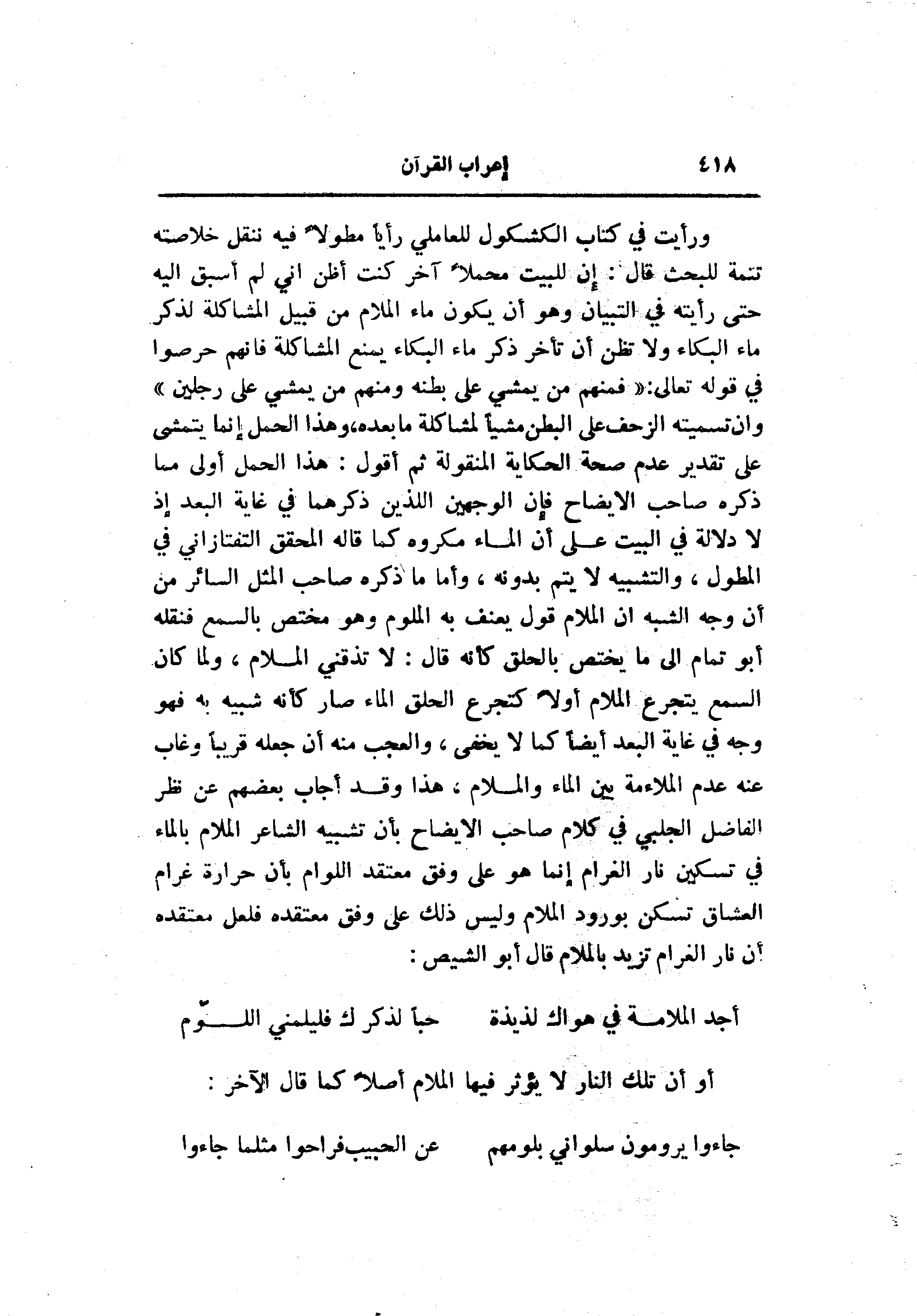 ورأيت في كتاب الكشكول للعاملي رأيا مطولا فيه ننقل خلاصته تتمة للبحث قال: إن للبيت محملا آخر كنت أظن اني لم أسبق اليه حتى رأيته في التبيان وهو أن يكون ماء الملام من قبيل المشاكلة لذكر ماء البكاء ولا تظن أن تأخر ذكر ماء البكاء يمنع المشاكلة فانهم حرصوا في قوله تعالى: «فمنهم من يمشي على بطنه ومنهم من يمشي على رجلين» وان تسميته الزحف على البطن مشيا لمشاكلة ما بعده، وهذا الحمل إنما يتمشى على تقدير عدم صحة الحكاية المنقولة ثم أقول: هذا الحمل أولى مما ذكره صاحب الإيضاح فإن الوجهين اللذين ذكرهما في غاية البعد إذ لا دلالة في البيت على أن الماء مكروه كما قاله المحقق التفتازاني في المطول، والتشبيه لا يتم بدونه، وأما ما ذكره صاحب المثل السائر من أن وجه الشبه ان الملام قول يعنف به الملوم وهو مختص بالسمع فنقله أبو تمام الى ما يختص بالحلق كأنه قال: لا تذقني الملام، ولما كان السمع يتجرع الملام أولا كتجرع الحلق الماء صار كأنه شبيه به فهو وجه في غاية البعد أيضا كما لا يخفى، والعجب منه أن جعله قريبا وغاب عنه عدم الملاءمة بين الماء والملام، هذا وقد أجاب بعضهم عن نظر الفاضل الجلبي في كلام صاحب الإيضاح بأن تشبيه الشاعر الملام بالماء في تسكين نار الغرام إنما هو على وفق معتقد اللوام بأن حرارة غرام العشاق تسكن بورود الملام وليس ذلك على وفق معتقده فلعل معتقده أن نار الغرام تزيد بالملام قال أبو الشيص: