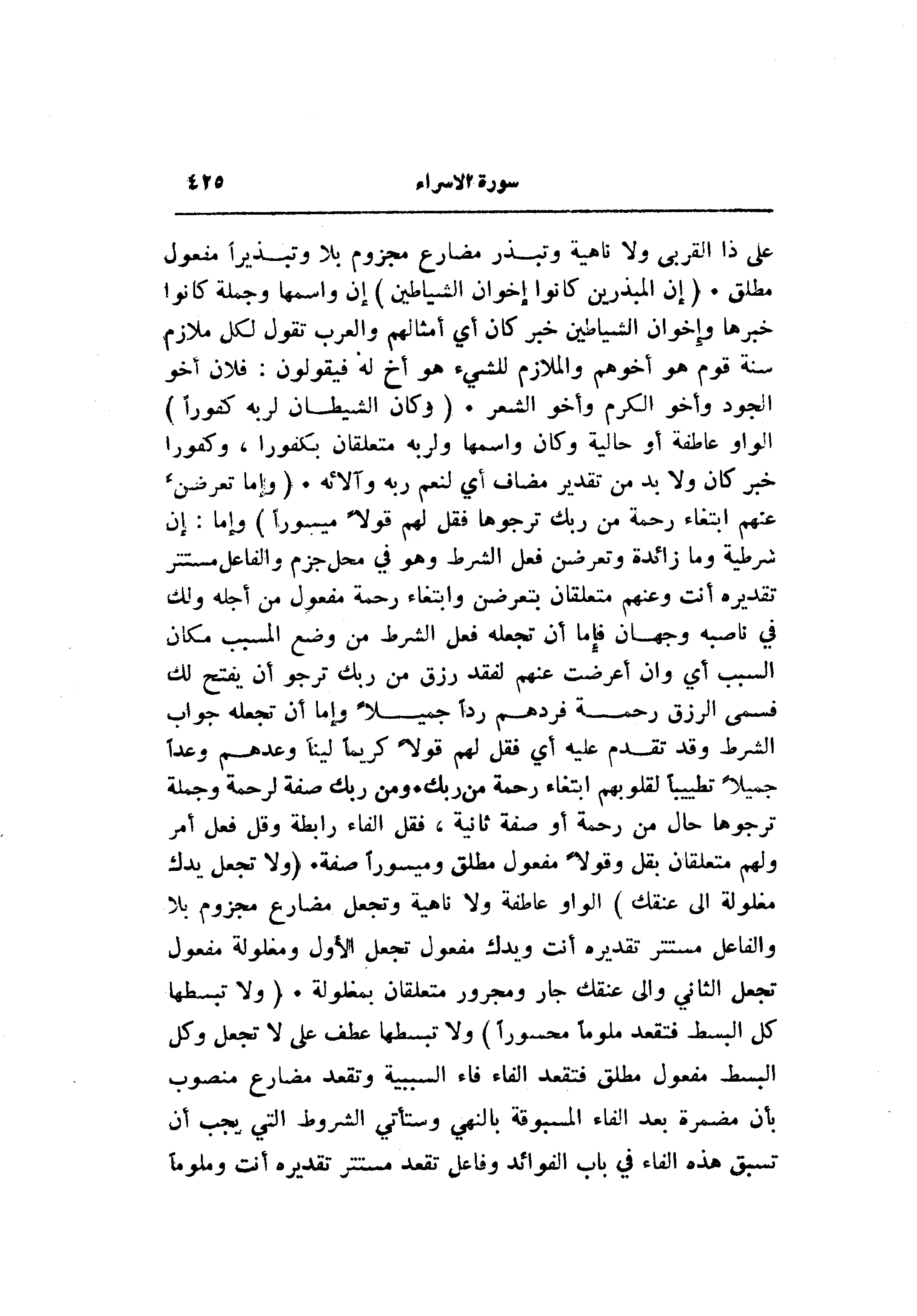 على ذا القربى ولا ناهية وتبذر مضارع مجزوم بلا وتبذيرا مفعول مطلق. (إِنَّ الْمُبَذِّرِينَ كانُوا إِخْوانَ الشَّياطِينِ) إن واسمها وجملة كانوا خبرها وإخوان الشياطين خبر كان أي أمثالهم والعرب تقول لكل ملازم سنة قوم هو أخوهم والملازم للشيء هو أخ له فيقولون: فلان أخو الجود وأخو الكرم وأخو الشعر. (وَكانَ الشَّيْطانُ لِرَبِّهِ كَفُوراً) الواو عاطفة أو حالية وكان واسمها ولربه متعلقان بكفورا، وكفورا خبر كان ولا بد من تقدير مضاف أي لنعم ربه وآلائه. (وَإِمَّا تُعْرِضَنَّ عَنْهُمُ ابْتِغاءَ رَحْمَةٍ مِنْ رَبِّكَ تَرْجُوها فَقُلْ لَهُمْ قَوْلًا مَيْسُوراً)