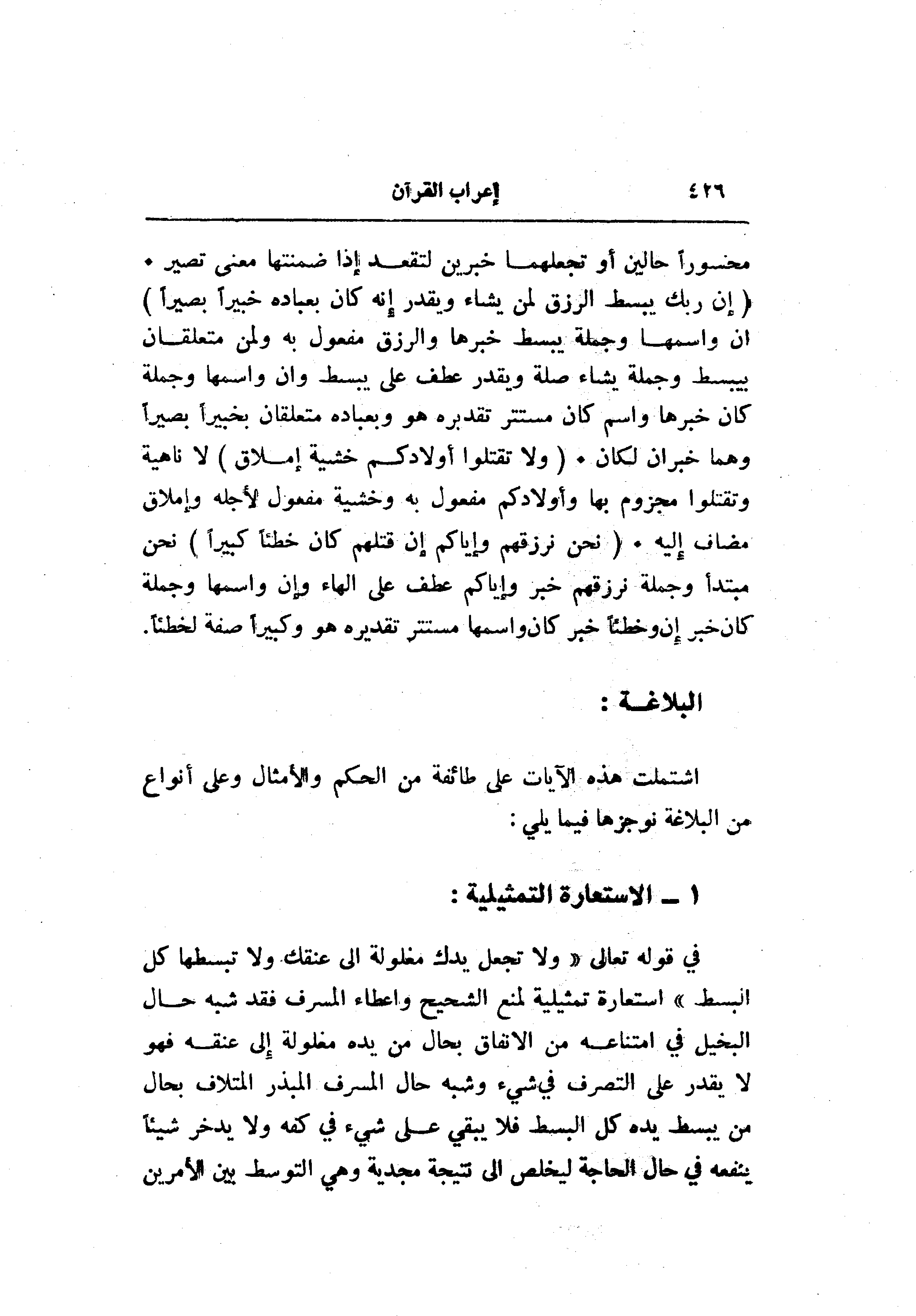 في قوله تعالى «ولا تجعل يدك مغلولة الى عنقك ولا تبسطها كل البسط» استعارة تمثيلية لمنع الشحيح وإعطاء المسرف فقد شبه حال البخيل في امتناعه من الانفاق بحال من يده مغلولة إلى عنقه فهو لا يقدر على التصرف في شيء وشبه حال المسرف المبذر المتلاف بحال من يبسط يده كل البسط فلا يبقي على شيء في كفه ولا يدخر شيئا ينفعه في حال الحاجة ليخلص الى نتيجة مجدية وهي التوسط بين الأمرين