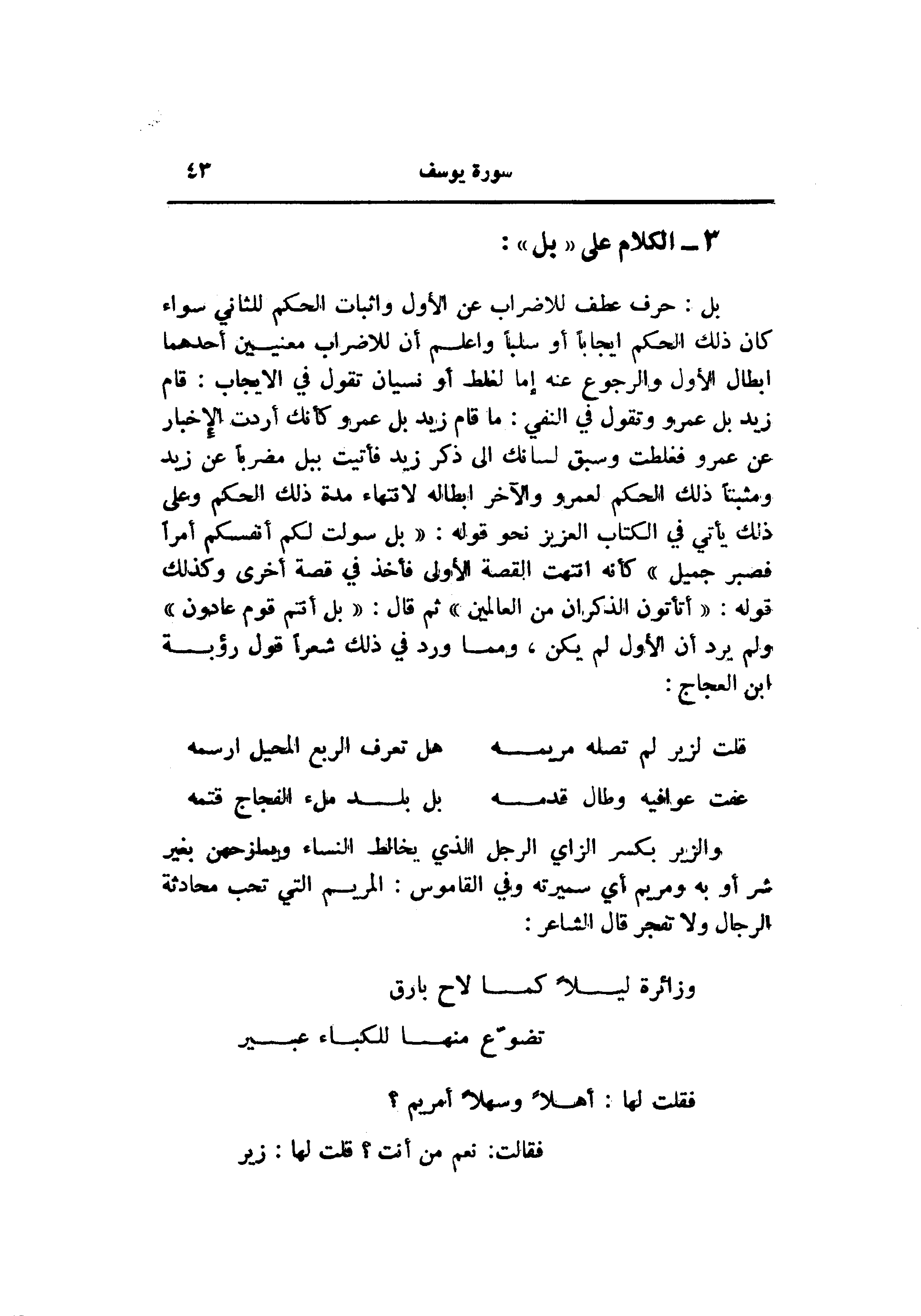 بل: حرف عطف للاضراب عن الأول واثبات الحكم للثاني سواء كان ذلك الحكم إيجابا أو سلبا واعلم أن للاضراب معنيين أحدهما ابطال الأول والرجوع عنه إما لغلط أو نسيان تقول في الإيجاب: قام زيد بل عمرو وتقول في النفي: ما قام زيد بل عمرو كأنك أردت الإخبار عن عمرو فغلطت وسبق لسانك الى ذكر زيد فأتيت ببل مضربا عن زيد ومثبتا ذلك الحكم لعمرو والآخر ابطاله لانتهاء مدة ذلك الحكم وعلى ذلك يأتي في الكتاب العزيز نحو قوله: «بل سولت لكم أنفسكم أمرا فصبر جميل» كأنه انتهت القصة الأولى فأخذ في قصة أخرى وكذلك قوله: «أتأتون الذكران من العالمين» ثم قال: «بل أنتم قوم عادون» ولم يرد أن الأول لم يكن، ومما ورد في ذلك شعرا قول رؤبة ابن العجاج: