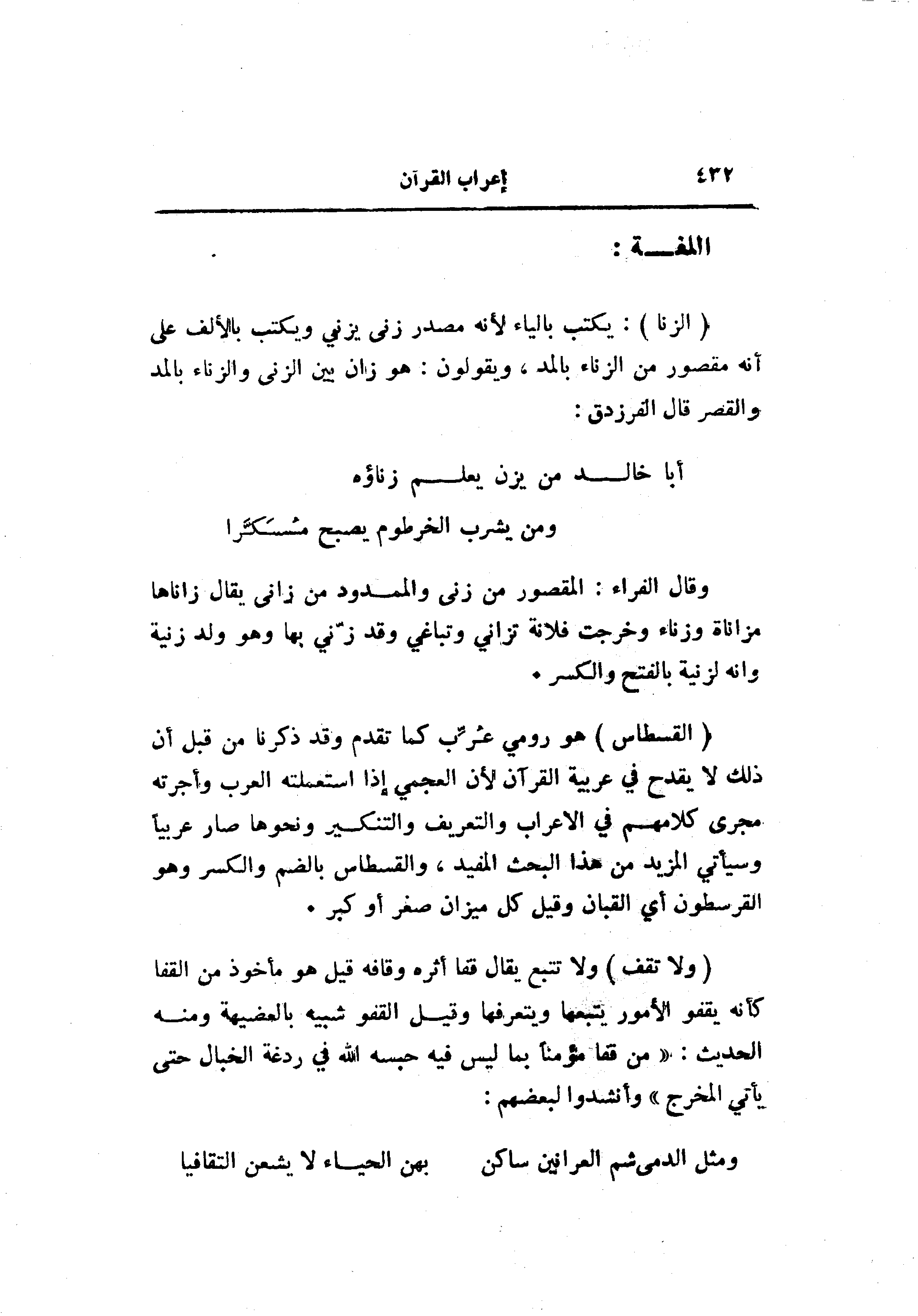 (الزِّنى) : يكتب بالياء لأنه مصدر زنى يزني ويكتب بالألف على أنه مقصور من الزناء بالمد، ويقولون: هو زان بين الزنى والزناء بالمد والقصر قال الفرزدق: