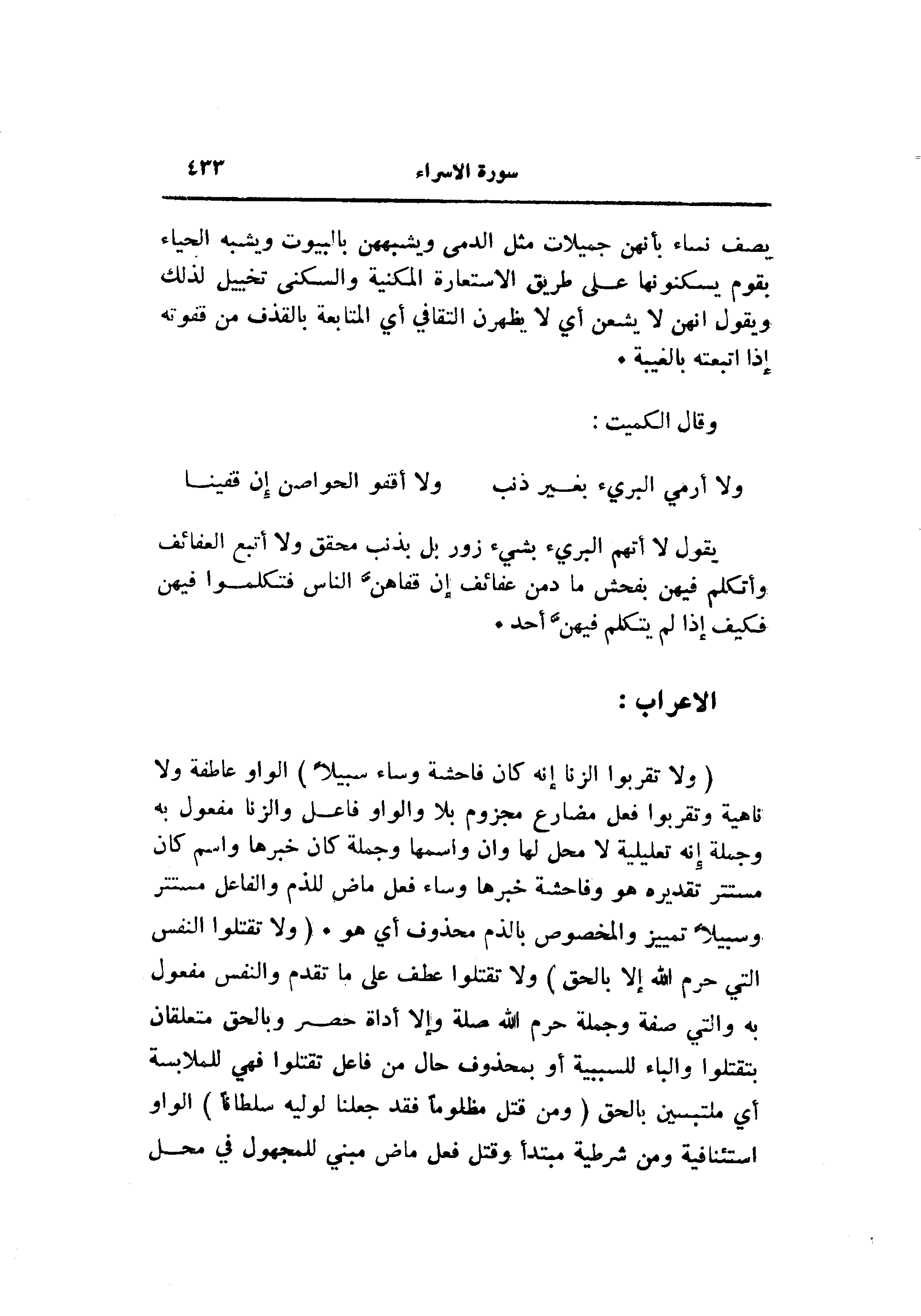 (وَلا تَقْرَبُوا الزِّنى إِنَّهُ كانَ فاحِشَةً وَساءَ سَبِيلًا) الواو عاطفة ولا ناهية وتقربوا فعل مضارع مجزوم بلا والواو فاعل والزنا مفعول به وجملة إنه تعليلية لا محل لها وان واسمها وجملة كان خبرها واسم كان مستتر تقديره هو وفاحشة خبرها وساء فعل ماض للذم والفاعل مستتر وسبيلا تمييز والمخصوص بالذم محذوف أي هو. (وَلا تَقْتُلُوا النَّفْسَ الَّتِي حَرَّمَ اللَّهُ إِلَّا بِالْحَقِّ) ولا تقتلوا عطف على ما تقدم والنفس مفعول به والتي صفة وجملة حرم الله صلة وإلا أداة حصر وبالحق متعلقان بتقتلوا والباء للسببية أو بمحذوف حال من فاعل تقتلوا فهي للملابسة أي ملتبسين بالحق (وَمَنْ قُتِلَ مَظْلُوماً فَقَدْ جَعَلْنا لِوَلِيِّهِ سُلْطاناً) الواو استئنافية ومن شرطية مبتدأ وقتل فعل ماض مبني للمجهول في محل