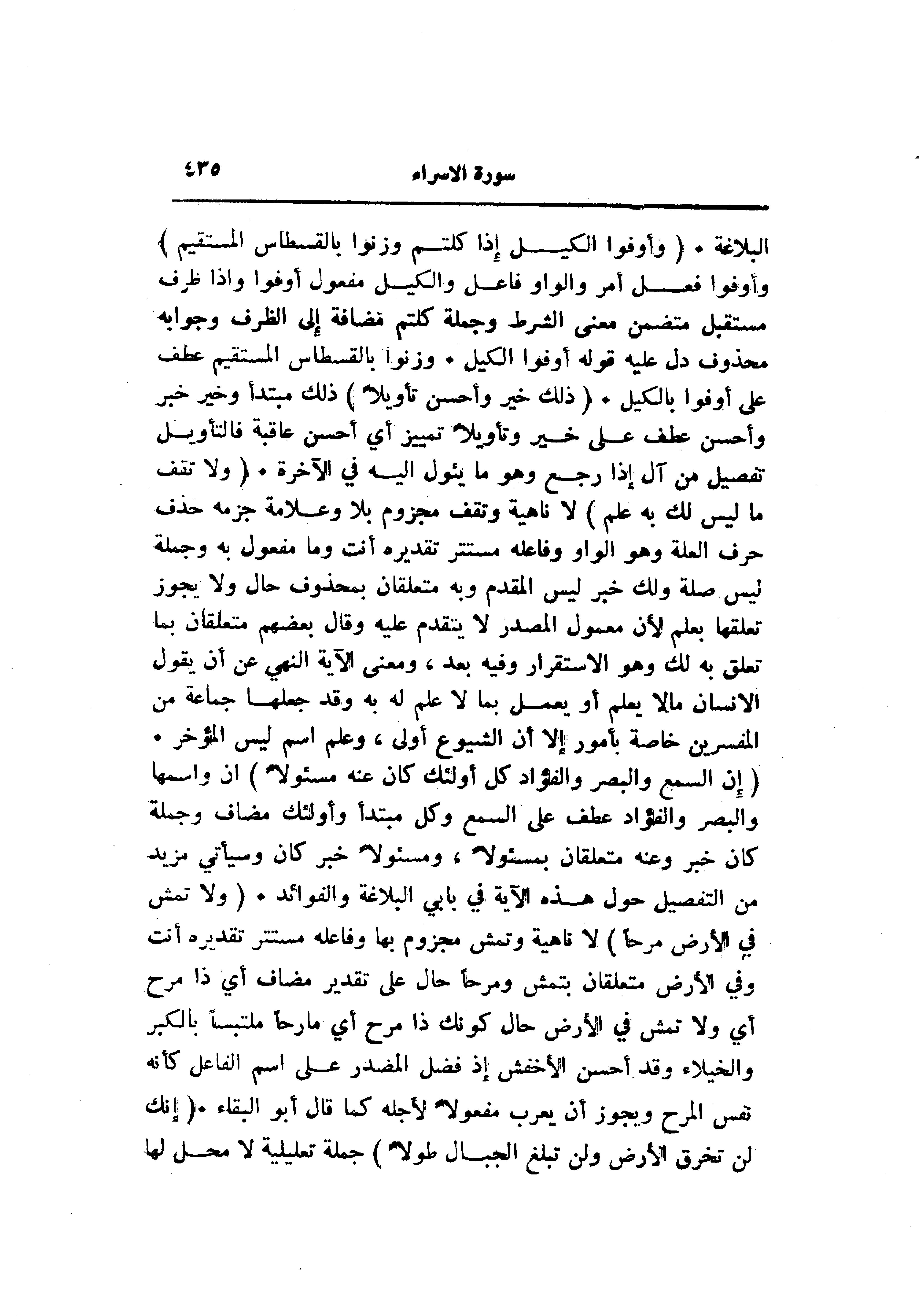 البلاغة. (وَأَوْفُوا الْكَيْلَ إِذا كِلْتُمْ وَزِنُوا بِالْقِسْطاسِ الْمُسْتَقِيمِ) وأوفوا فعل أمر والواو فاعل والكيل مفعول أوفوا وإذا ظرف مستقبل متضمن معنى الشرط وجملة كلتم مضافة إلى الظرف وجوابه محذوف دل عليه قوله أوفوا الكيل. وزنوا بالقسطاس المستقيم عطف على أوفوا بالكيل. (ذلِكَ خَيْرٌ وَأَحْسَنُ تَأْوِيلًا) ذلك مبتدأ وخير خبر وأحسن عطف على خير وتأويلا تمييز أي أحسن عاقبة فالتأويل تفصيل من آل إذا رجع وهو ما يئول اليه في الآخرة. (وَلا تَقْفُ ما لَيْسَ لَكَ بِهِ عِلْمٌ) لا ناهية وتقف مجزوم بلا وعلامة جزمه حذف حرف العلة وهو الواو وفاعله مستتر تقديره أنت وما مفعول به وجملة ليس صلة ولك خبر ليس المقدم وبه متعلقان بمحذوف حال ولا يجوز تعلقها بعلم لأن معمول المصدر لا يتقدم عليه وقال بعضهم متعلقان بما تعلق به لك وهو الاستقرار وفيه بعد، ومعنى الآية النهي عن أن يقول الإنسان مالا يعلم أو يعمل بما لا علم له به وقد جعلها جماعة من المفسرين خاصة بأمور إلا أن الشيوع أولى، وعلم اسم ليس المؤخر.
