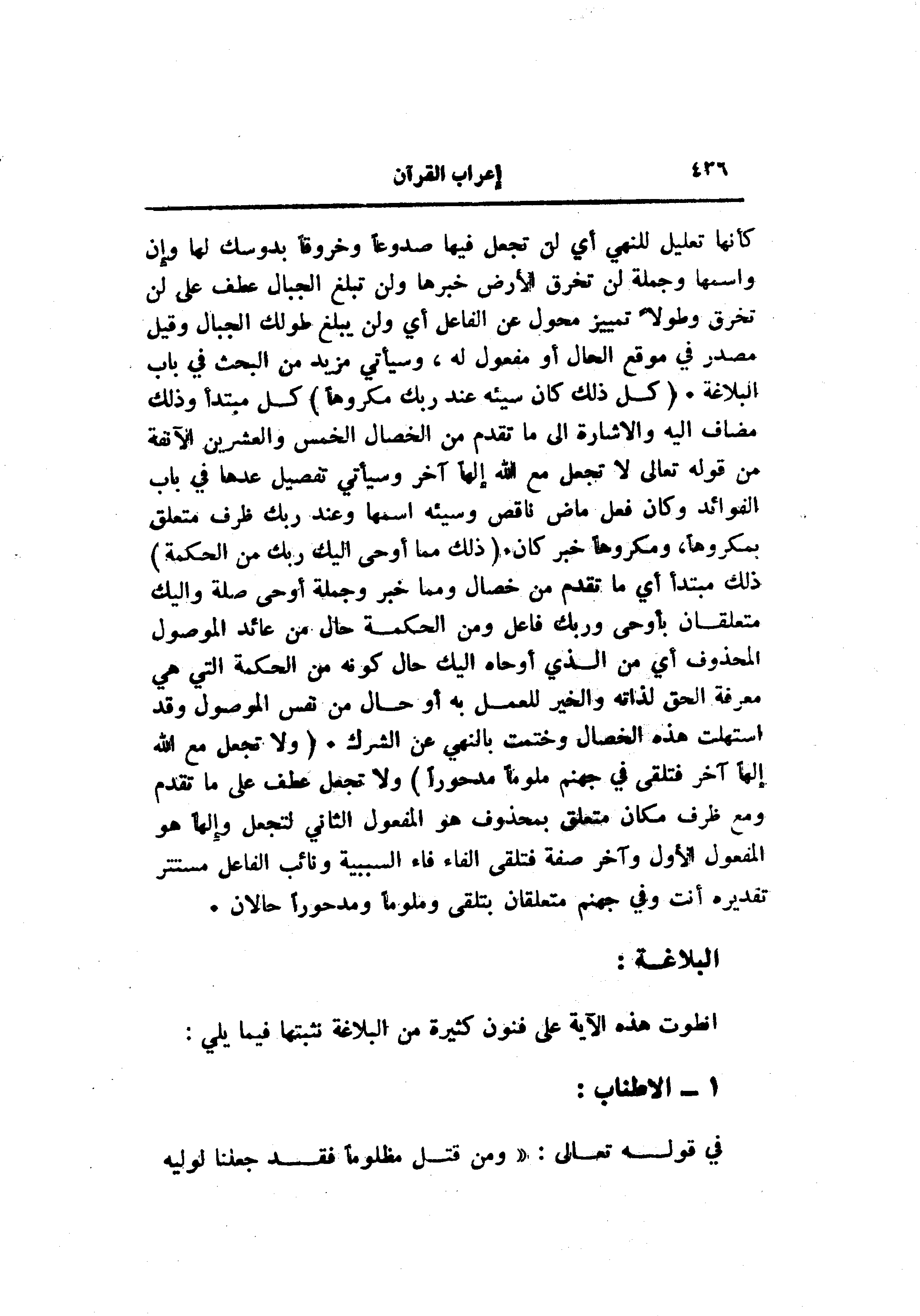 كأنها تعليل للنهي أي لن تجعل فيها صدوعا وخروقا بدوسك لها وإن واسمها وجملة لن تخرق الأرض خبرها ولن تبلغ الجبال عطف على لن تخرق وطولا تمييز محول عن الفاعل أي ولن يبلغ طولك الجبال وقيل مصدر في موقع الحال أو مفعول له، وسيأتي مزيد من البحث في باب البلاغة. (كُلُّ ذلِكَ كانَ سَيِّئُهُ عِنْدَ رَبِّكَ مَكْرُوهاً) كل مبتدأ وذلك مضاف اليه والاشارة الى ما تقدم من الخصال الخمس والعشرين الآنفة من قوله تعالى لا تجعل مع الله إلها آخر وسيأتي تفصيل عدها في باب الفوائد وكان فعل ماض ناقص وسيئه اسمها وعند ربك ظرف متعلق بمكروها، ومكروها خبر كان. (ذلِكَ مِمَّا أَوْحى إِلَيْكَ رَبُّكَ مِنَ الْحِكْمَةِ) ذلك مبتدأ أي ما تقدم من خصال ومما خبر وجملة أوحى صلة وإليك متعلقان بأوحى وربك فاعل ومن الحكمة حال من عائد الموصول المحذوف أي من الذي أوحاه إليك حال كونه من الحكمة التي هي معرفة الحق لذاته والخير للعمل به أو حال من نفس الموصول وقد استهلت هذه الخصال وختمت بالنهي عن الشرك. (وَلا تَجْعَلْ مَعَ اللَّهِ إِلهاً آخَرَ فَتُلْقى فِي جَهَنَّمَ مَلُوماً مَدْحُوراً) ولا تجعل عطف على ما تقدم ومع ظرف مكان متعلق بمحذوف هو المفعول الثاني لتجعل وإلها هو المفعول الأول وآخر صفة فتلقى الفاء فاء السببية ونائب الفاعل مستتر تقديره أنت وفي جهنم متعلقان بتلقى وملوما ومدحورا حالان.