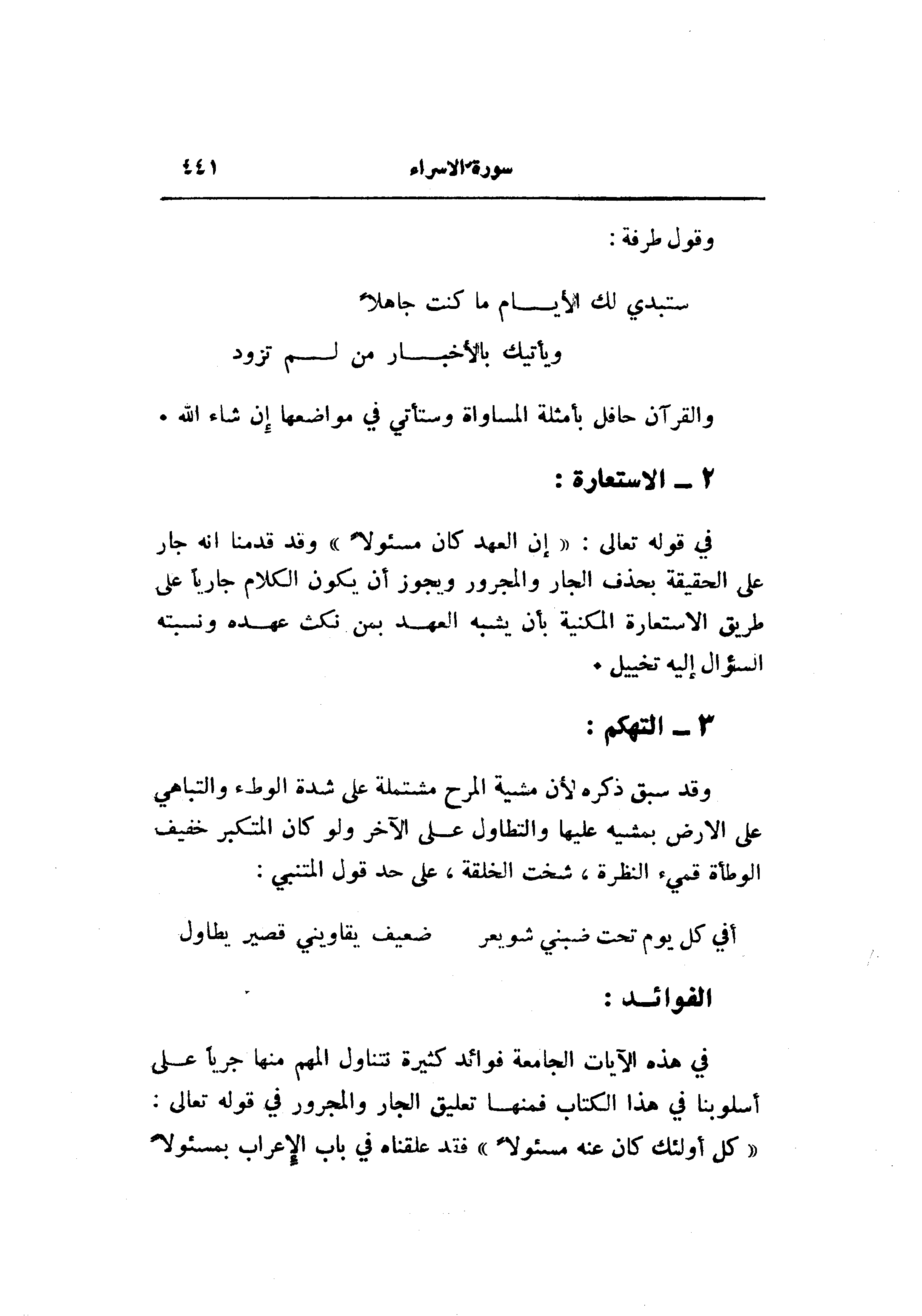 في قوله تعالى: «إن العهد كان مسئولا» وقد قدمنا انه جار على الحقيقة بحذف الجار والمجرور ويجوز أن يكون الكلام جاريا على طريق الاستعارة المكنية بأن يشبه العهد بمن نكث عهده ونسبته السؤال إليه تخييل.