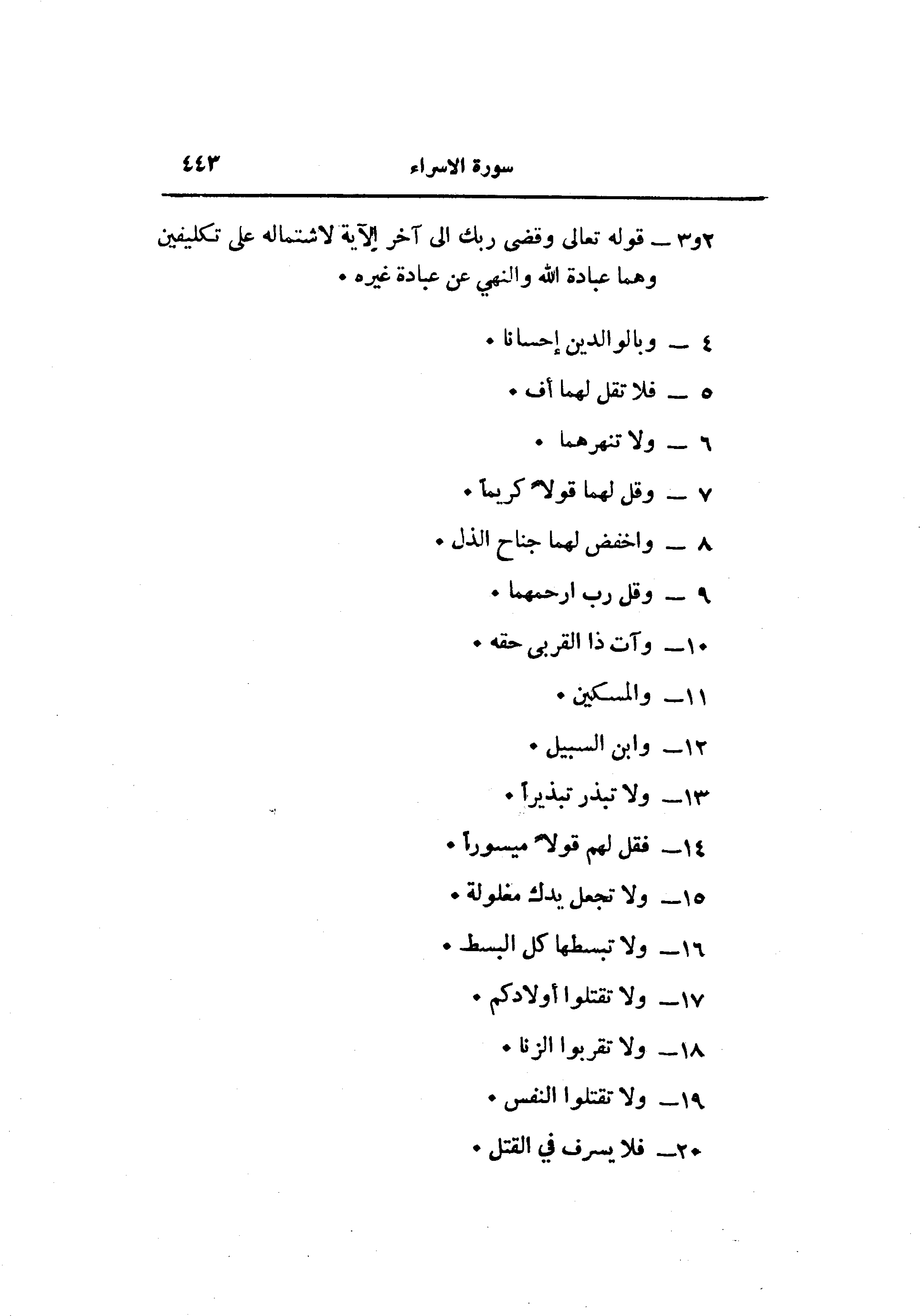 2 و3- قوله تعالى وقضى ربك الى آخر الآية لاشتماله على تكليفين وهما عبادة الله والنهي عن عبادة غيره.