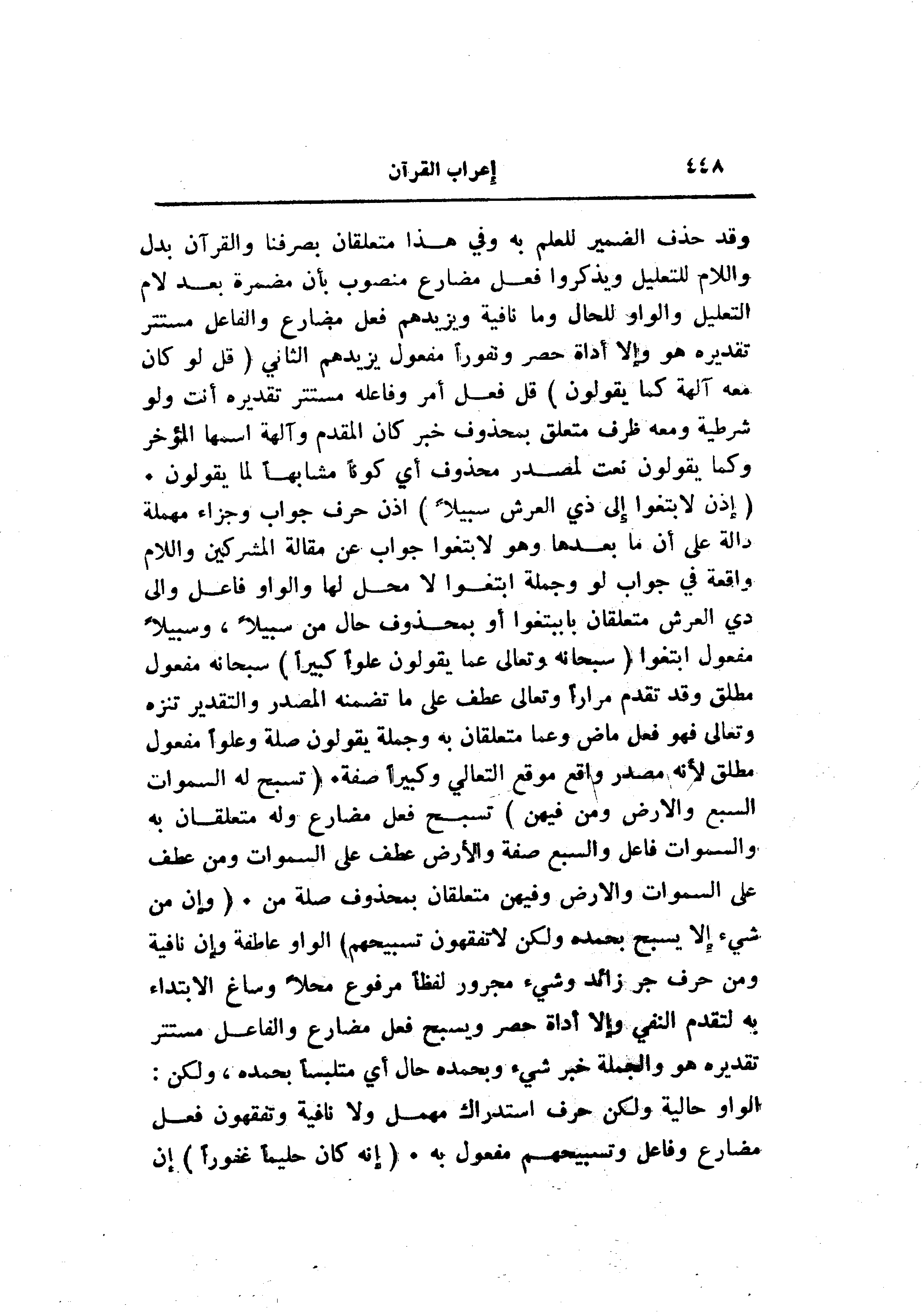 (إِذاً لَابْتَغَوْا إِلى ذِي الْعَرْشِ سَبِيلًا) اذن حرف جواب وجزاء مهملة دالة على أن ما بعدها وهو لابتغوا جواب عن مقالة المشركين واللام واقعة في جواب لو وجملة ابتغوا لا محل لها والواو فاعل والى ذي العرش متعلقان بابتغوا أو بمحذوف حال من سبيلا، وسبيلا مفعول ابتغوا (سُبْحانَهُ وَتَعالى عَمَّا يَقُولُونَ عُلُوًّا كَبِيراً) سبحانه مفعول مطلق وقد تقدم مرارا وتعالى عطف على ما تضمنه المصدر والتقدير تنزه وتعالى فهو فعل ماض وعما متعلقان به وجملة يقولون صلة وعلوا مفعول مطلق لأنه مصدر واقع موقع التعالي وكبيرا صفة. (تُسَبِّحُ لَهُ السَّماواتُ السَّبْعُ وَالْأَرْضُ وَمَنْ فِيهِنَّ) تسبح فعل مضارع وله متعلقان به والسموات فاعل والسبع صفة والأرض عطف على السموات ومن عطف على السموات والأرض وفيهن متعلقان بمحذوف صلة من. (وَإِنْ مِنْ شَيْءٍ إِلَّا يُسَبِّحُ بِحَمْدِهِ وَلكِنْ لا تَفْقَهُونَ تَسْبِيحَهُمْ) الواو عاطفة وإن نافية ومن حرف جر زائد وشيء مجرور لفظا مرفوع محلا وساغ الابتداء به لتقدم النفي وإلا أداة حصر ويسبح فعل مضارع والفاعل مستتر تقديره هو والجملة خبر شيء وبحمده حال أي متلبسا بحمده، ولكن: