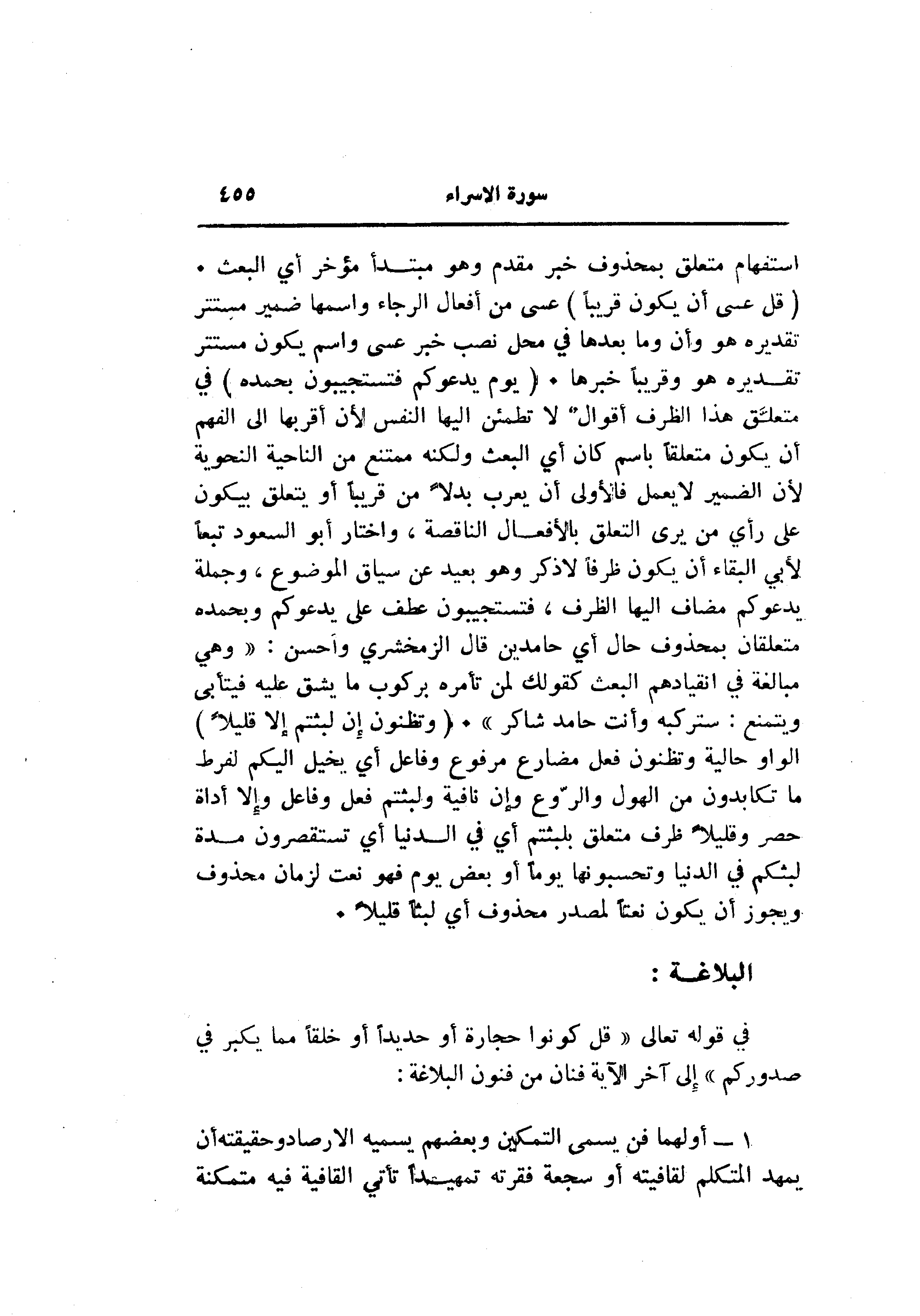 (قُلْ عَسى أَنْ يَكُونَ قَرِيباً) عسى من أفعال الرجاء واسمها ضمير مستتر تقديره هو وأن وما بعدها في محل نصب خبر عسى واسم يكون مستتر تقديره هو وقريبا خبرها. (يَوْمَ يَدْعُوكُمْ فَتَسْتَجِيبُونَ بِحَمْدِهِ) في متعلّق هذا الظرف أقوال لا تطمئن إليها النفس لأن أقربها الى الفهم أن يكون متعلقا باسم كان أي البعث ولكنه ممتنع من الناحية النحوية لأن الضمير لا يعمل فالأولى أن يعرب بدلا من قريبا أو يتعلق بيكون على رأي من يرى التعلق بالأفعال الناقصة، واختار أبو السعود تبعا لأبي البقاء أن يكون ظرفا لا ذكر وهو بعيد عن سياق الموضوع، وجملة يدعوكم مضاف إليها الظرف، فتستجيبون عطف على يدعوكم وبحمده متعلقان بمحذوف حال أي حامدين قال الزمخشري وأحسن: «وهي مبالغة في انقيادهم البعث كقولك لمن تأمره بركوب ما يشق عليه فيتأبى ويتمنع: ستركبه وأنت حامد شاكر» . (وَتَظُنُّونَ إِنْ لَبِثْتُمْ إِلَّا قَلِيلًا) الواو حالية وتظنون فعل مضارع مرفوع وفاعل أي يخيل إليكم لفرط ما تكابدون من الهول والرّوع وإن نافية ولبثتم فعل وفاعل وإلا أداة حصر وقليلا ظرف متعلق بلبثتم أي في الدنيا أي تستقصرون مدة لبثكم في الدنيا وتحسبونها يوما أو بعض يوم فهو نعت لزمان محذوف ويجوز أن يكون نعتا لمصدر محذوف أي لبثا قليلا.