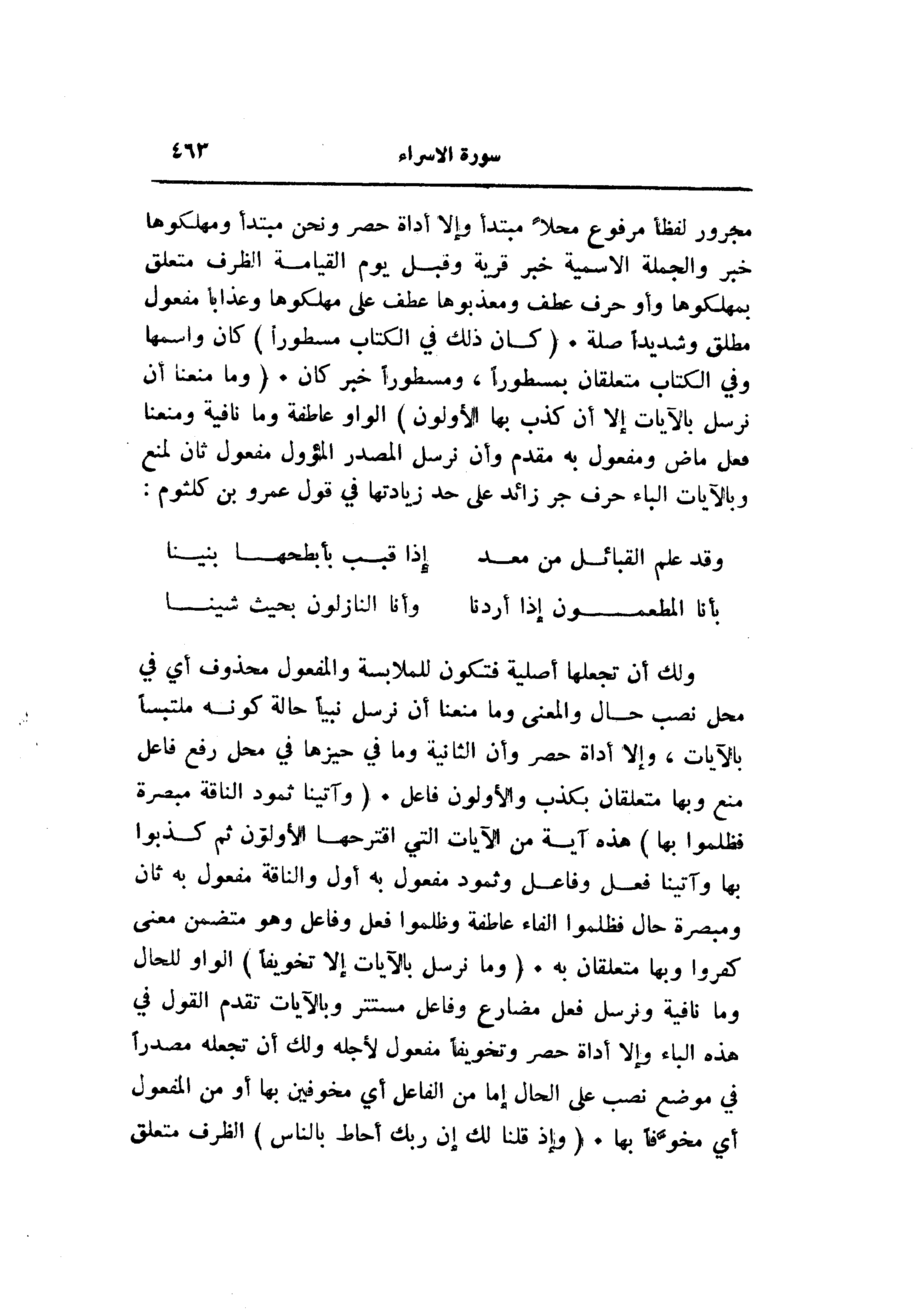 مجرور لفظا مرفوع محلا مبتدأ وإلا أداة حصر ونحن مبتدأ ومهلكوها خبر والجملة الاسمية خبر قرية وقبل يوم القيامة الظرف متعلق بمهلكوها وأو حرف عطف ومعذبوها عطف على مهلكوها وعذابا مفعول مطلق وشديدا صلة. (كانَ ذلِكَ فِي الْكِتابِ مَسْطُوراً) كان واسمها وفي الكتاب متعلقان بمسطورا، ومسطورا خبر كان. (وَما مَنَعَنا أَنْ نُرْسِلَ بِالْآياتِ إِلَّا أَنْ كَذَّبَ بِهَا الْأَوَّلُونَ) الواو عاطفة وما نافية ومنعنا فعل ماض ومفعول به مقدم وأن نرسل المصدر المؤول مفعول ثان لمنع وبالآيات الباء حرف جر زائد على حد زيادتها في قول عمرو بن كلثوم: