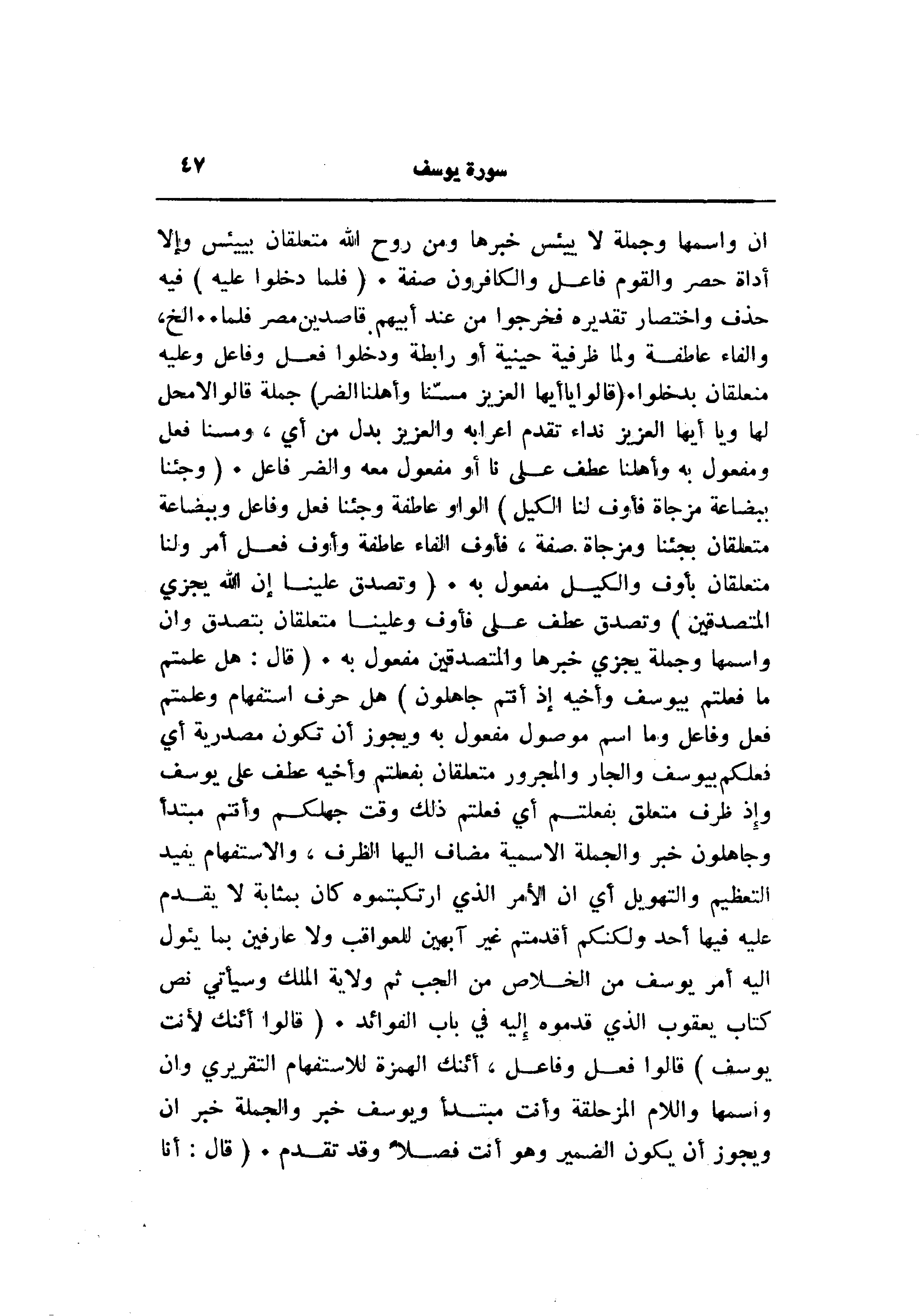 ان واسمها وجملة لا ييئس خبرها ومن روح الله متعلقان بييئس وإلا أداة حصر والقوم فاعل والكافرون صفة. (فَلَمَّا دَخَلُوا عَلَيْهِ) فيه حذف واختصار تقديره فخرجوا من عند أبيهم قاصدين مصر فلما.. إلخ، والفاء عاطفة ولما ظرفية حينية أو رابطة ودخلوا فعل وفاعل وعليه متعلقان بدخلوا. (قالُوا يا أَيُّهَا الْعَزِيزُ مَسَّنا وَأَهْلَنَا الضُّرُّ) جملة قالوا لا محل لها ويا أيها العزيز نداء تقدم إعرابه والعزيز بدل من أي، ومسنا فعل ومفعول به وأهلنا عطف على نا أو مفعول معه والضر فاعل. (وَجِئْنا بِبِضاعَةٍ مُزْجاةٍ فَأَوْفِ لَنَا الْكَيْلَ) الواو عاطفة وجئنا فعل وفاعل وببضاعة متعلقان بجئنا ومزجاة صفة، فأوف الفاء عاطفة وأوف فعل أمر ولنا متعلقان بأوف والكيل مفعول به. (وَتَصَدَّقْ عَلَيْنا إِنَّ اللَّهَ يَجْزِي الْمُتَصَدِّقِينَ) وتصدق عطف على فأوف وعلينا متعلقان بتصدق وان واسمها وجملة يجزي خبرها والمتصدقين مفعول به. (قالَ: هَلْ عَلِمْتُمْ ما فَعَلْتُمْ بِيُوسُفَ وَأَخِيهِ إِذْ أَنْتُمْ جاهِلُونَ) هل حرف استفهام وعلمتم فعل وفاعل وما اسم موصول مفعول به ويجوز أن تكون مصدرية أي فعلكم بيوسف والجار والمجرور متعلقان بفعلتم وأخيه عطف على يوسف وإذ ظرف متعلق بفعلتم أي فعلتم ذلك وقت جهلكم وأنتم مبتدأ وجاهلون خبر والجملة الاسمية مضاف إليها الظرف، والاستفهام يفيد التعظيم والتهويل أي ان الأمر الذي ارتكبتموه كان بمثابة لا يقدم عليه فيها أحد ولكنكم أقدمتم غير آبهين للعواقب ولا عارفين بما يئول اليه أمر يوسف من الخلاص من الجب ثم ولاية الملك وسيأتي نص كتاب يعقوب الذي قدموه إليه في باب الفوائد. (قالُوا أَإِنَّكَ لَأَنْتَ يُوسُفُ) قالوا فعل وفاعل، أإنك الهمزة للاستفهام التقريري وان واسمها واللام المزحلقة وأنت مبتدأ ويوسف خبر والجملة خبر ان ويجوز أن يكون الضمير وهو أنت فصلا وقد تقدم. (قالَ: أَنَا