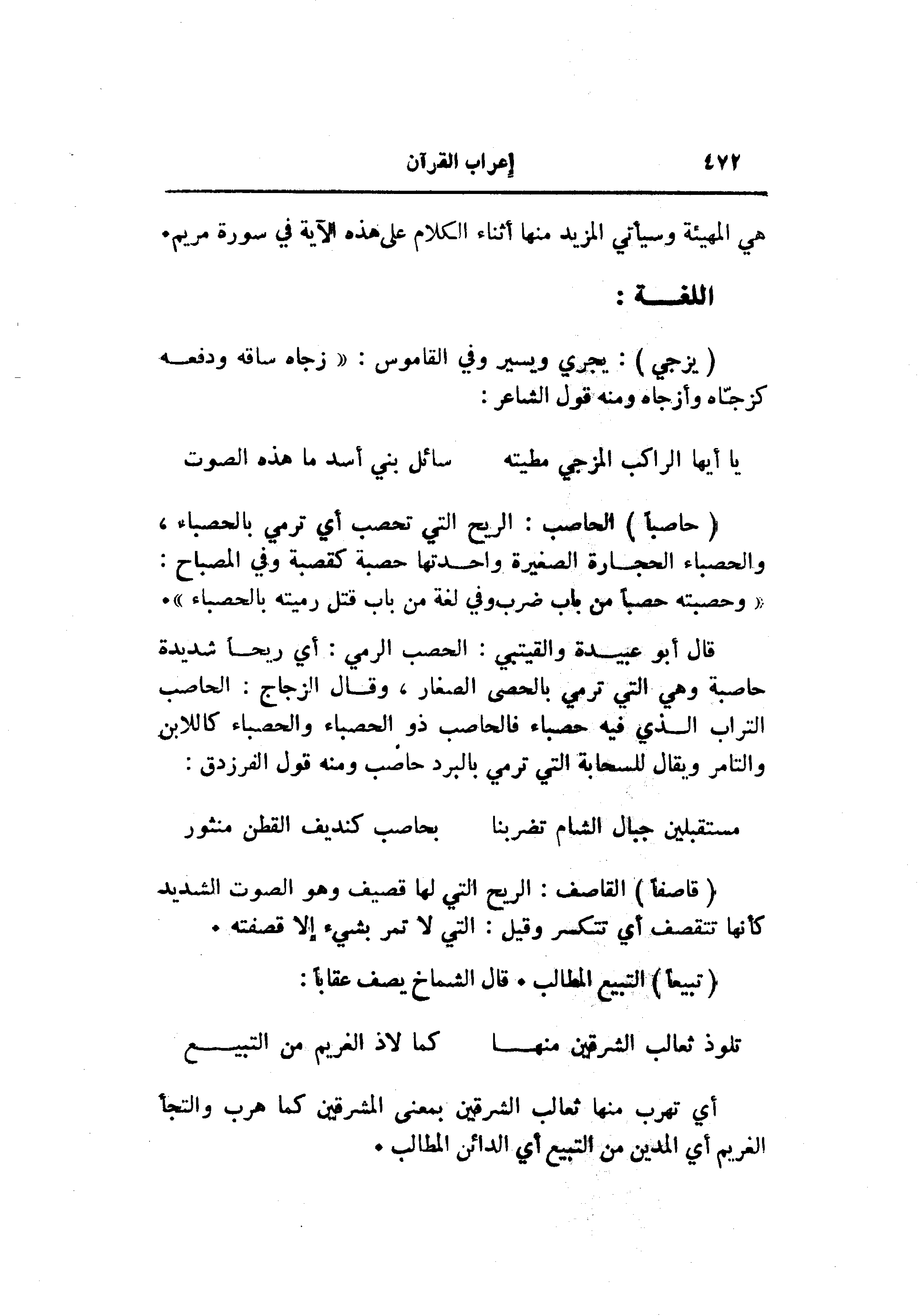 (حاصِباً) الحاصب: الريح التي تحصب أي ترمي بالحصباء، والحصباء الحجارة الصغيرة واحدتها حصبة كقصبة وفي المصباح: