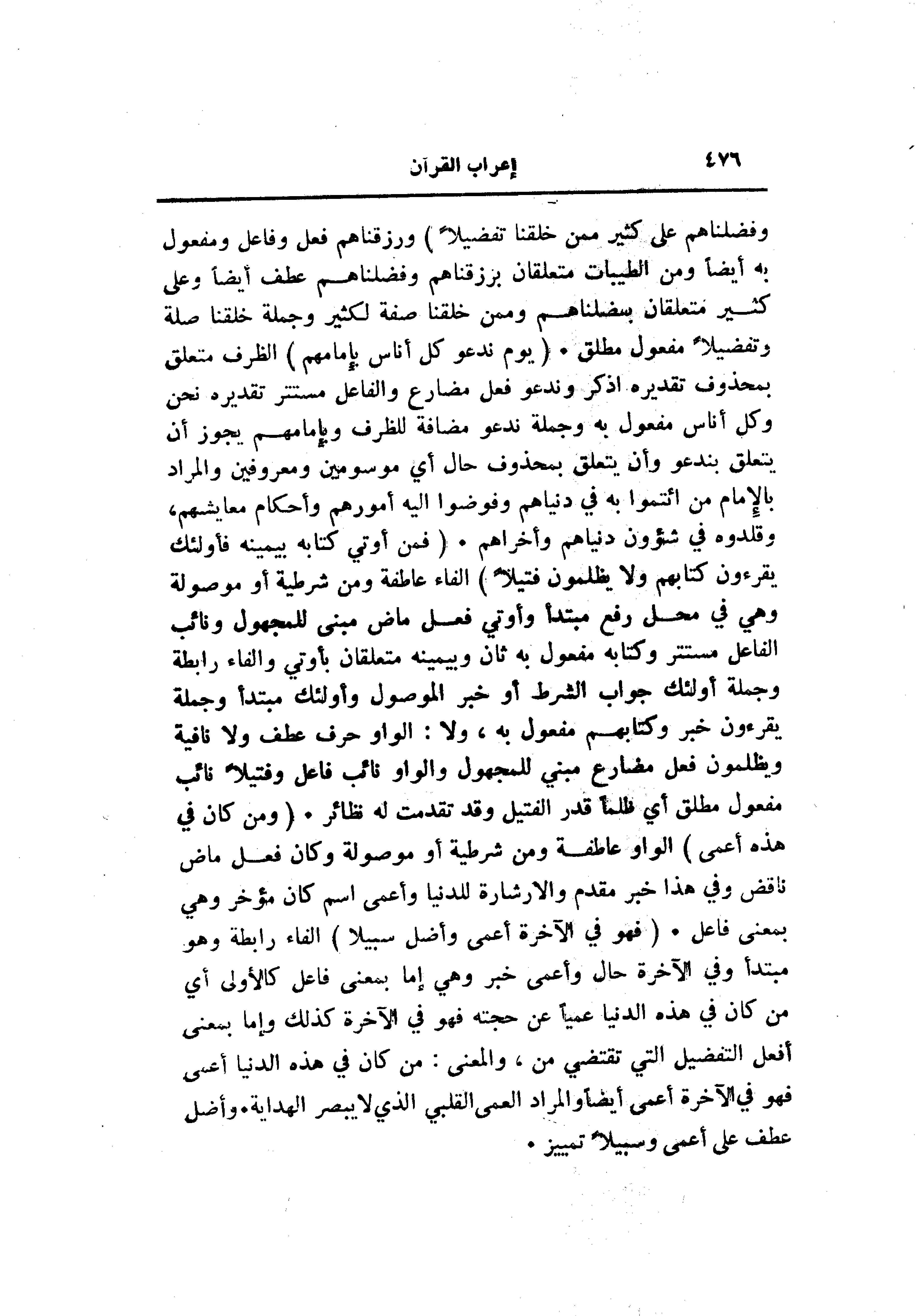 ورزقناهم فعل وفاعل ومفعول به أيضا ومن الطيبات متعلقان برزقناهم وفضلناهم عطف أيضا وعلى كثير متعلقان بفضلناهم وممن خلقنا صفة لكثير وجملة خلقنا صلة وتفضيلا مفعول مطلق. (يَوْمَ نَدْعُوا كُلَّ أُناسٍ بِإِمامِهِمْ) الظرف متعلق بمحذوف تقديره اذكر وندعو فعل مضارع والفاعل مستتر تقديره نحن وكل أناس مفعول به وجملة ندعو مضافة للظرف وبإمامهم يجوز أن يتعلق بندعو وأن يتعلق بمحذوف حال أي موسومين ومعروفين والمراد بالإمام من ائتموا به في دنياهم وفوضوا اليه أمورهم وأحكام معايشهم، وقلدوه في شؤون دنياهم وأخراهم. (فَمَنْ أُوتِيَ كِتابَهُ بِيَمِينِهِ فَأُولئِكَ يَقْرَؤُنَ كِتابَهُمْ وَلا يُظْلَمُونَ فَتِيلًا) الفاء عاطفة ومن شرطية أو موصولة وهي في محل رفع مبتدأ وأوتي فعل ماض مبنى للمجهول ونائب الفاعل مستتر وكتابه مفعول به ثان وبيمينه متعلقان بأوتي والفاء رابطة وجملة أولئك جواب الشرط أو خبر الموصول وأولئك مبتدأ وجملة يقرءون خبر وكتابهم مفعول به، ولا: الواو حرف عطف ولا نافية ويظلمون فعل مضارع مبني للمجهول والواو نائب فاعل وفتيلا نائب مفعول مطلق أي ظلما قدر الفتيل وقد تقدمت له نظائر. (وَمَنْ كانَ فِي هذِهِ أَعْمى) الواو عاطفة ومن شرطية أو موصولة وكان فعل ماض ناقض وفي هذا خبر مقدم والاشارة للدنيا وأعمى اسم كان مؤخر وهي بمعنى فاعل. (فَهُوَ فِي الْآخِرَةِ أَعْمى وَأَضَلُّ سَبِيلًا) الفاء رابطة وهو مبتدأ وفي الآخرة حال وأعمى خبر وهي إما بمعنى فاعل كالأولى أي من كان في هذه الدنيا عميا عن حجته فهو في الآخرة كذلك وإما بمعنى أفعل التفضيل التي تقتضي من، والمعنى: من كان في هذه الدنيا أعمى فهو في الآخرة أعمى أيضا والمراد العمى القلبي الذي لا يبصر الهداية. وأضل عطف على أعمى وسبيلا تمييز.