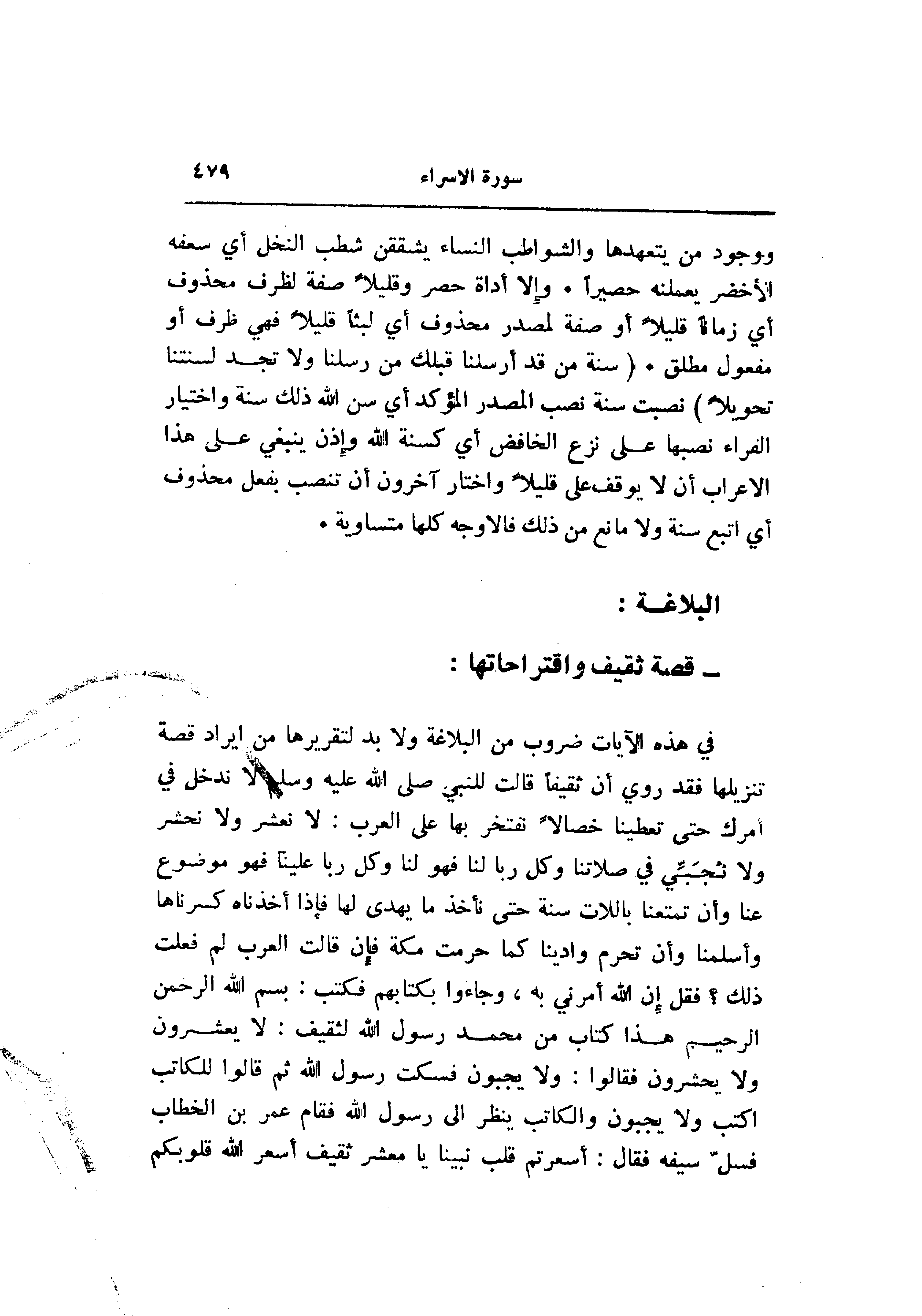 ووجود من يتعهدها والشواطب النساء يشققن شطب النخل أي سعفه الأخضر يعملنه حصيرا. وإلا أداة حصر وقليلا صفة لظرف محذوف أي زمانا قليلا أو صفة لمصدر محذوف أي لبثا قليلا فهي ظرف أو مفعول مطلق. (سُنَّةَ مَنْ قَدْ أَرْسَلْنا قَبْلَكَ مِنْ رُسُلِنا وَلا تَجِدُ لِسُنَّتِنا تَحْوِيلًا) نصبت سنة نصب المصدر المؤكد أي سن الله ذلك سنة واختيار الفراء نصبها على نزع الخافض أي كسنة الله وإذن ينبغي على هذا الإعراب أن لا يوقف على قليلا واختار آخرون أن تنصب بفعل محذوف أي اتبع سنة ولا مانع من ذلك فالاوجه كلها متساوية.