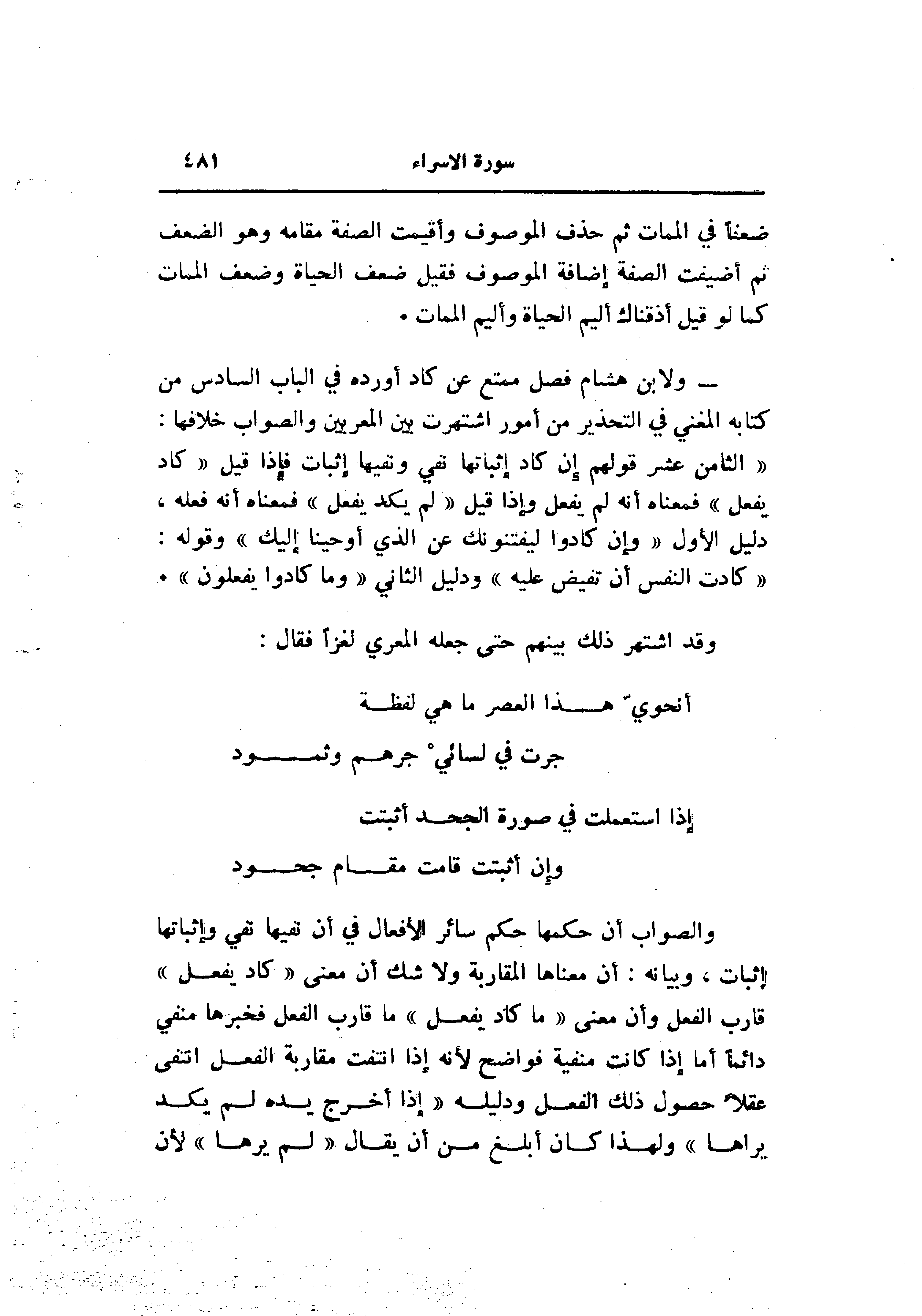 «الثامن عشر قولهم إن كاد إثباتها نفي ونفيها إثبات فإذا قيل «كاد يفعل» فمعناه أنه لم يفعل وإذا قيل «لم يكد يفعل» فمعناه أنه فعله، دليل الأول «وإن كادوا ليفتنونك عن الذي أوحينا إليك» وقوله: