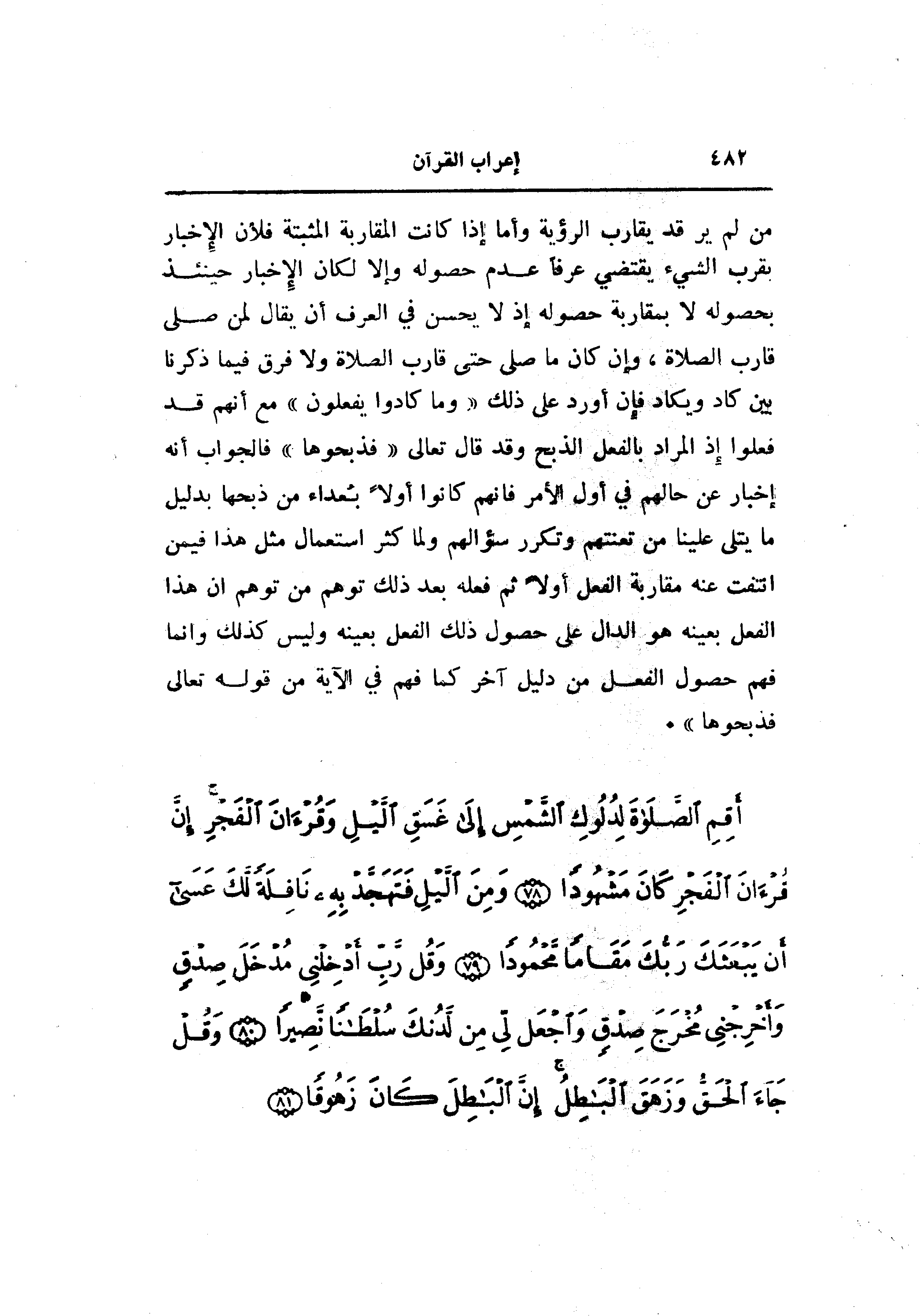 من لم ير قد يقارب الرؤية وأما إذا كانت المقاربة المثبتة فلأن الإخبار بقرب الشيء يقتضي عرفا عدم حصوله وإلا لكان الإخبار حينئذ بحصوله لا بمقاربة حصوله إذ لا يحسن في العرف أن يقال لمن صلى قارب الصلاة، وإن كان ما صلى حتى قارب الصلاة ولا فرق فيما ذكرنا بين كاد ويكاد فإن أورد على ذلك «وما كادوا يفعلون» مع أنهم قد فعلوا إذ المراد بالفعل الذبح وقد قال تعالى «فذبحوها» فالجواب أنه إخبار عن حالهم في أول الأمر فانهم كانوا أولا بعداء من ذبحها بدليل ما يتلى علينا من تعنتهم وتكرر سؤالهم ولما كثر استعمال مثل هذا فيمن انتفت عنه مقاربة الفعل أولا ثم فعله بعد ذلك توهم من توهم ان هذا الفعل بعينه هو الدال على حصول ذلك الفعل بعينه وليس كذلك وانما فهم حصول الفعل من دليل آخر كما فهم في الآية من قوله تعالى فذبحوها» .