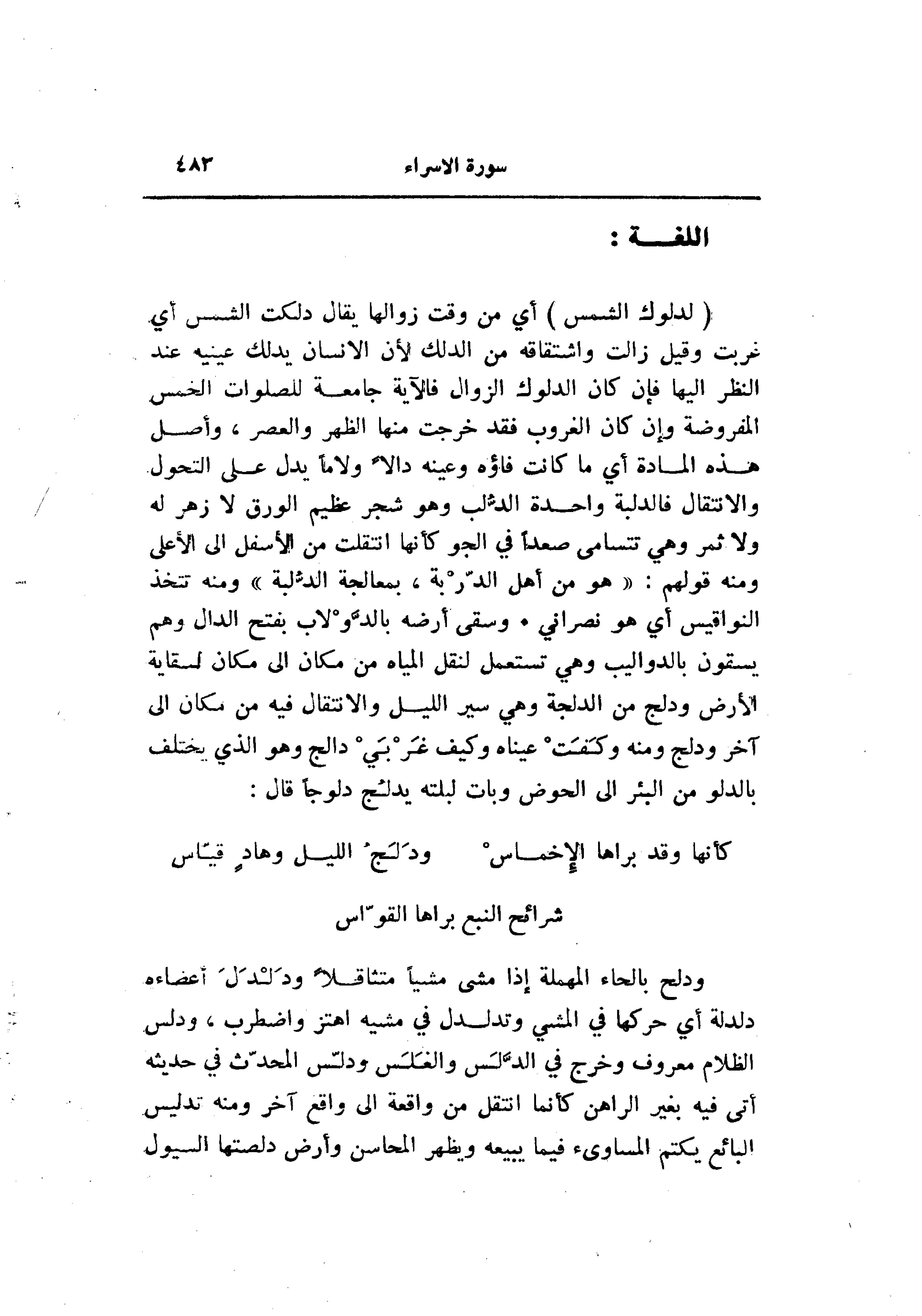 (لِدُلُوكِ الشَّمْسِ) أي من وقت زوالها يقال دلكت الشمس أي غربت وقيل زالت واشتقاقه من الدلك لأن الإنسان يدلك عينيه عند النظر إليها فإن كان الدلوك الزوال فالآية جامعة للصلوات الخمس المفروضة وإن كان الغروب فقد خرجت منها الظهر والعصر، وأصل هذه المادة أي ما كانت فاؤه وعينه دالا ولاما يدل على التحول والانتقال فالدلبة واحدة الدّلب وهو شجر عظيم الورق لا زهر له ولا ثمر وهي تتسامى صعدا في الجو كأنها انتقلت من الأسفل الى الأعلى ومنه قولهم: «هو من أهل الدّربة، بمعالجة الدّلبة» ومنه تتخذ النواقيس أي هو نصراني. وسقى أرضه بالدّولاب بفتح الدال وهم يسقون بالدواليب وهي تستعمل لنقل المياه من مكان الى مكان لسقاية الأرض ودلج من الدلجة وهي سير الليل والانتقال فيه من مكان الى آخر ودلج ومنه وكفت عيناه وكيف غربي دالج وهو الذي يختلف بالدلو من البئر الى الحوض وبات لبلته يدلج دلوجا قال:
