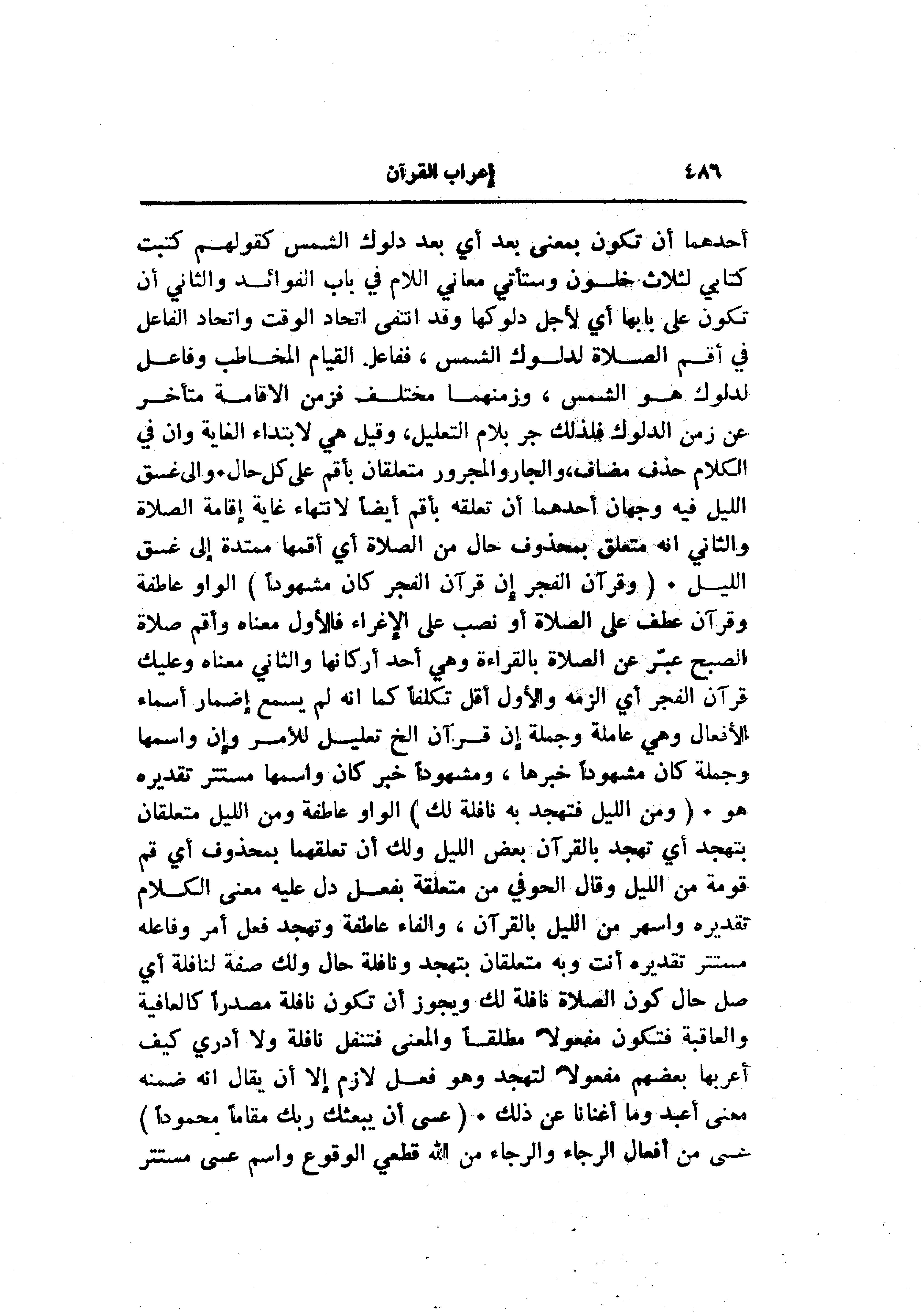 أحدهما أن تكون بمعنى بعد أي بعد دلوك الشمس كقولهم كتبت كتابي لثلاث خلون وستأتي معاني اللام في باب الفوائد والثاني أن تكون على بابها أي لأجل دلوكها وقد انتفى اتحاد الوقت واتحاد الفاعل في أقم الصلاة لدلوك الشمس، ففاعل القيام المخاطب وفاعل لدلوك هو الشمس، وزمنهما مختلف فزمن الاقامة متأخر عن زمن الدلوك فلذلك جر بلام التعليل، وقيل هي لابتداء الغاية وان في الكلام حذف مضاف، والجار والمجرور متعلقان بأقم على كل حال. والى غسق الليل فيه وجهان أحدهما أن تعلقه بأقم أيضا لانتهاء غاية إقامة الصلاة والثاني انه متعلق بمحذوف حال من الصلاة أي أقمها ممتدة إلى غسق الليل. (وَقُرْآنَ الْفَجْرِ إِنَّ قُرْآنَ الْفَجْرِ كانَ مَشْهُوداً) الواو عاطفة وقرآن عطف على الصلاة أو نصب على الإغراء فالأول معناه وأقم صلاة الصبح عبّر عن الصلاة بالقراءة وهي أحد أركانها والثاني معناه وعليك قرآن الفجر أي الزمه والأول أقل تكلفا كما انه لم يسمع إضمار أسماء الأفعال وهي عاملة وجملة إن قرآن إلخ تعليل للأمر وإن واسمها وجملة كان مشهودا خبرها، ومشهودا خبر كان واسمها مستتر تقديره هو. (وَمِنَ اللَّيْلِ فَتَهَجَّدْ بِهِ نافِلَةً لَكَ) الواو عاطفة ومن الليل متعلقان بتهجد أي تهجد بالقرآن بعض الليل ولك أن تعلقهما بمحذوف أي قم قومة من الليل وقال الحوفي من متعلقة بفعل دل عليه معنى الكلام تقديره واسهر من الليل بالقرآن، والفاء عاطفة وتهجد فعل أمر وفاعله مستتر تقديره أنت وبه متعلقان بتهجد ونافلة حال ولك صفة لنافلة أي صل حال كون الصلاة نافلة لك ويجوز أن تكون نافلة مصدرا كالعافية والعاقبة فتكون مفعولا مطلقا والمعنى فتنفل نافلة ولا أدري كيف أعربها بعضهم مفعولا لتهجد وهو فعل لازم إلا أن يقال انه ضمنه معنى أعبد وما أغنانا عن ذلك. (عَسى أَنْ يَبْعَثَكَ رَبُّكَ مَقاماً مَحْمُوداً) عسى من أفعال الرجاء والرجاء من الله قطعي الوقوع واسم عسى مستتر