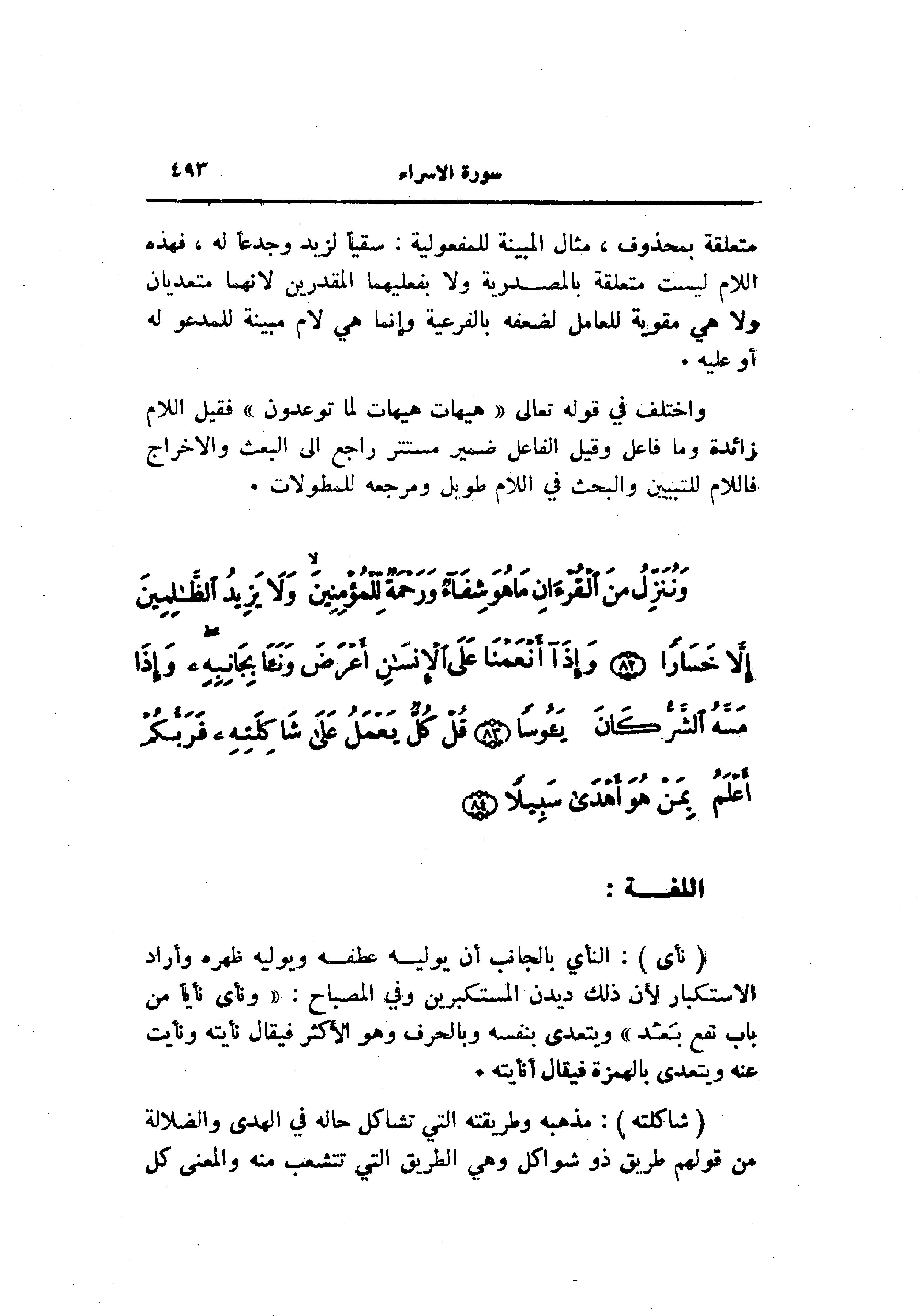 (شاكِلَتِهِ) : مذهبه وطريقته التي تشاكل حاله في الهدى والضلالة من قولهم طريق ذو شواكل وهي الطريق التي تتشعب منه والمعنى كل