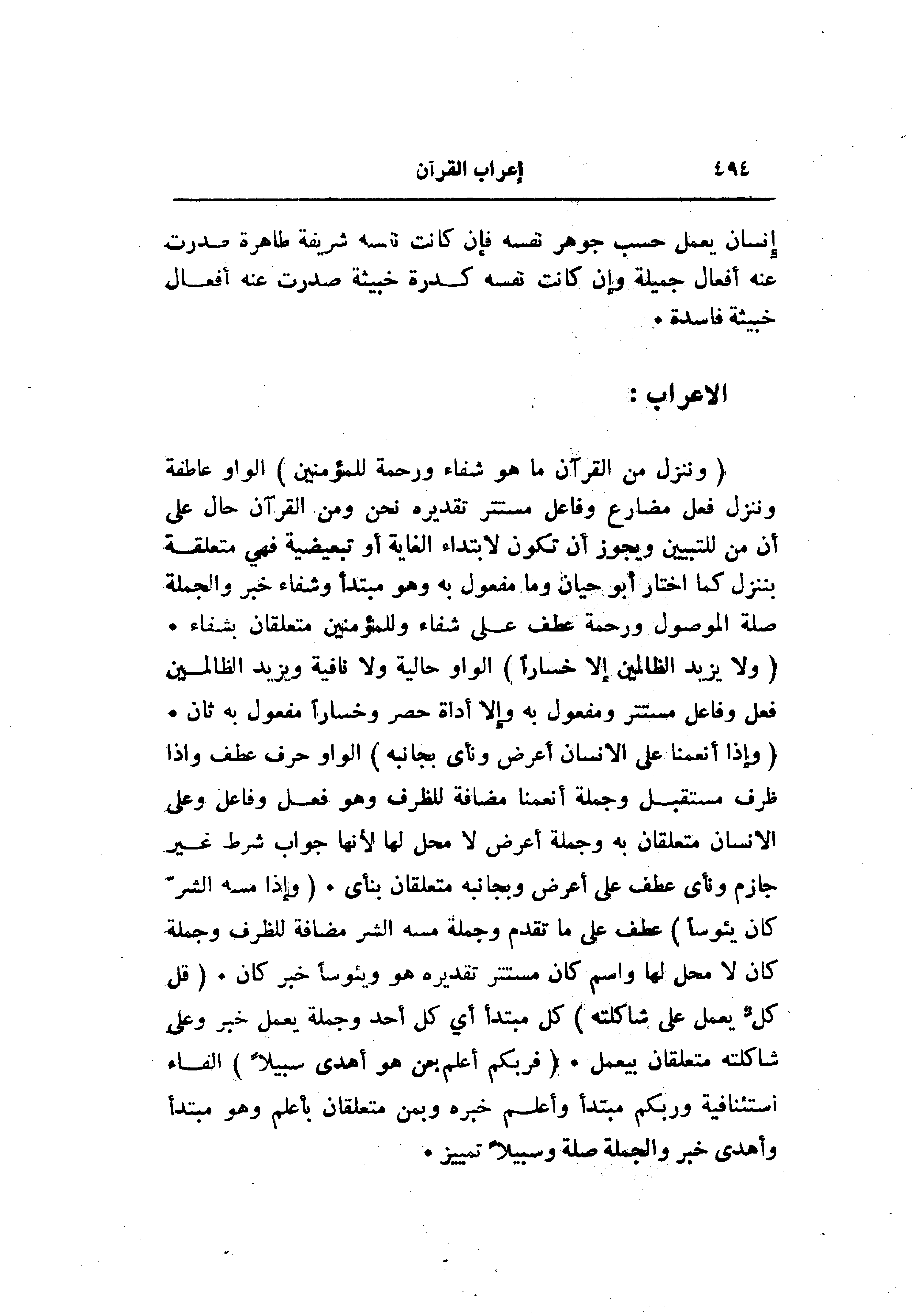(وَإِذا أَنْعَمْنا عَلَى الْإِنْسانِ أَعْرَضَ وَنَأى بِجانِبِهِ) الواو حرف عطف وإذا ظرف مستقبل وجملة أنعمنا مضافة للظرف وهو فعل وفاعل وعلى الإنسان متعلقان به وجملة أعرض لا محل لها لأنها جواب شرط غير جازم ونأى عطف على أعرض وبجانبه متعلقان بنأى. (وَإِذا مَسَّهُ الشَّرُّ كانَ يَؤُساً) عطف على ما تقدم وجملة مسه الشر مضافة للظرف وجملة كان لا محل لها واسم كان مستتر تقديره هو ويئوسا خبر كان. (قُلْ كُلٌّ يَعْمَلُ عَلى شاكِلَتِهِ) كل مبتدأ أي كل أحد وجملة يعمل خبر وعلى شاكلته متعلقان بيعمل. (فَرَبُّكُمْ أَعْلَمُ بِمَنْ هُوَ أَهْدى سَبِيلًا) الفاء استئنافية وربكم مبتدأ وأعلم خبره وبمن متعلقان بأعلم وهو مبتدأ وأهدى خبر والجملة صلة وسبيلا تمييز.