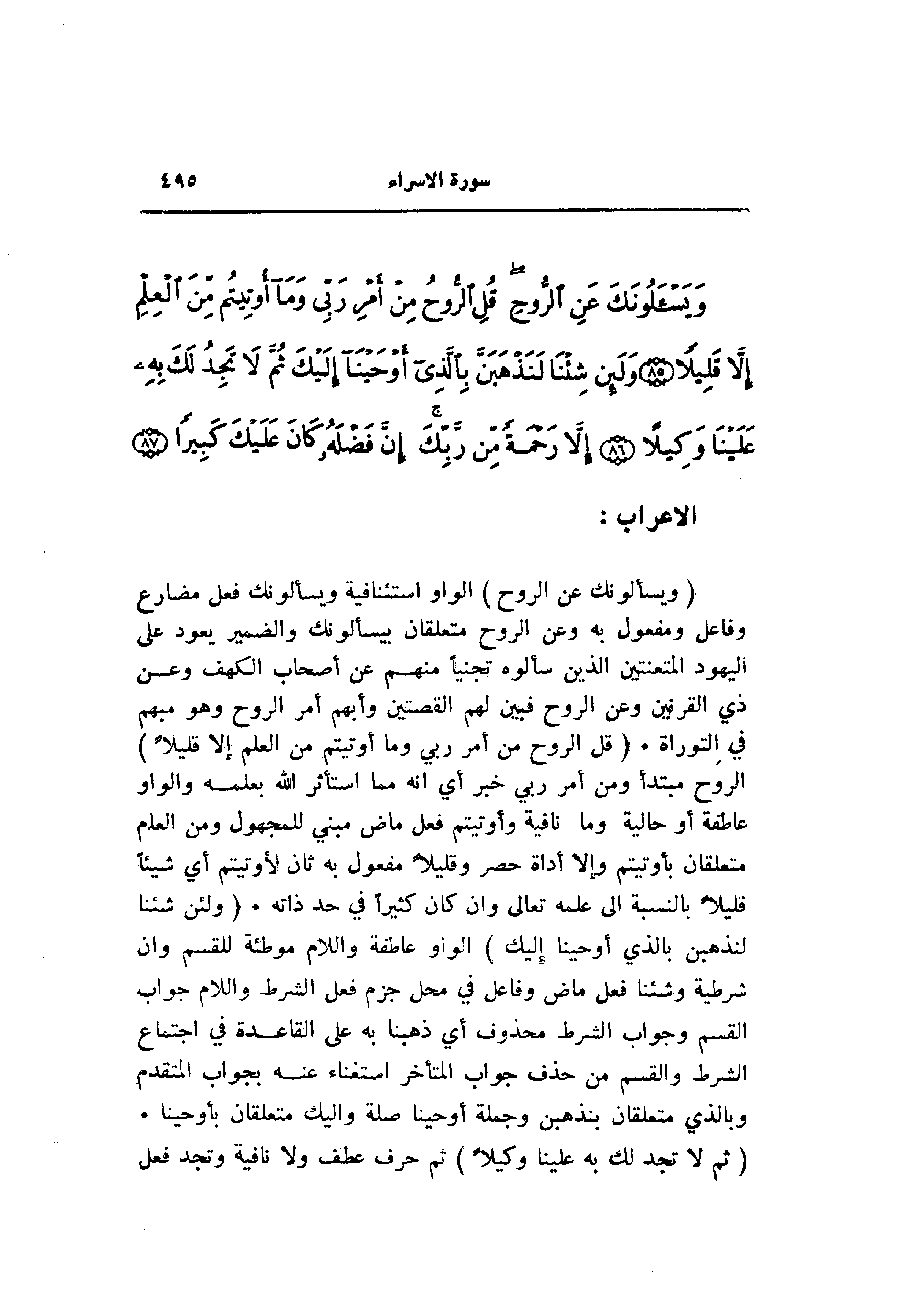 (وَيَسْئَلُونَكَ عَنِ الرُّوحِ) الواو استئنافية ويسألونك فعل مضارع وفاعل ومفعول به وعن الروح متعلقان بيسألونك والضمير يعود على اليهود المتعنتين الذين سألوه تجنيا منهم عن أصحاب الكهف وعن ذي القرنين وعن الروح فبين لهم القصتين وأبهم أمر الروح وهو مبهم في التوراة. (قُلِ الرُّوحُ مِنْ أَمْرِ رَبِّي وَما أُوتِيتُمْ مِنَ الْعِلْمِ إِلَّا قَلِيلًا) الروح مبتدأ ومن أمر ربي خبر أي انه مما استأثر الله بعلمه والواو عاطفة أو حالية وما نافية وأوتيتم فعل ماض مبني للمجهول ومن العلم متعلقان بأوتيتم وإلا أداة حصر وقليلا مفعول به ثان لأوتيتم أي شيئا قليلا بالنسبة الى علمه تعالى وان كان كثيرا في حد ذاته. (وَلَئِنْ شِئْنا لَنَذْهَبَنَّ بِالَّذِي أَوْحَيْنا إِلَيْكَ) الواو عاطفة واللام موطئة للقسم وان شرطية وشئنا فعل ماض وفاعل في محل جزم فعل الشرط واللام جواب القسم وجواب الشرط محذوف أي ذهبنا به على القاعدة في اجتماع الشرط والقسم من حذف جواب المتأخر استغناء عنه بجواب المتقدم وبالذي متعلقان بنذهبن وجملة أوحينا صلة وإليك متعلقان بأوحينا.