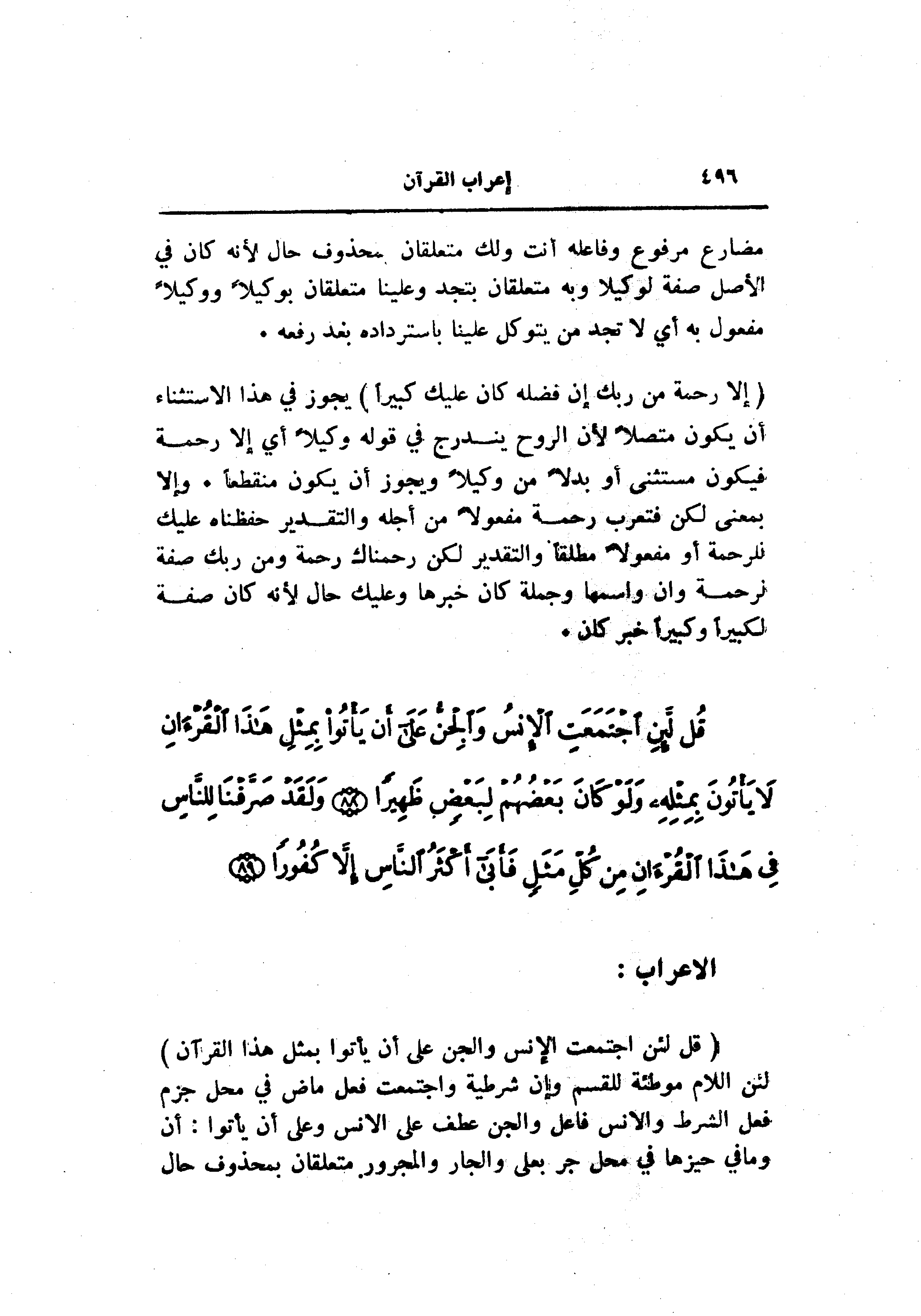 (إِلَّا رَحْمَةً مِنْ رَبِّكَ إِنَّ فَضْلَهُ كانَ عَلَيْكَ كَبِيراً) يجوز في هذا الاستثناء أن يكون متصلا لأن الروح يندرج في قوله وكيلا أي إلا رحمة فيكون مستثنى أو بدلا من وكيلا ويجوز أن يكون منقطعا. وإلا بمعنى لكن فتعرب رحمة مفعولا من أجله والتقدير حفظناه عليك للرحمة أو مفعولا مطلقا والتقدير لكن رحمناك رحمة ومن ربك صفة لرحمة وان واسمها وجملة كان خبرها وعليك حال لأنه كان صفة لكبيرا وكبيرا خبر كان.