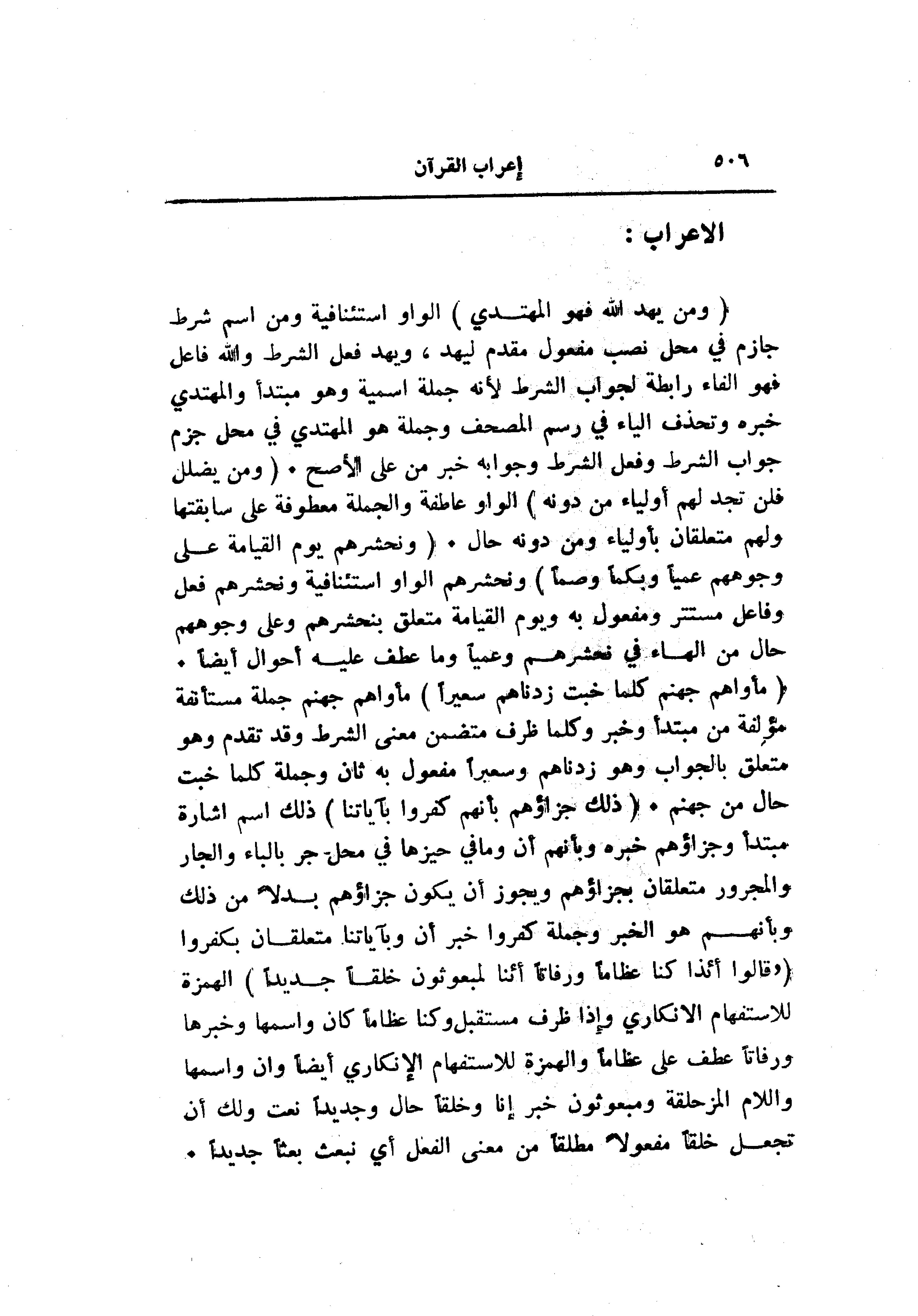 (وَمَنْ يَهْدِ اللَّهُ فَهُوَ الْمُهْتَدِ) الواو استئنافية ومن اسم شرط جازم في محل نصب مفعول مقدم ليهد، ويهد فعل الشرط والله فاعل فهو الفاء رابطة لجواب الشرط لأنه جملة اسمية وهو مبتدأ والمهتدي خبره وتحذف الياء في رسم المصحف وجملة هو المهتدي في محل جزم جواب الشرط وفعل الشرط وجوابه خبر من على الأصح. (وَمَنْ يُضْلِلْ فَلَنْ تَجِدَ لَهُمْ أَوْلِياءَ مِنْ دُونِهِ) الواو عاطفة والجملة معطوفة على سابقتها ولهم متعلقان بأولياء ومن دونه حال. (وَنَحْشُرُهُمْ يَوْمَ الْقِيامَةِ عَلى وُجُوهِهِمْ عُمْياً وَبُكْماً وَصُمًّا) ونحشرهم الواو استئنافية ونحشرهم فعل وفاعل مستتر ومفعول به ويوم القيامة متعلق بنحشرهم وعلى وجوههم حال من الهاء في نحشرهم وعميا وما عطف عليه أحوال أيضا.