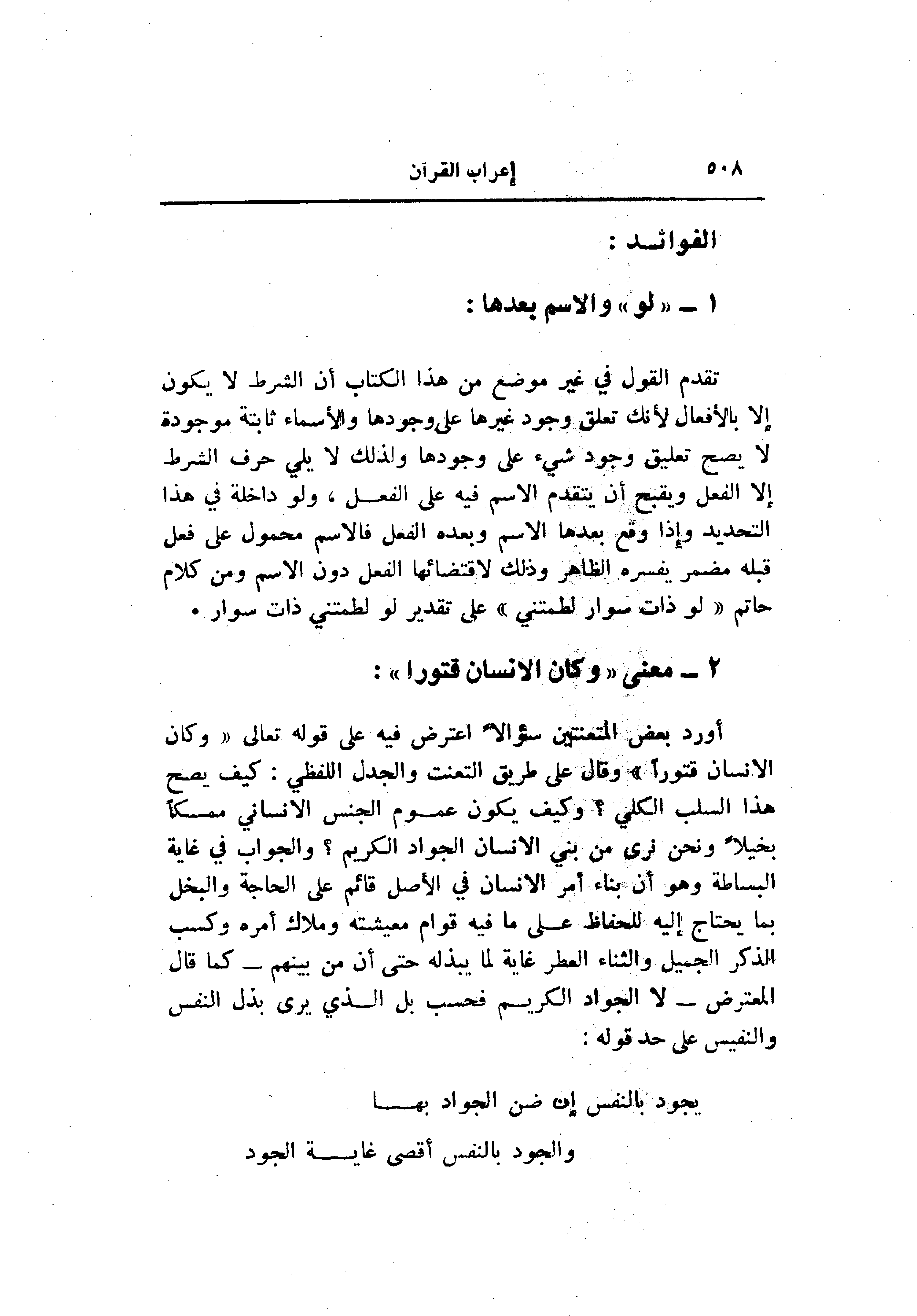 أورد بعض المتعنتين سؤالا اعترض فيه على قوله تعالى «وكان الإنسان قتورا» وقال على طريق التعنت والجدل اللفظي: كيف يصح هذا السلب الكلّيّ؟ وكيف يكون عموم الجنس الانساني ممسكا بخيلا ونحن نرى من بني الإنسان الجواد الكريم؟ والجواب في غاية البساطة وهو أن بناء أمر الإنسان في الأصل قائم على الحاجة والبخل بما يحتاج إليه للحفاظ على ما فيه قوام معيشته وملاك أمره وكسب الذكر الجميل والثناء العطر غاية لما يبذله حتى أن من بينهم- كما قال المعترض- لا الجواد الكريم فحسب بل الذي يرى بذل النفس والنفيس على حد قوله: