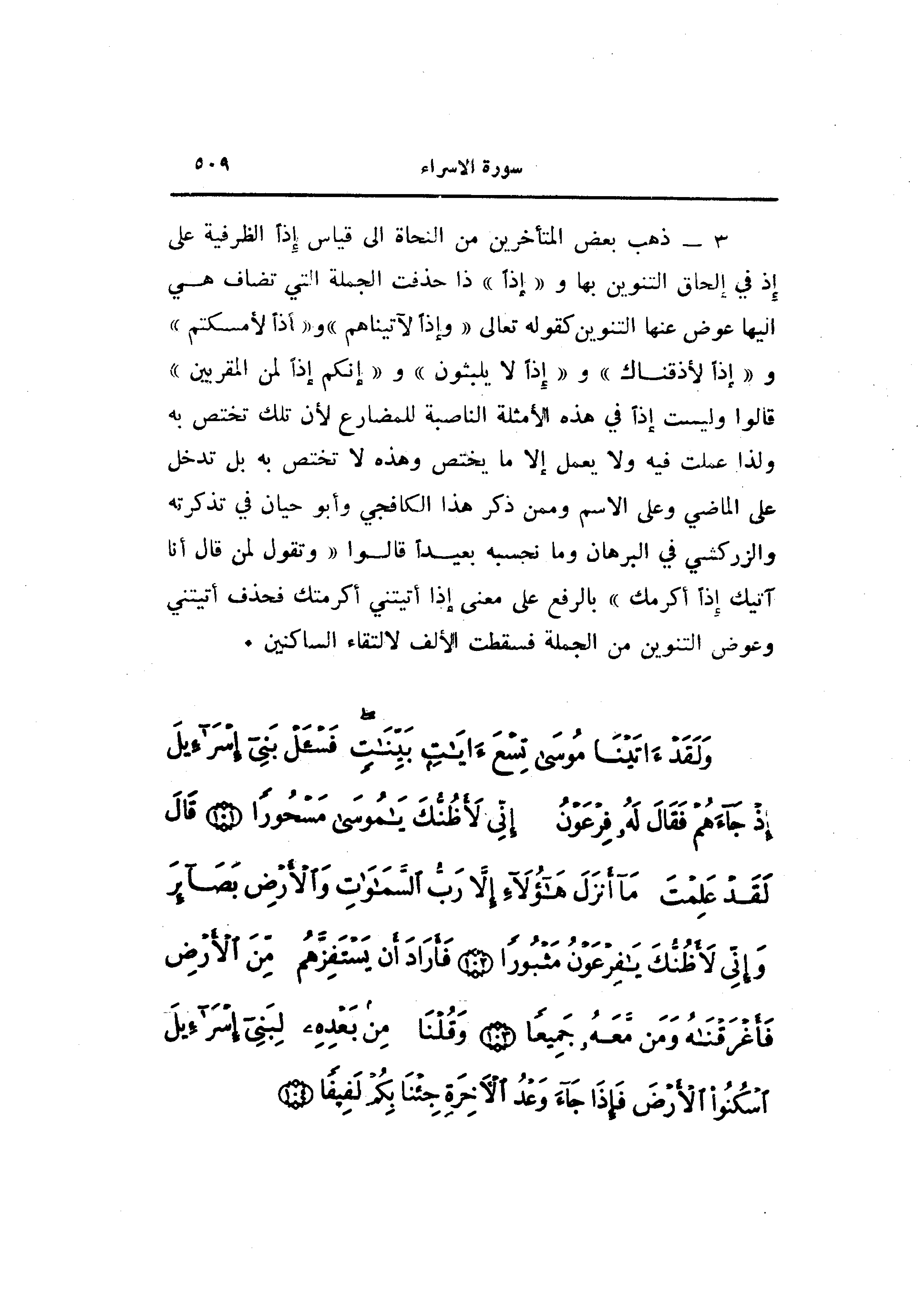3- ذهب بعض المتأخرين من النحاة الى قياس إذا الظرفية على إذ في إلحاق التنوين بها و «إذا» ذا حذفت الجملة التي تضاف هي إليها عوض عنها التنوين كقوله تعالى «وإذا لآتيناهم» و «إذا لأمسكتم» و «إذا لأذقناك» و «إذا لا يلبثون» و «إنكم إذا لمن المقربين» قالوا وليست إذا في هذه الأمثلة الناصبة للمضارع لأن تلك تختص به ولذا عملت فيه ولا يعمل إلا ما يختص وهذه لا تختص به بل تدخل على الماضي وعلى الاسم وممن ذكر هذا الكافجي وأبو حيان في تذكرته والزركشي في البرهان وما نحسبه بعيدا قالوا «وتقول لمن قال أنا آتيك إذا أكرمك» بالرفع على معنى إذا أتيتني أكرمتك فحذف أتيتني وعوض التنوين من الجملة فسقطت الألف لالتقاء الساكنين.