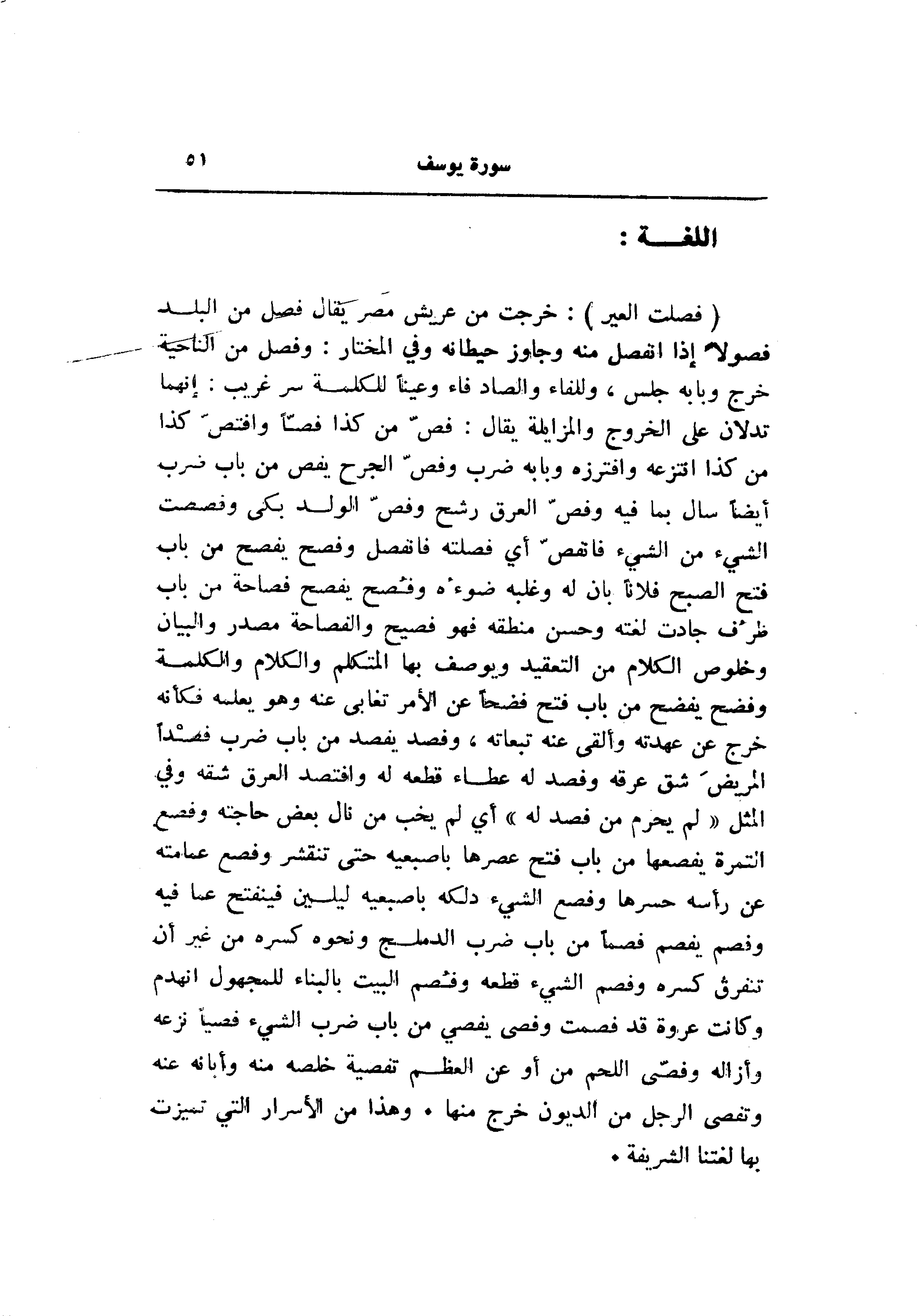 (فَصَلَتِ الْعِيرُ) : خرجت من عريش مصر يقال فصل من البلد فصولا إذا انفصل منه وجاوز حيطانه وفي المختار: وفصل من الناحية خرج وبابه جلس، وللفاء والصاد فاء وعينا للكلمة سر غريب: إنهما تدلان على الخروج والمزايلة يقال: فصّ من كذا فصّا وافتصّ كذا من كذا انتزعه وافترزه وبابه ضرب وفصّ الجرح يفص من باب ضرب أيضا سال بما فيه وفصّ العرق رشح وفصّ الولد بكى وفصصت الشيء من الشيء فانفصّ أي فصلته فانفصل وفصح يفصح من باب فتح الصبح فلانا بان له وغلبه ضوءه وفصح يفصح فصاحة من باب ظرف جادت لغته وحسن منطقه فهو فصيح والفصاحة مصدر والبيان وخلوص الكلام من التعقيد ويوصف بها المتكلم والكلام والكلمة وفضح يفضح من باب فتح فضحا عن الأمر تغابى عنه وهو يعلمه فكأنه خرج عن عهدته وألقى عنه تبعاته، وفصد يفصد من باب ضرب فصدا المريض شق عرقه وفصد له عطاء قطعه له وافتصد العرق شقه وفي المثل «لم يحرم من فصد له» أي لم يخب من نال بعض حاجته وفصع التمرة يفصعها من باب فتح عصرها بإصبعيه حتى تنقشر وفصع عمامته عن رأسه حسرها وفصع الشيء دلكه بإصبعيه ليلين فينفتح عما فيه وفصم يفصم فصما من باب ضرب الدملج ونحوه كسره من غير أن تنفرق كسره وفصم الشيء قطعه وفصم البيت بالبناء للمجهول انهدم وكانت عروة قد فصمت وفصى يفصي من باب ضرب الشيء فصيا نزعه وأزاله وفصّى اللحم من أو عن العظم تفصية خلصه منه وأبانه عنه وتفصى الرجل من الديون خرج منها. وهذا من الأسرار التي تميزت بها لغتنا الشريفة.