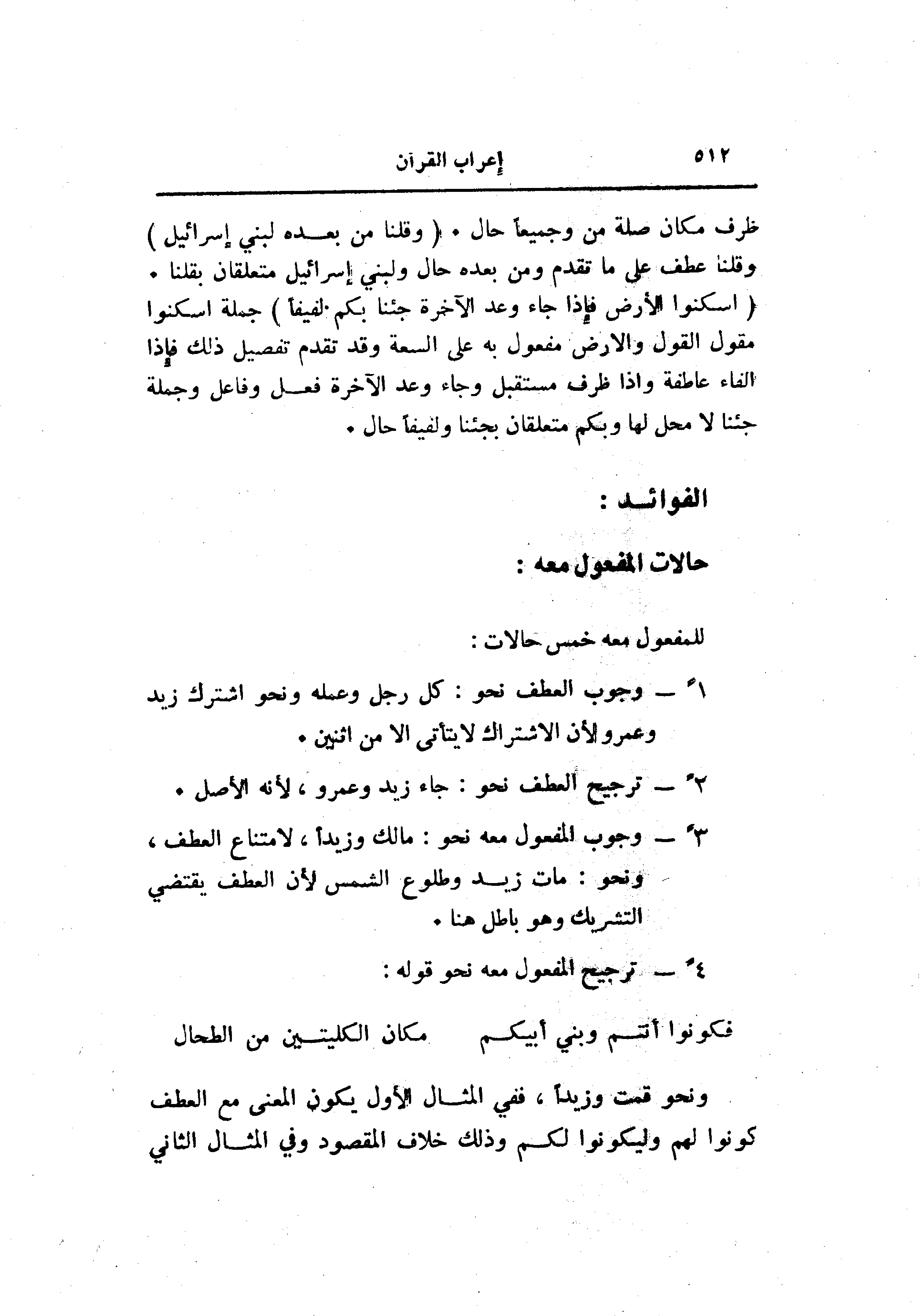 3- وجوب المفعول معه نحو: مالك وزيدا، لامتناع العطف، ونحو: مات زيد وطلوع الشمس لأن العطف يقتضي التشريك وهو باطل هنا.