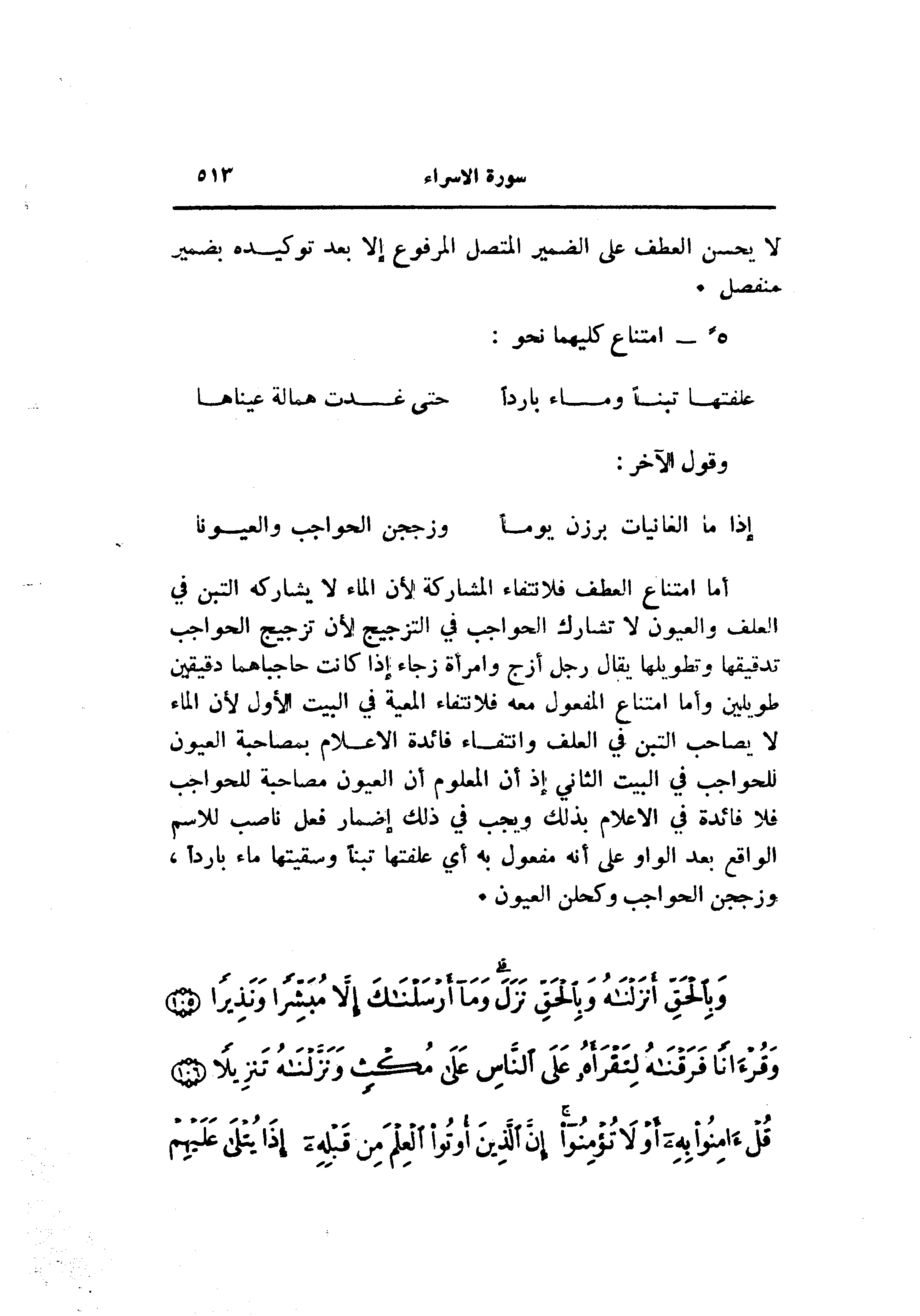 أما امتناع العطف فلانتفاء المشاركة لأن الماء لا يشاركه التبن في العلف والعيون لا تشارك الحواجب في التزجيج لأن تزجيج الحواجب تدقيقها وتطويلها يقال رجل أزج وامرأة زجاء إذا كانت حاجباهما دقيقين طويلين وأما امتناع المفعول معه فلانتفاء المعية في البيت الأول لأن الماء لا يصاحب التبن في العلف وانتفاء فائدة الاعلام بمصاحبة العيون للحواجب في البيت الثاني إذ أن المعلوم أن العيون مصاحبة للحواجب فلا فائدة في الاعلام بذلك ويجب في ذلك إضمار فعل ناصب للاسم الواقع بعد الواو على أنه مفعول به أي علفتها تبنا وسقيتها ماء باردا، وزججن الحواجب وكحلن العيون.