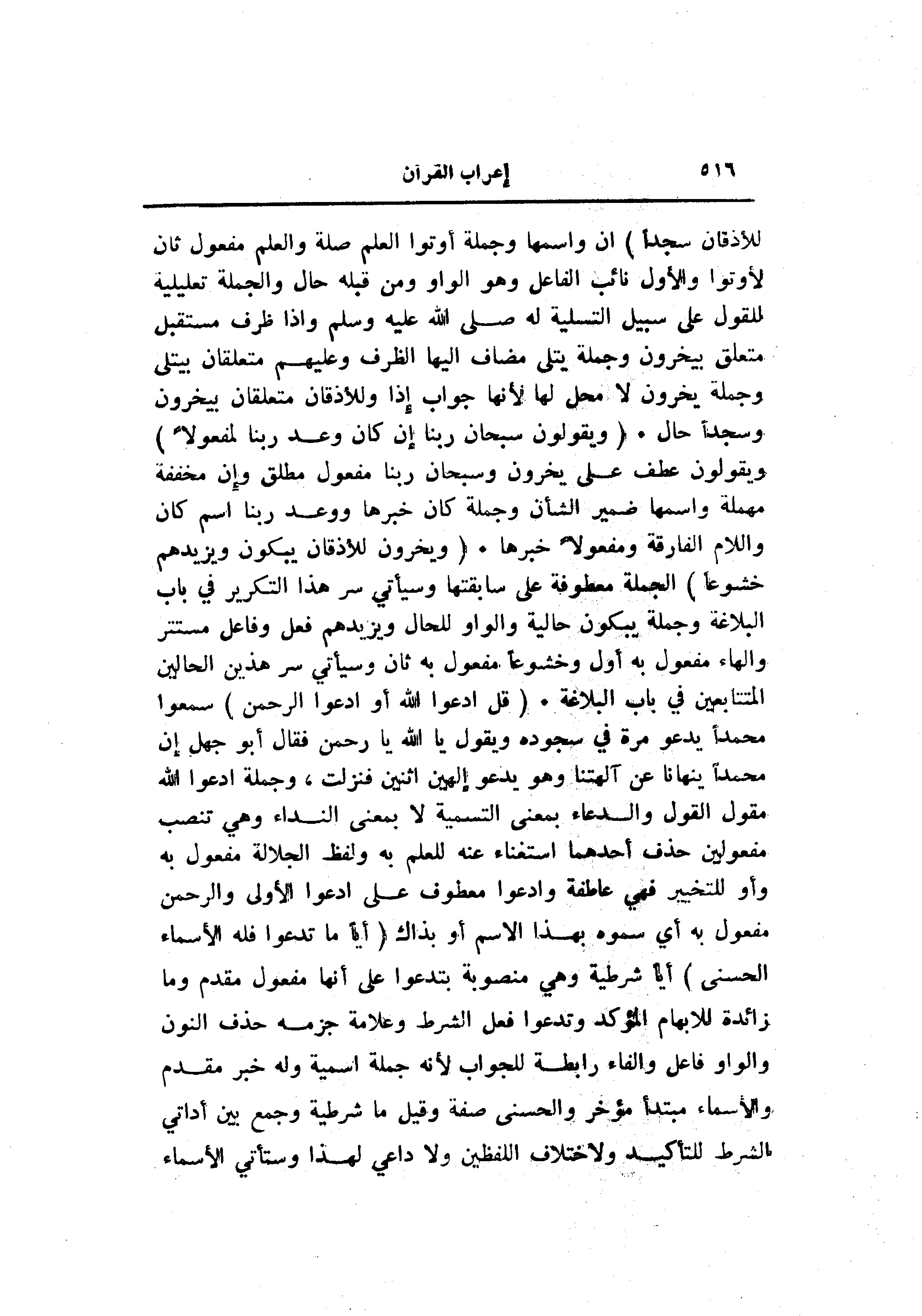 ان واسمها وجملة أوتوا العلم صلة والعلم مفعول ثان لأوتوا والأول نائب الفاعل وهو الواو ومن قبله حال والجملة تعليلية للقول على سبيل التسلية له صلى الله عليه وسلم وإذا ظرف مستقبل متعلق بيخرون وجملة يتلى مضاف إليها الظرف وعليهم متعلقان بيتلى وجملة يخرون لا محل لها لأنها جواب إذا وللأذقان متعلقان بيخرون وسجدا حال. (وَيَقُولُونَ سُبْحانَ رَبِّنا إِنْ كانَ وَعْدُ رَبِّنا لَمَفْعُولًا) ويقولون عطف على يخرون وسبحان ربنا مفعول مطلق وإن مخففة مهملة واسمها ضمير الشأن وجملة كان خبرها ووعد ربنا اسم كان واللام الفارقة ومفعولا خبرها. (وَيَخِرُّونَ لِلْأَذْقانِ يَبْكُونَ وَيَزِيدُهُمْ خُشُوعاً) الجملة معطوفة على سابقتها وسيأتي سر هذا التكرير في باب البلاغة وجملة يبكون حالية والواو للحال ويزيدهم فعل وفاعل مستتر والهاء مفعول به أول وخشوعا مفعول به ثان وسيأتي سر هذين الحالين المتتابعين في باب البلاغة. (قُلِ ادْعُوا اللَّهَ أَوِ ادْعُوا الرَّحْمنَ) سمعوا محمدا يدعو مرة في سجوده ويقول يا الله يا رحمن فقال أبو جهل إن محمدا ينهانا عن آلهتنا وهو يدعو إلهين اثنين فنزلت، وجملة ادعوا الله مقول القول والدعاء بمعنى التسمية لا بمعنى النداء وهي تنصب مفعولين حذف أحدهما استغناء عنه للعلم به ولفظ الجلالة مفعول به وأو للتخيير فهي عاطفة وادعوا معطوف على ادعوا الأولى والرحمن مفعول به أي سموه بهذا الاسم أو بذاك (أَيًّا ما تَدْعُوا فَلَهُ الْأَسْماءُ الْحُسْنى) أيا شرطية وهي منصوبة بتدعوا على أنها مفعول مقدم وما زائدة للابهام المؤكد وتدعوا فعل الشرط وعلامة جزمه حذف النون والواو فاعل والفاء رابطة للجواب لأنه جملة اسمية وله خبر مقدم والأسماء مبتدأ مؤخر والحسنى صفة وقيل ما شرطية وجمع بين أداتي الشرط للتأكيد ولاختلاف اللفظين ولا داعي لهذا وستأتي الأسماء
