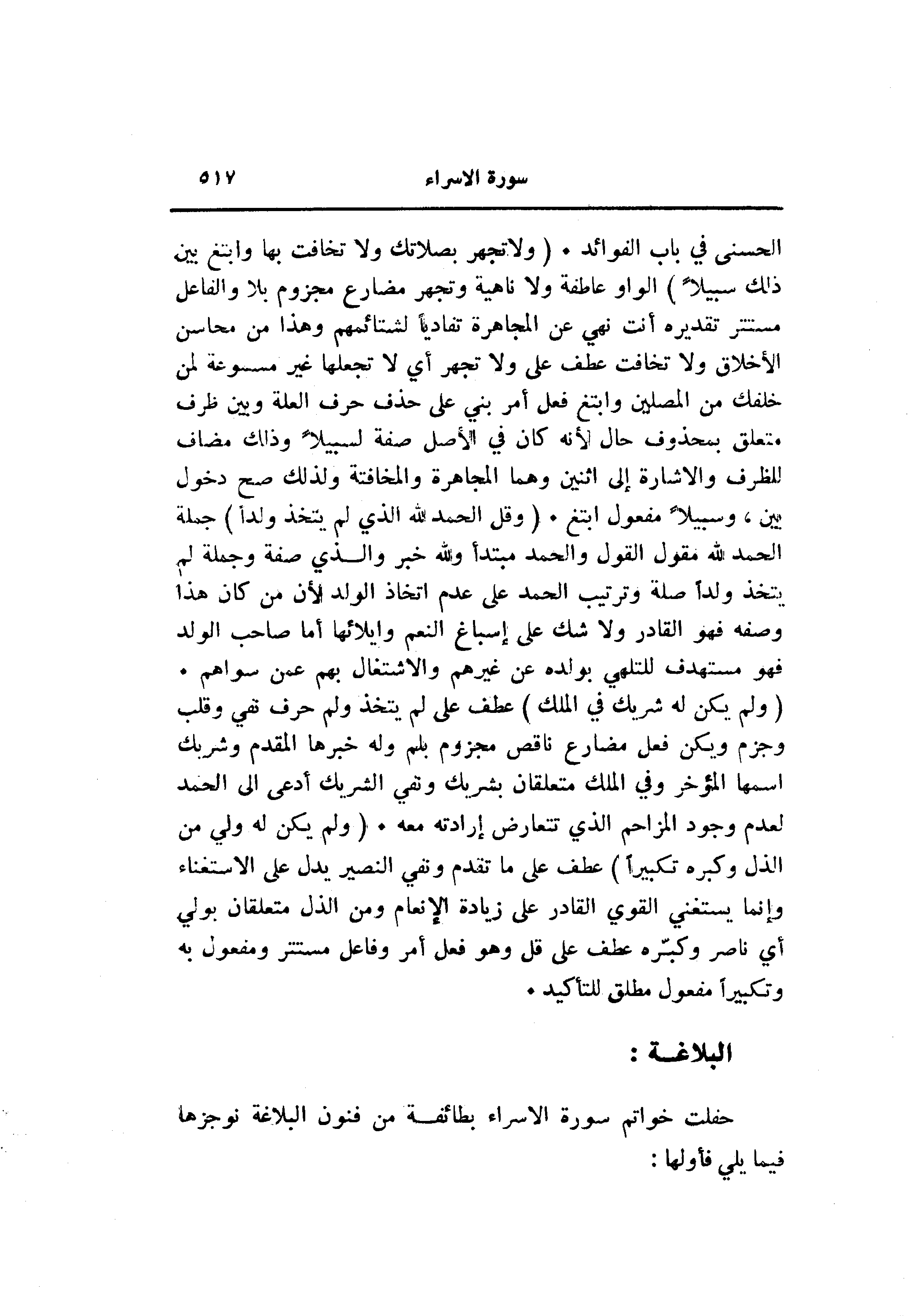 الحسنى في باب الفوائد. (وَلا تَجْهَرْ بِصَلاتِكَ وَلا تُخافِتْ بِها وَابْتَغِ بَيْنَ ذلِكَ سَبِيلًا) الواو عاطفة ولا ناهية وتجهر مضارع مجزوم بلا والفاعل مستتر تقديره أنت نهي عن المجاهرة تفاديا لشتائمهم وهذا من محاسن الأخلاق ولا تخافت عطف على ولا تجهر أي لا تجعلها غير مسموعة لمن خلفك من المصلين وابتغ فعل أمر بني على حذف حرف العلة وبين ظرف متعلق بمحذوف حال لأنه كان في الأصل صفة لسبيلا وذلك مضاف للظرف والاشارة إلى اثنين وهما المجاهرة والمخافتة ولذلك صح دخول بين، وسبيلا مفعول ابتغ. (وَقُلِ الْحَمْدُ لِلَّهِ الَّذِي لَمْ يَتَّخِذْ وَلَداً) جملة الحمد لله مقول القول والحمد مبتدأ ولله خبر والذي صفة وجملة لم يتخذ ولدا صلة وترتيب الحمد على عدم اتخاذ الولد لأن من كان هذا وصفه فهو القادر ولا شك على إسباغ النعم وايلائها أما صاحب الولد فهو مستهدف للتلهي بولده عن غيرهم والاشتغال بهم عمن سواهم.