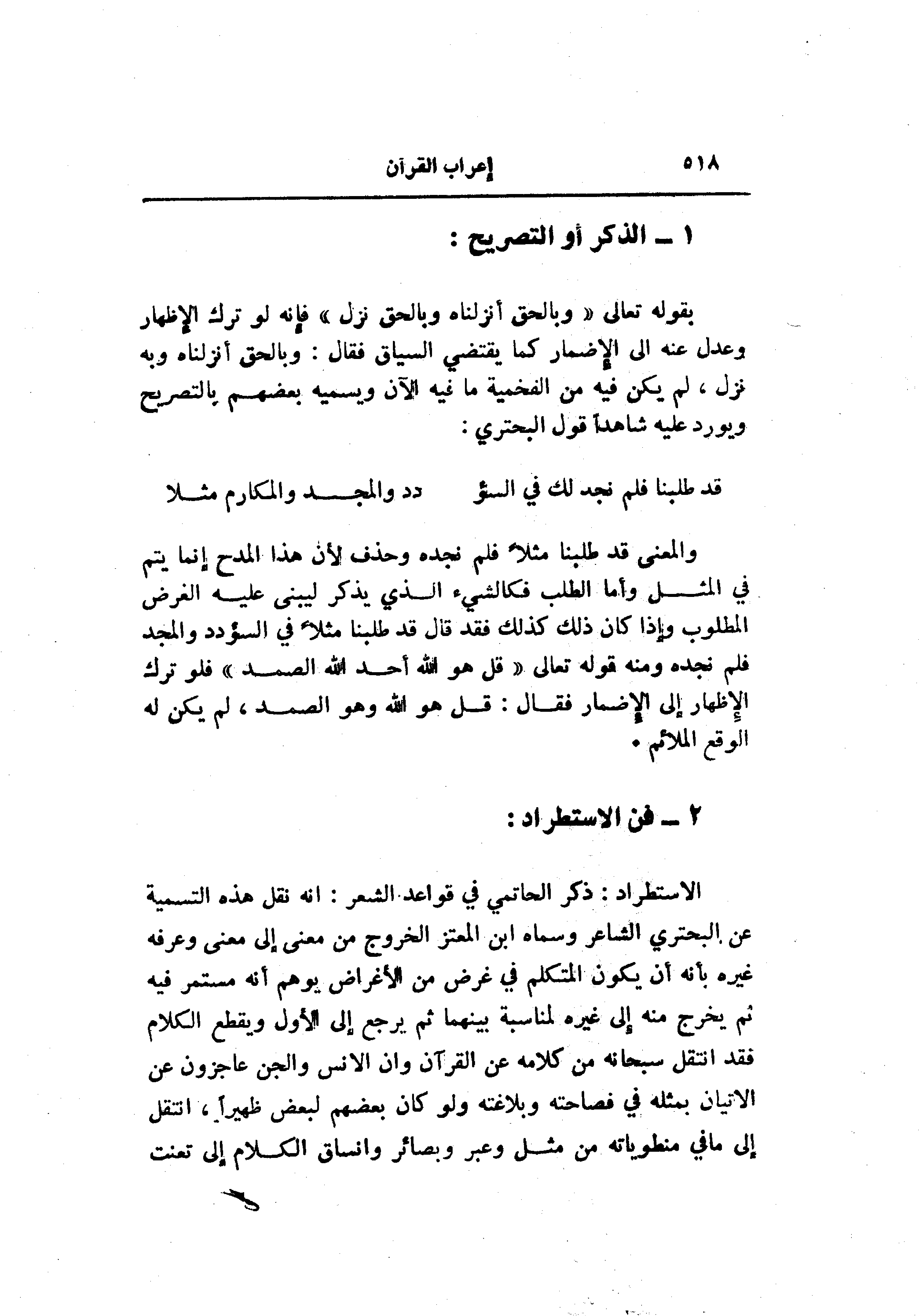 بقوله تعالى «وبالحق أنزلناه وبالحق نزل» فإنه لو ترك الإظهار وعدل عنه الى الإضمار كما يقتضي السياق فقال: وبالحق أنزلناه وبه نزل، لم يكن فيه من الفخمية ما فيه الآن ويسميه بعضهم بالتصريح ويورد عليه شاهدا قول البحتري: