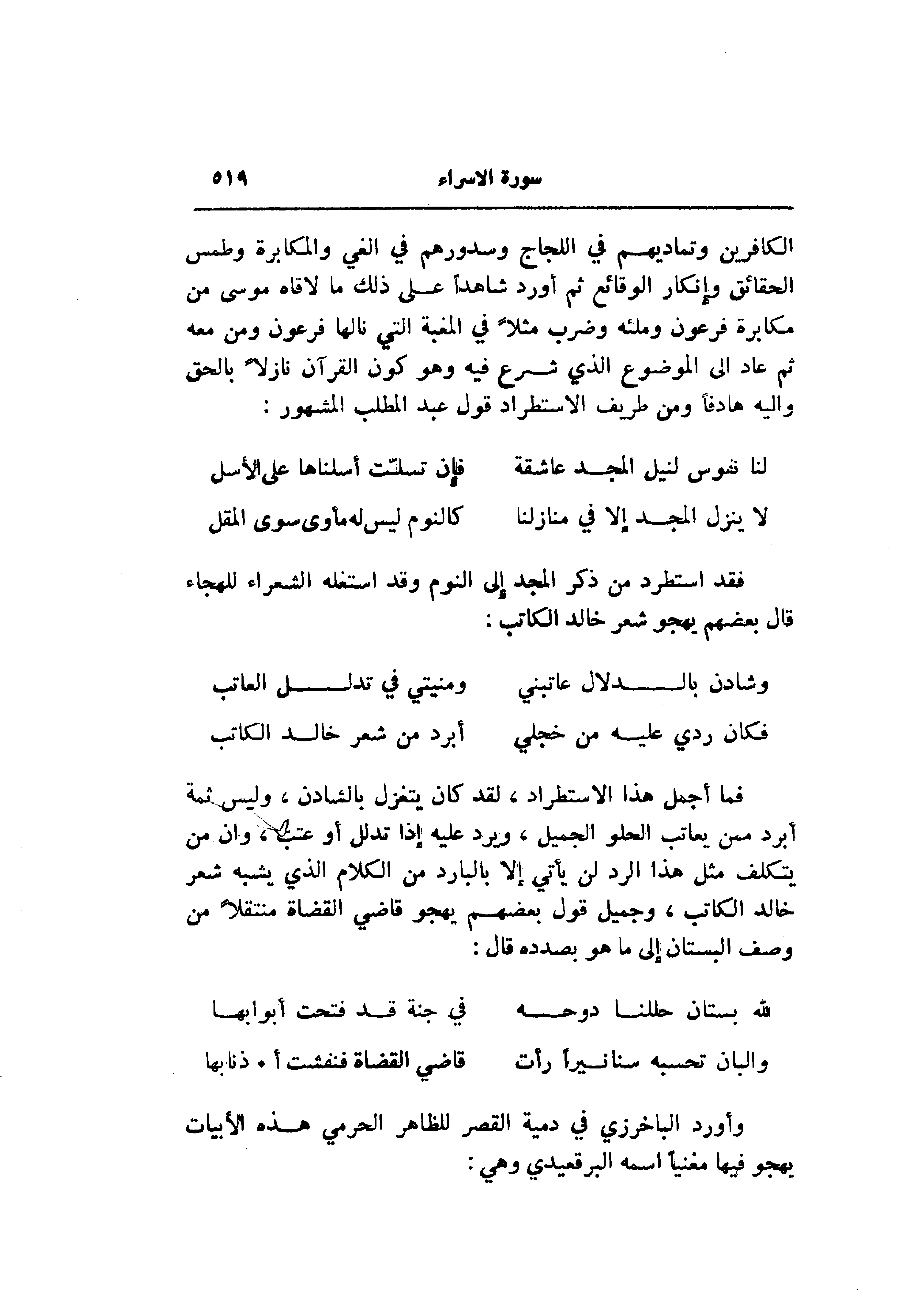 الكافرين وتماديهم في اللجاج وسدورهم في الغي والمكابرة وطمس الحقائق وإنكار الوقائع ثم أورد شاهدا على ذلك ما لاقاه موسى من مكابرة فرعون وملئه وضرب مثلا في المغبة التي نالها فرعون ومن معه ثم عاد الى الموضوع الذي شرع فيه وهو كون القرآن نازلا بالحق واليه هادفا ومن طريف الاستطراد قول عبد المطلب المشهور: