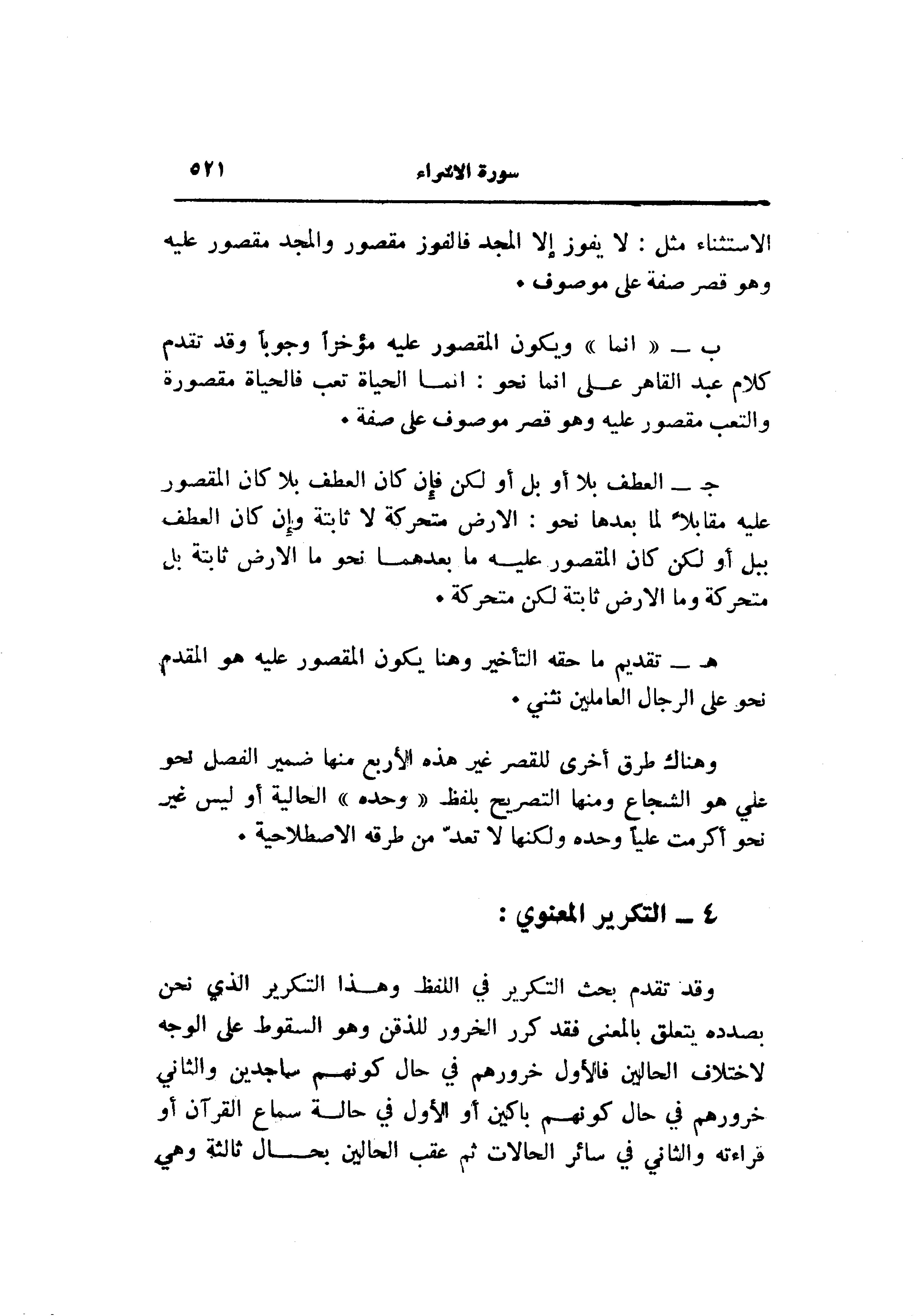ج- العطف بلا أو بل أو لكن فإن كان العطف بلا كان المقصور عليه مقابلا لما بعدها نحو: الأرض متحركة لا ثابتة وإن كان العطف ببل أو لكن كان المقصور عليه ما بعدهما نحو ما الأرض ثابتة بل متحركة وما الأرض ثابتة لكن متحركة.