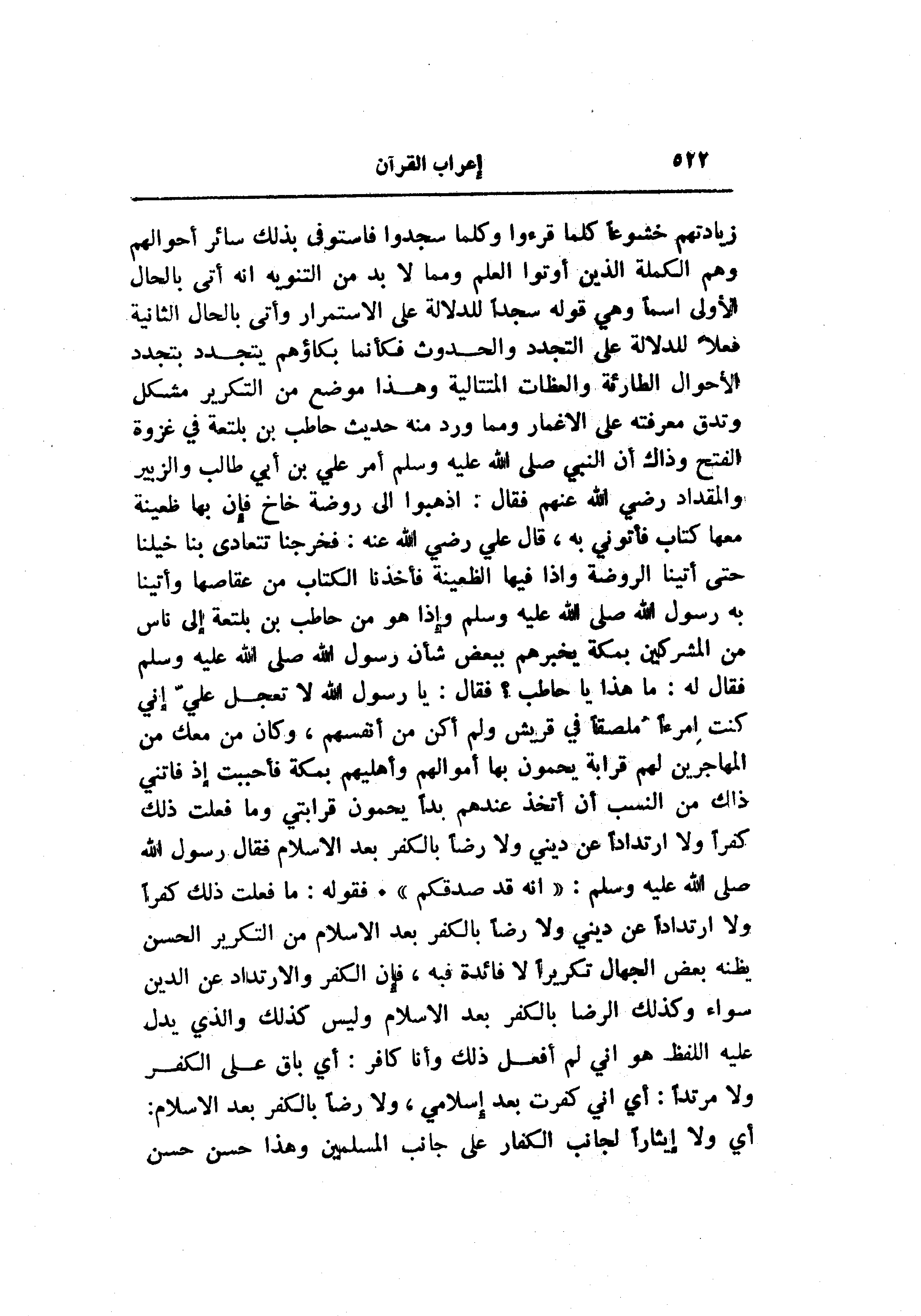 زيادتهم خشوعا كلما قرءوا وكلما سجدوا فاستوفى بذلك سائر أحوالهم وهم الكملة الذين أوتوا العلم ومما لا بد من التنويه انه أتى بالحال الأولى اسما وهي قوله سجدا للدلالة على الاستمرار وأتى بالحال الثانية فعلا للدلالة على التجدد والحدوث فكأنما بكاؤهم يتجدد بتجدد الأحوال الطارئة والعظات المتتالية وهذا موضع من التكرير مشكل وتدق معرفته على الأغمار ومما ورد منه حديث حاطب بن بلتعة في غزوة الفتح وذاك أن النبي صلى الله عليه وسلم أمر علي بن أبي طالب والزبير والمقداد رضي الله عنهم فقال: اذهبوا الى روضة خاخ فإن بها ظعينة معها كتاب فأتوني به، قال علي رضي الله عنه: فخرجنا تتعادى بنا خيلنا حتى أتينا الروضة وإذا فيها الظعينة فأخذنا الكتاب من عقاصها وأتينا به رسول الله صلى الله عليه وسلم وإذا هو من حاطب بن بلتعة إلى ناس من المشركين بمكة يخبرهم ببعض شأن رسول الله صلى الله عليه وسلم فقال له: ما هذا يا حاطب؟ فقال: يا رسول الله لا تعجل عليّ إني كنت امرأ ملصقا في قريش ولم أكن من أنفسهم، وكان من معك من المهاجرين لهم قرابة يحمون بها أموالهم وأهليهم بمكة فأحببت إذ فاتني ذلك من النسب أن أتخذ عندهم بدا يحمون قرابتي وما فعلت ذلك كفرا ولا ارتدادا عن ديني ولا رضا بالكفر بعد الإسلام فقال رسول الله صلى الله عليه وسلم: «انه قد صدقكم» . فقوله: ما فعلت ذلك كفرا ولا ارتدادا عن ديني ولا رضا بالكفر بعد الإسلام من التكرير الحسن يظنه بعض الجهال تكريرا لا فائدة فبه، فإن الكفر والارتداد عن الدين سواء وكذلك الرضا بالكفر بعد الإسلام وليس كذلك والذي يدل عليه اللفظ هو اني لم أفعل ذلك وأنا كافر: أي باق على الكفر ولا مرتدا: أي اني كفرت بعد إسلامي، ولا رضا بالكفر بعد الإسلام: